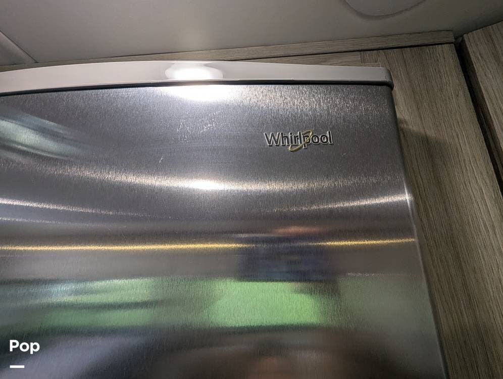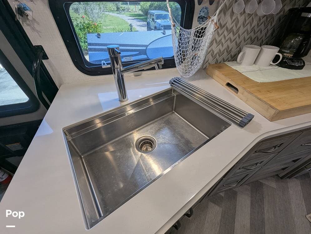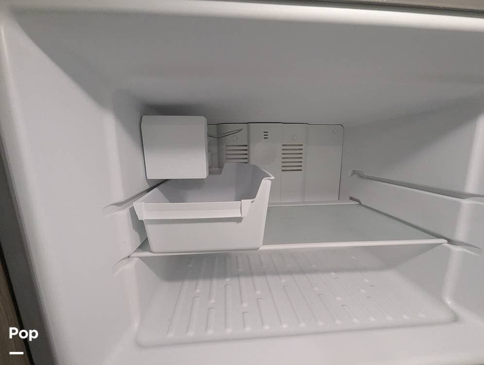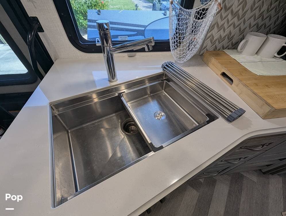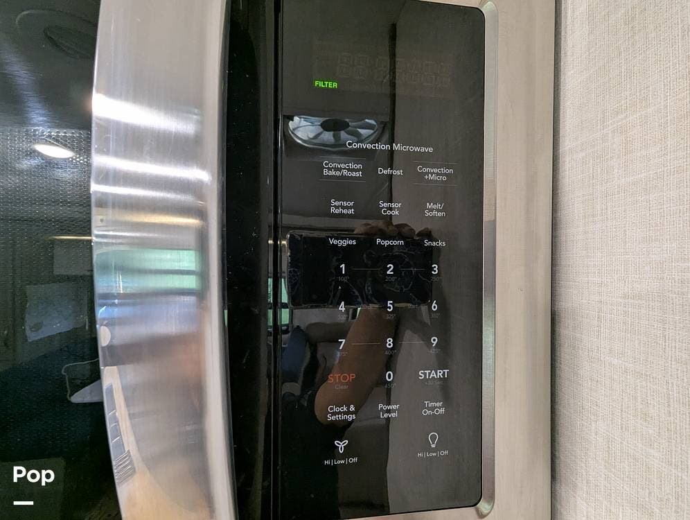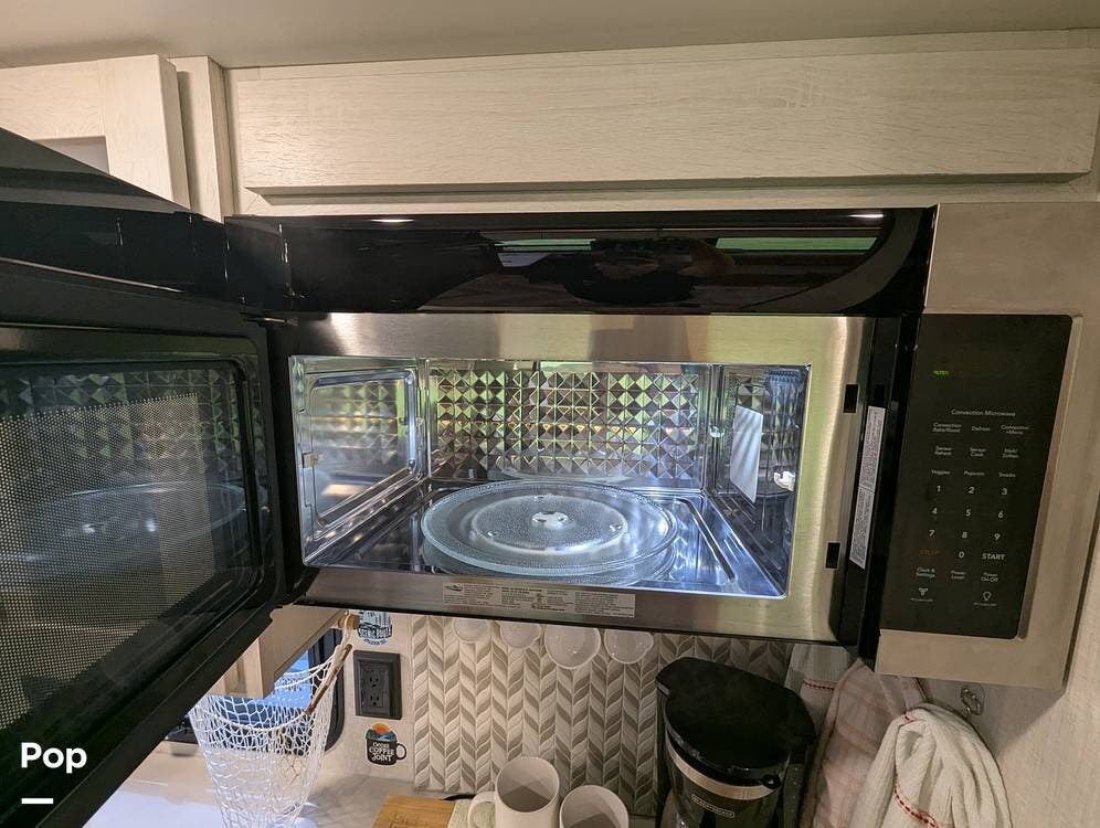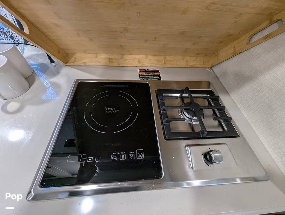 This Anniversary edition is bright and airy inside with all the amenities you need for comfort and convenience. The galley is appointed nicley with Corian countertops, a convection microwave a single gas burner, an induction cooktop, and a residential refrigerator.