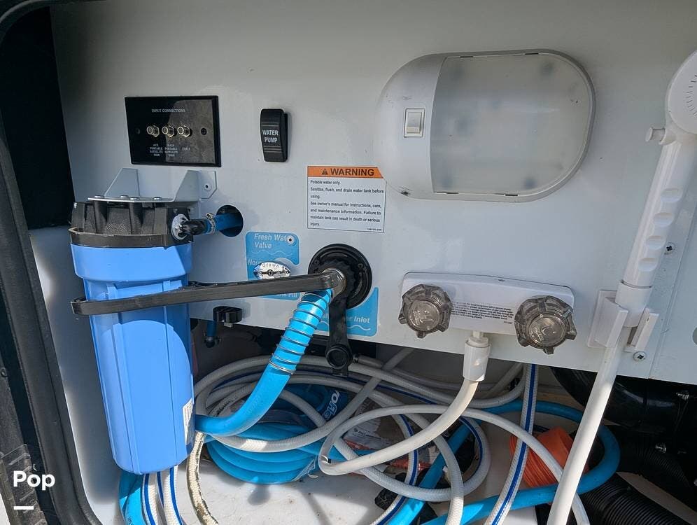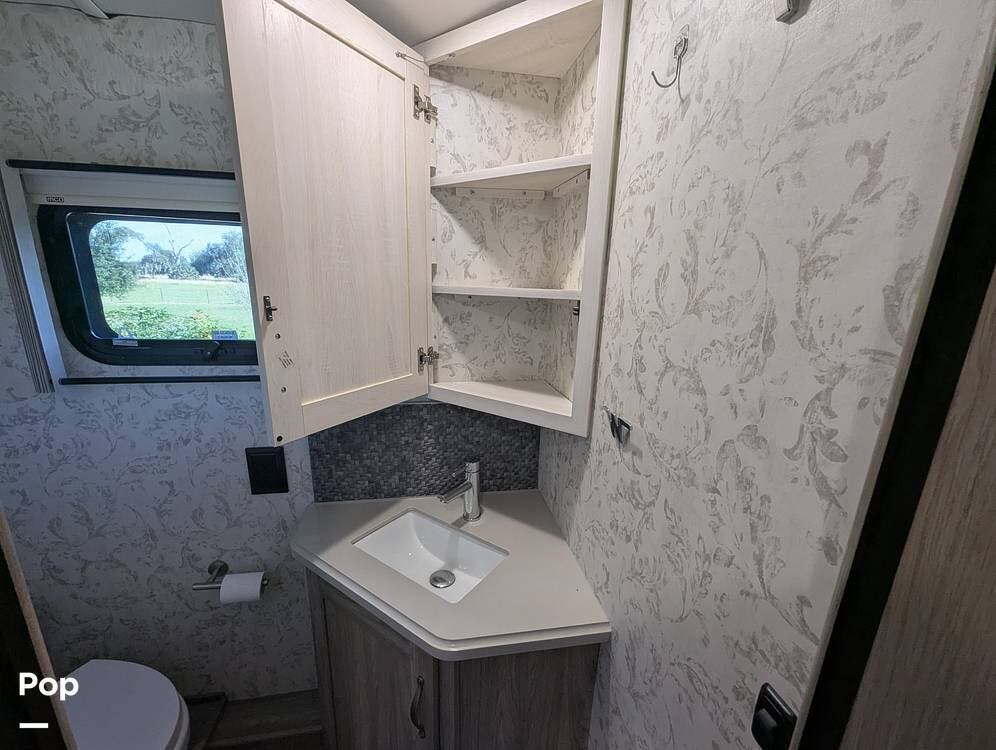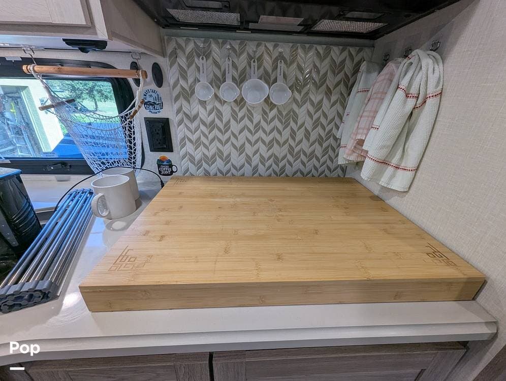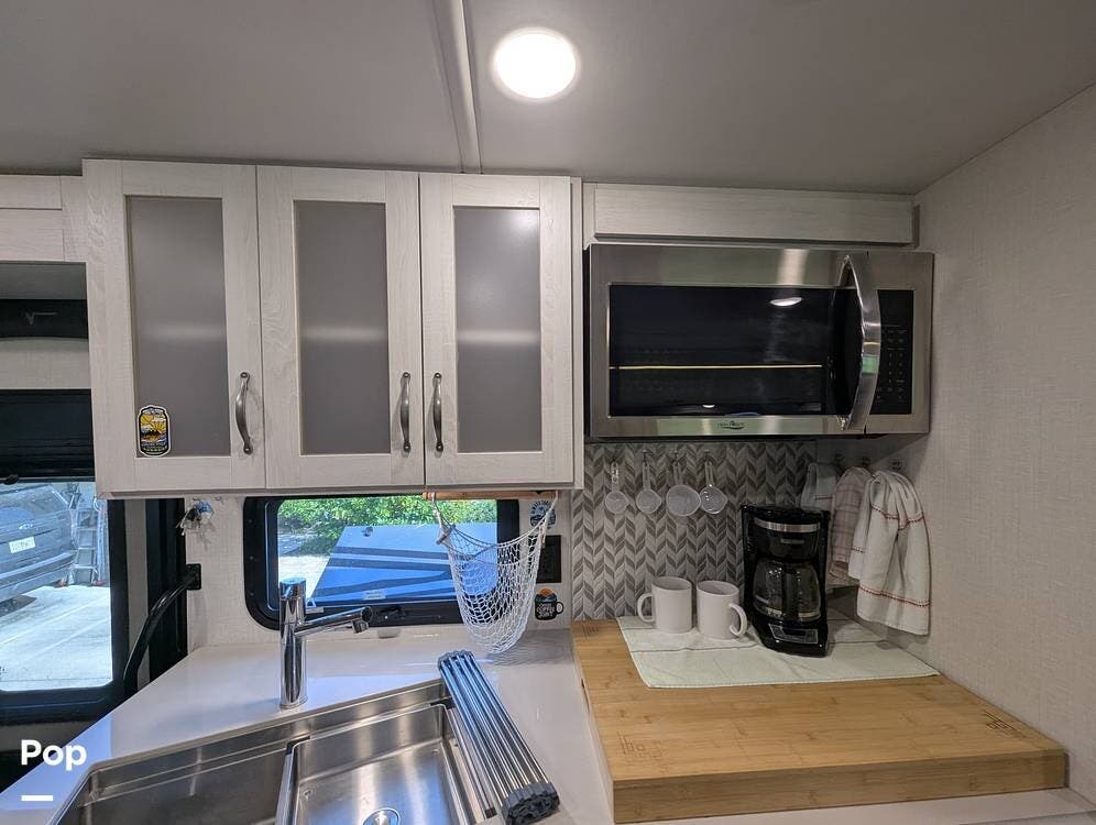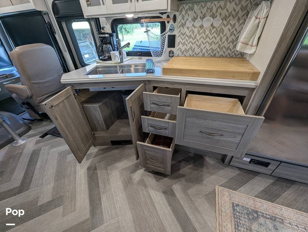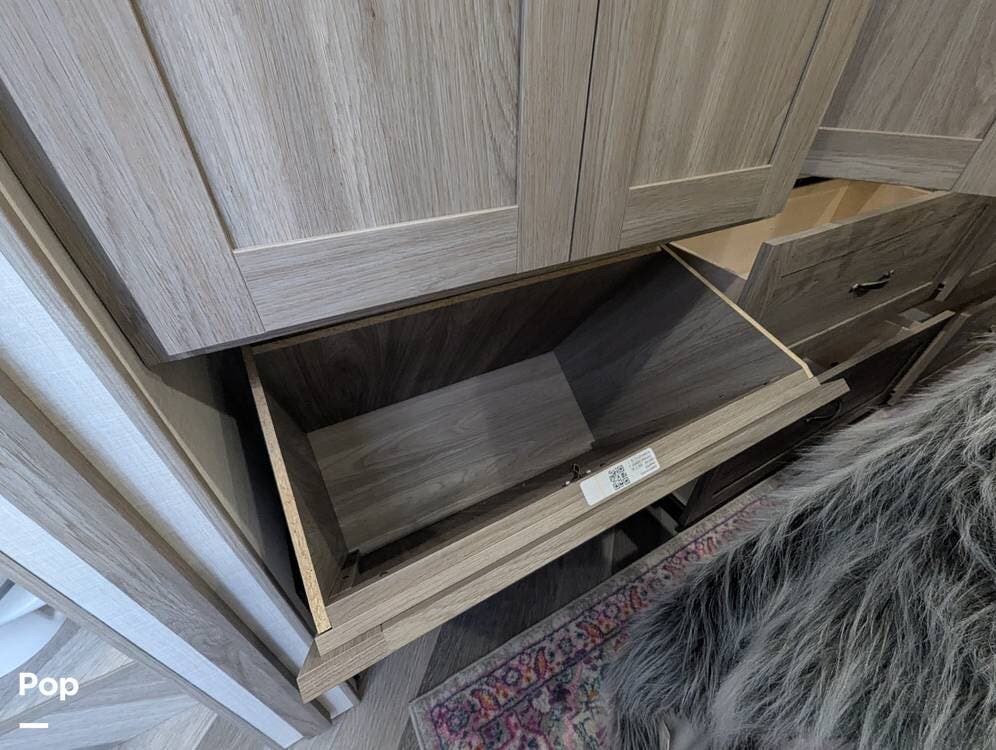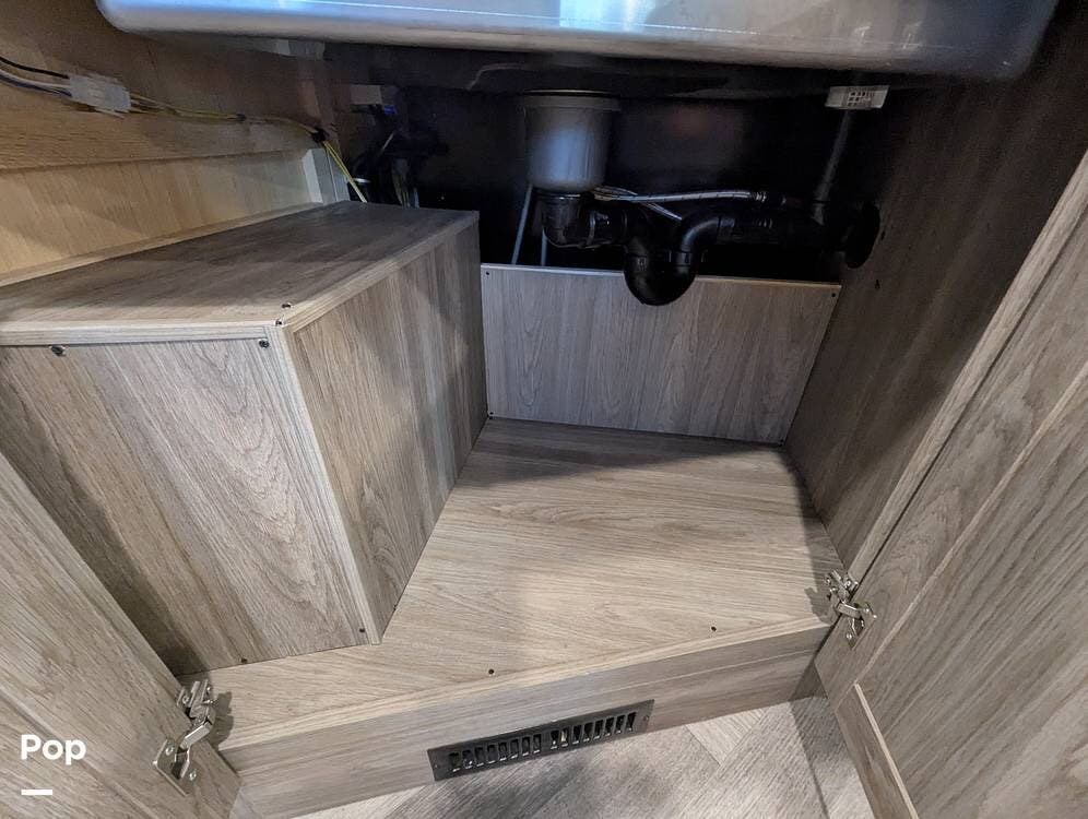 This Anniversary edition is bright and airy inside with all the amenities you need for comfort and convenience. The galley is appointed nicley with Corian countertops, a convection microwave a single gas burner, an induction cooktop, and a residential refrigerator.