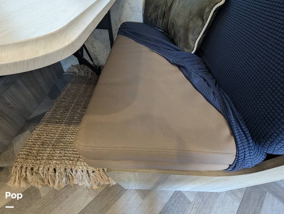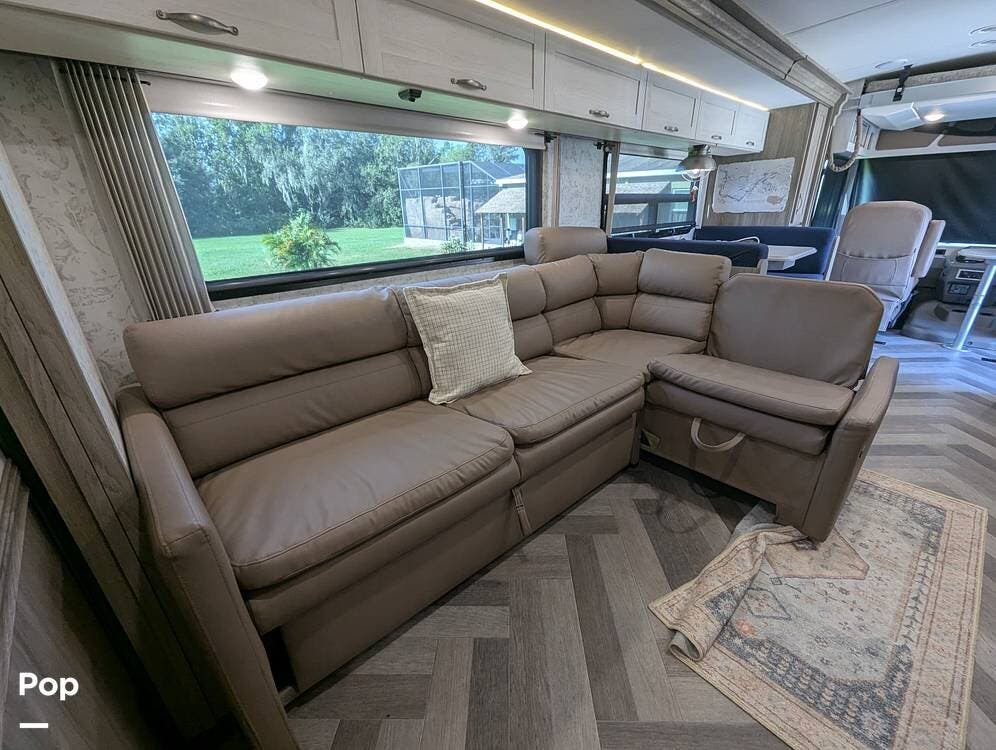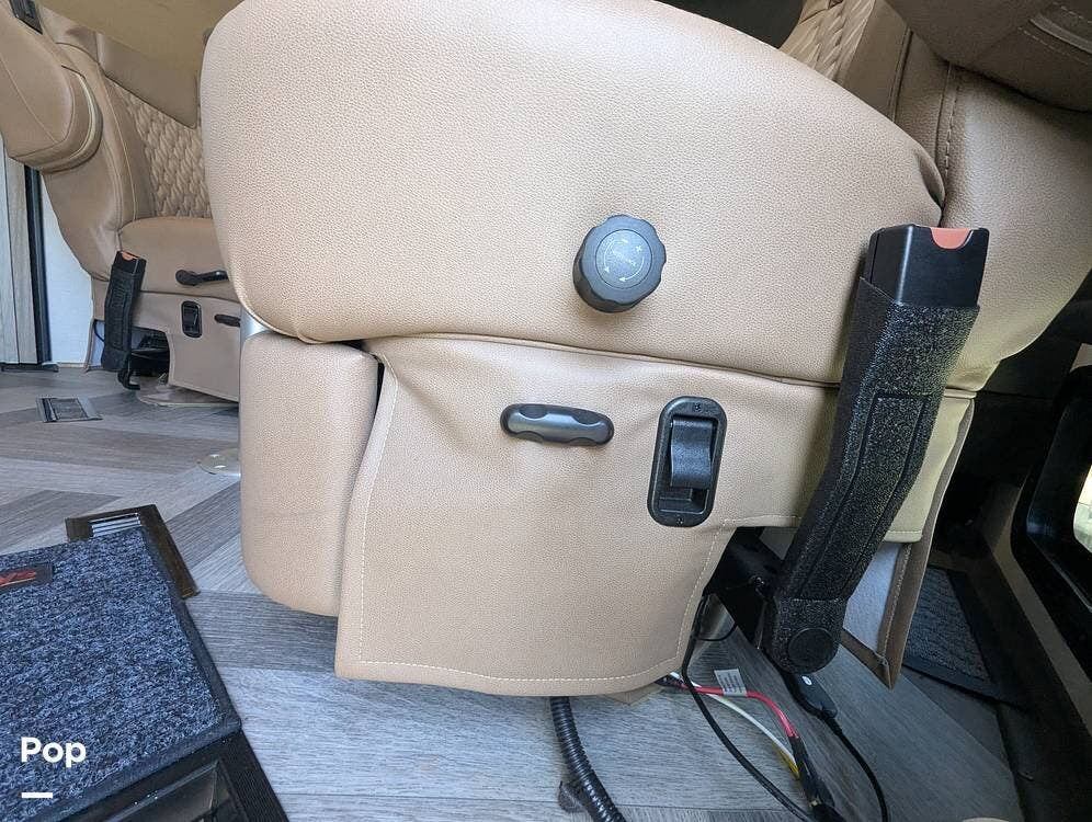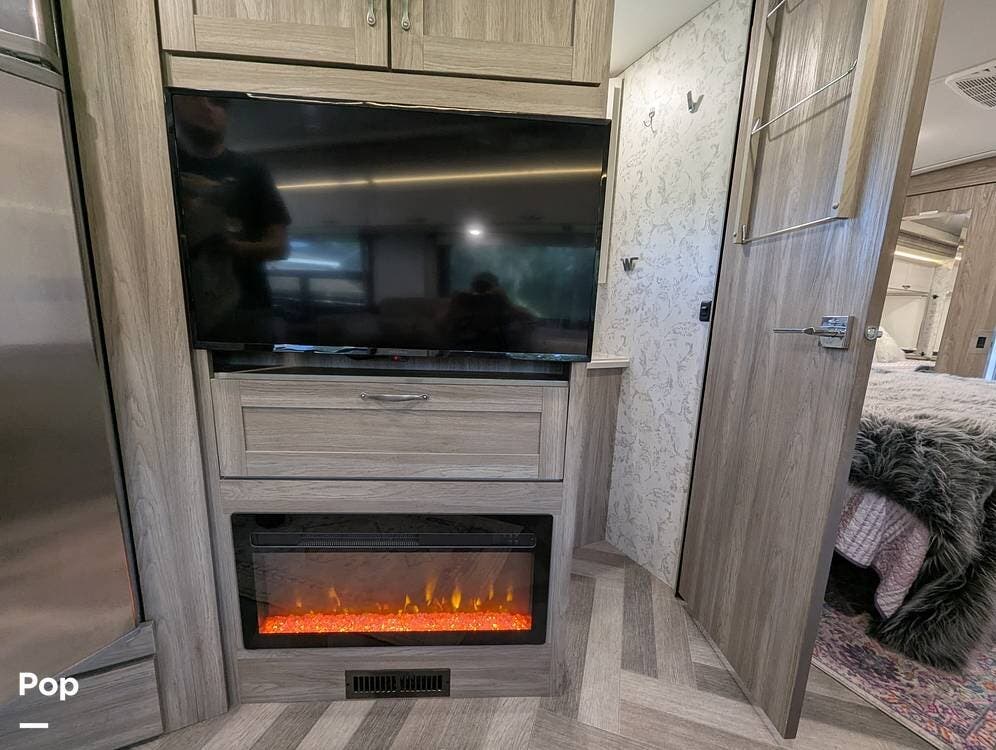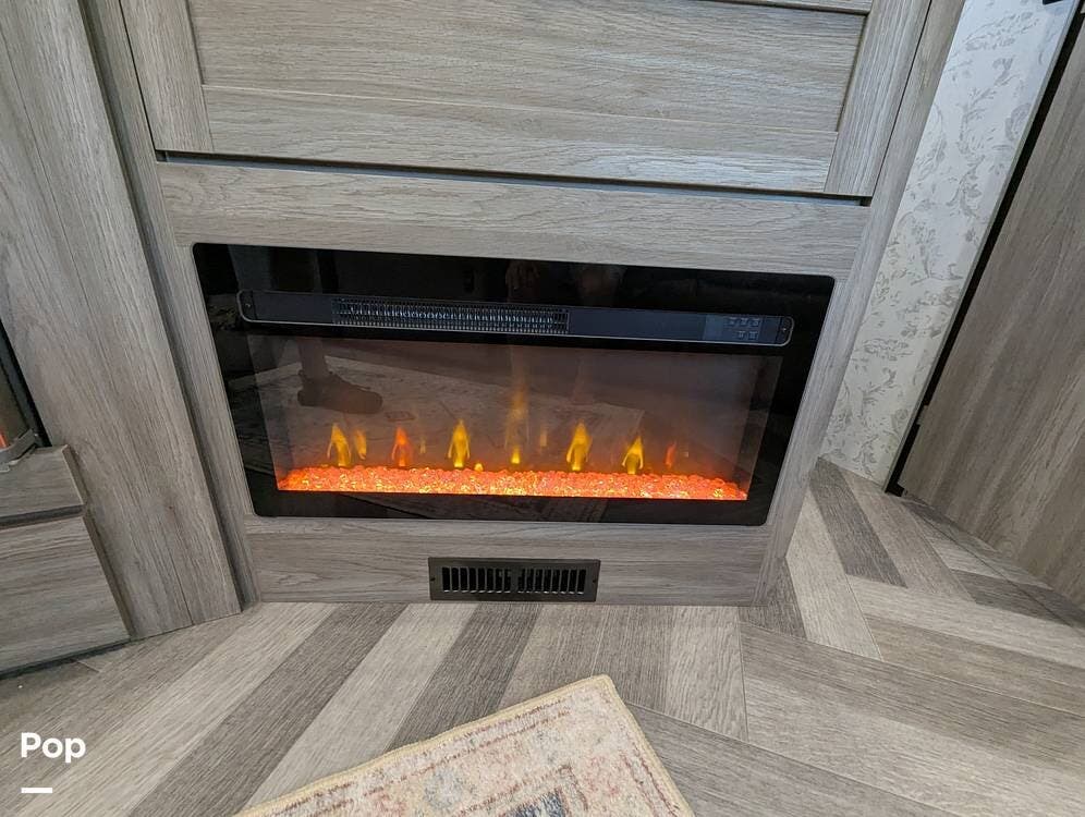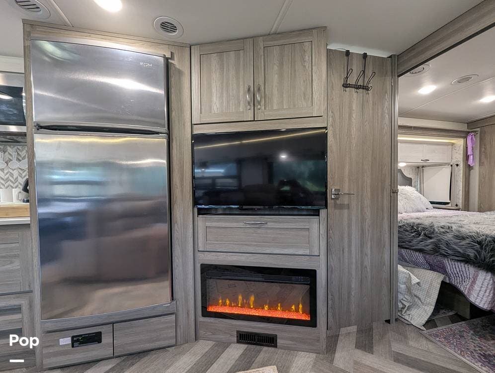 The living room has a convertible chaise lounge couch in front of the flatscreen TV and fireplace! The driver and passenger seats swivel to the rear for extra seating. There is a bath and a half for convenience.