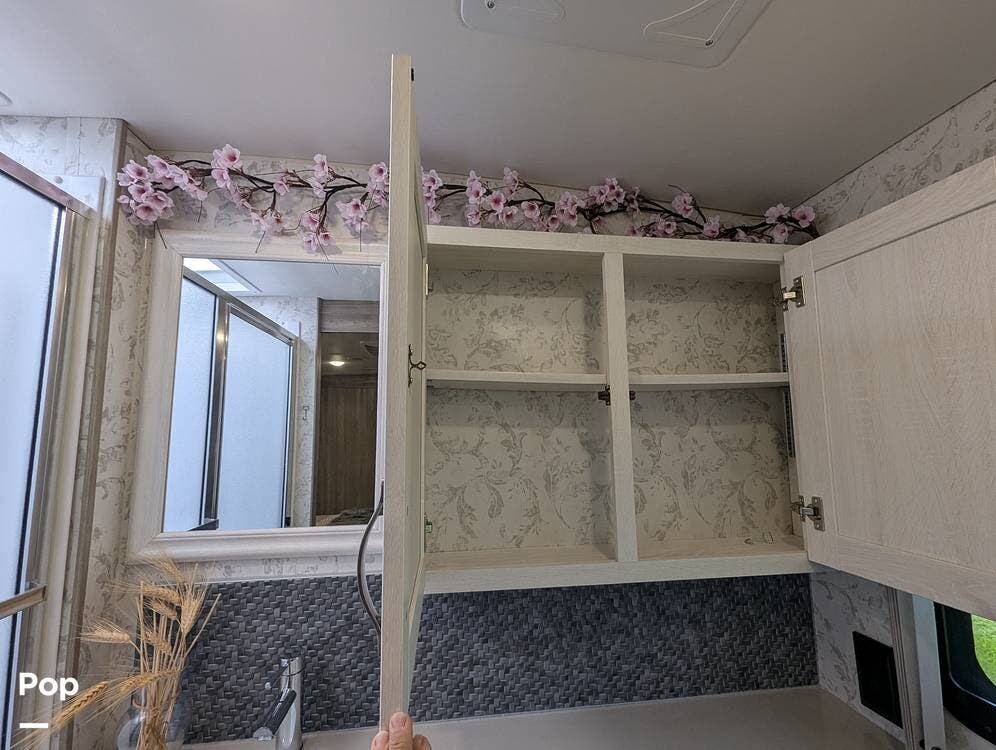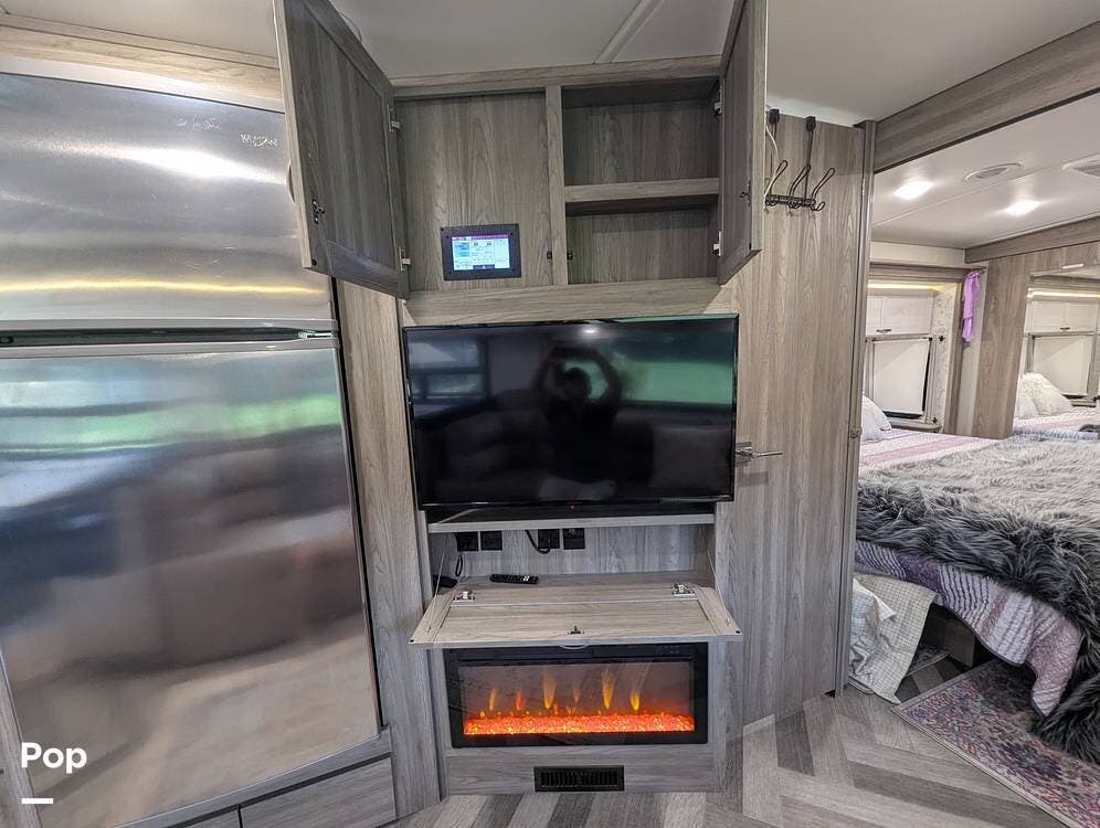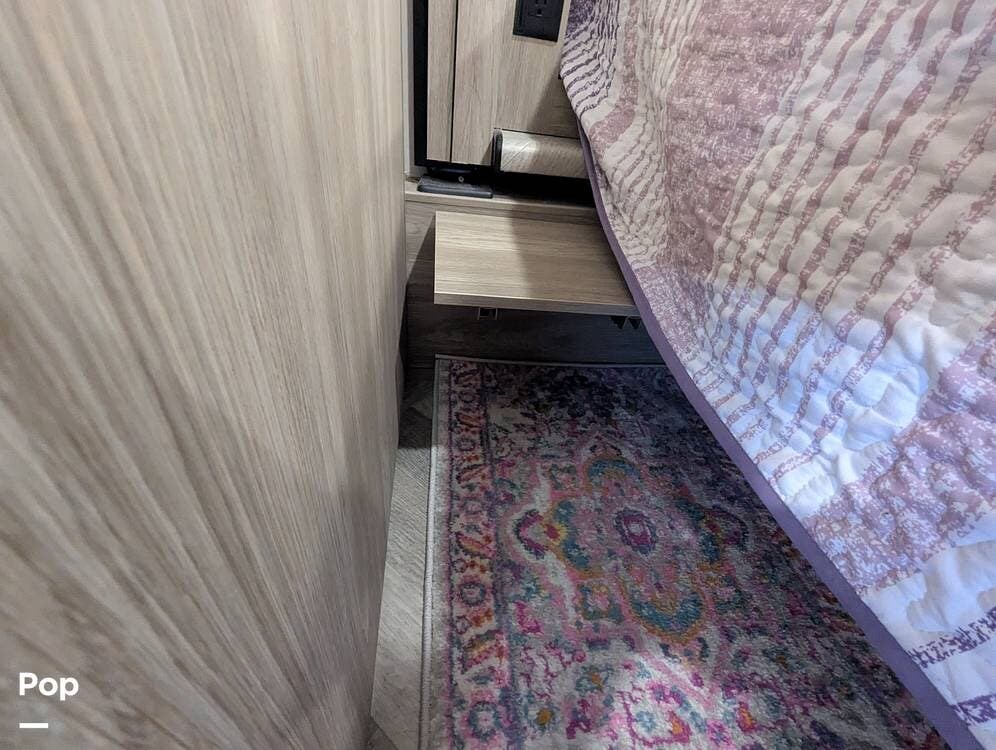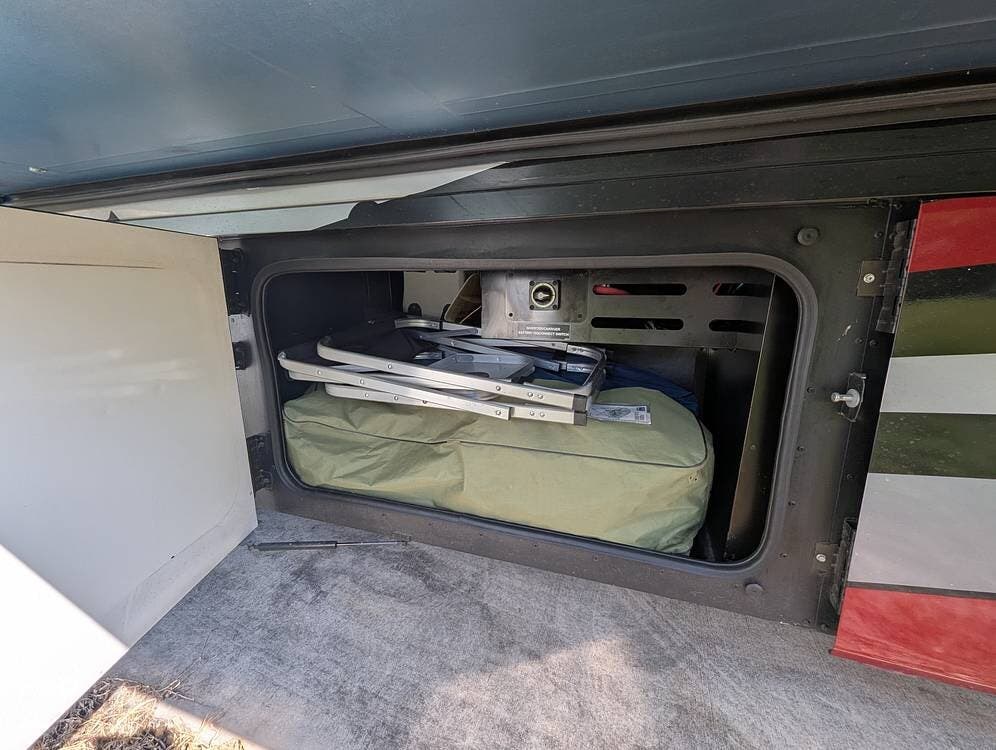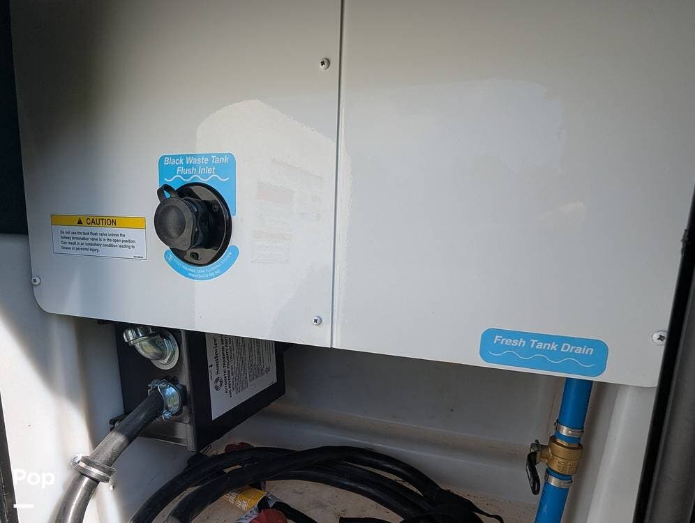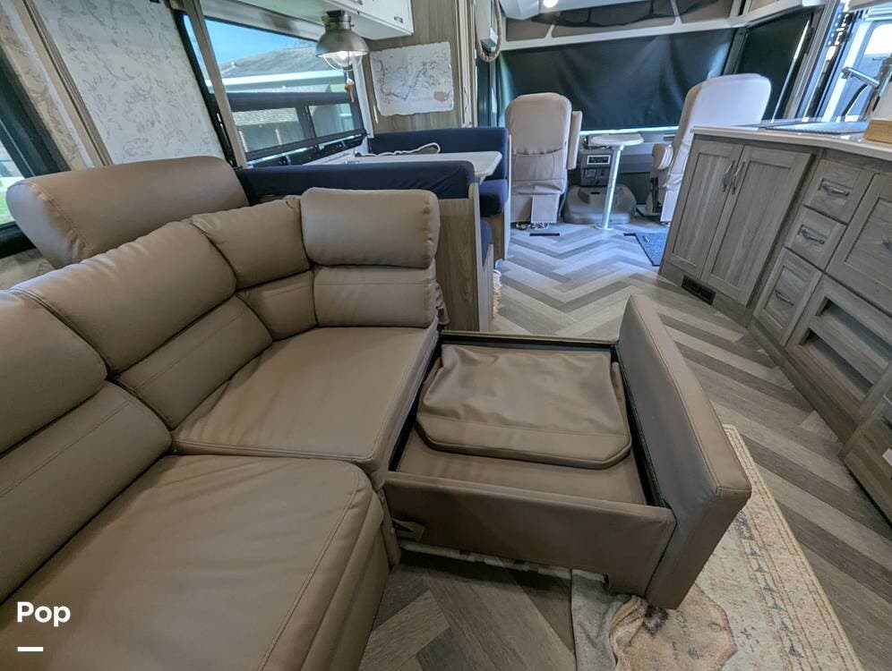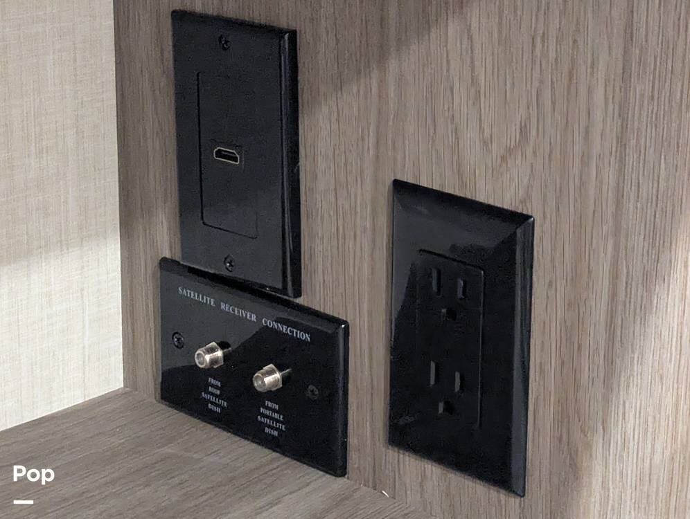 The living room has a convertible chaise lounge couch in front of the flatscreen TV and fireplace! The driver and passenger seats swivel to the rear for extra seating. There is a bath and a half for convenience.
