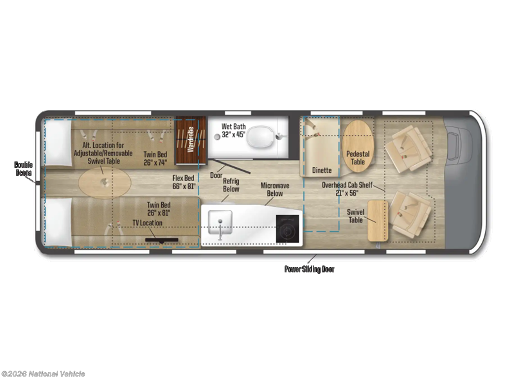 The dinette can be converted to a sleeping surface, and the rear twin bed flex bed system that measures 66" x 81" and provides additional sleeping space.