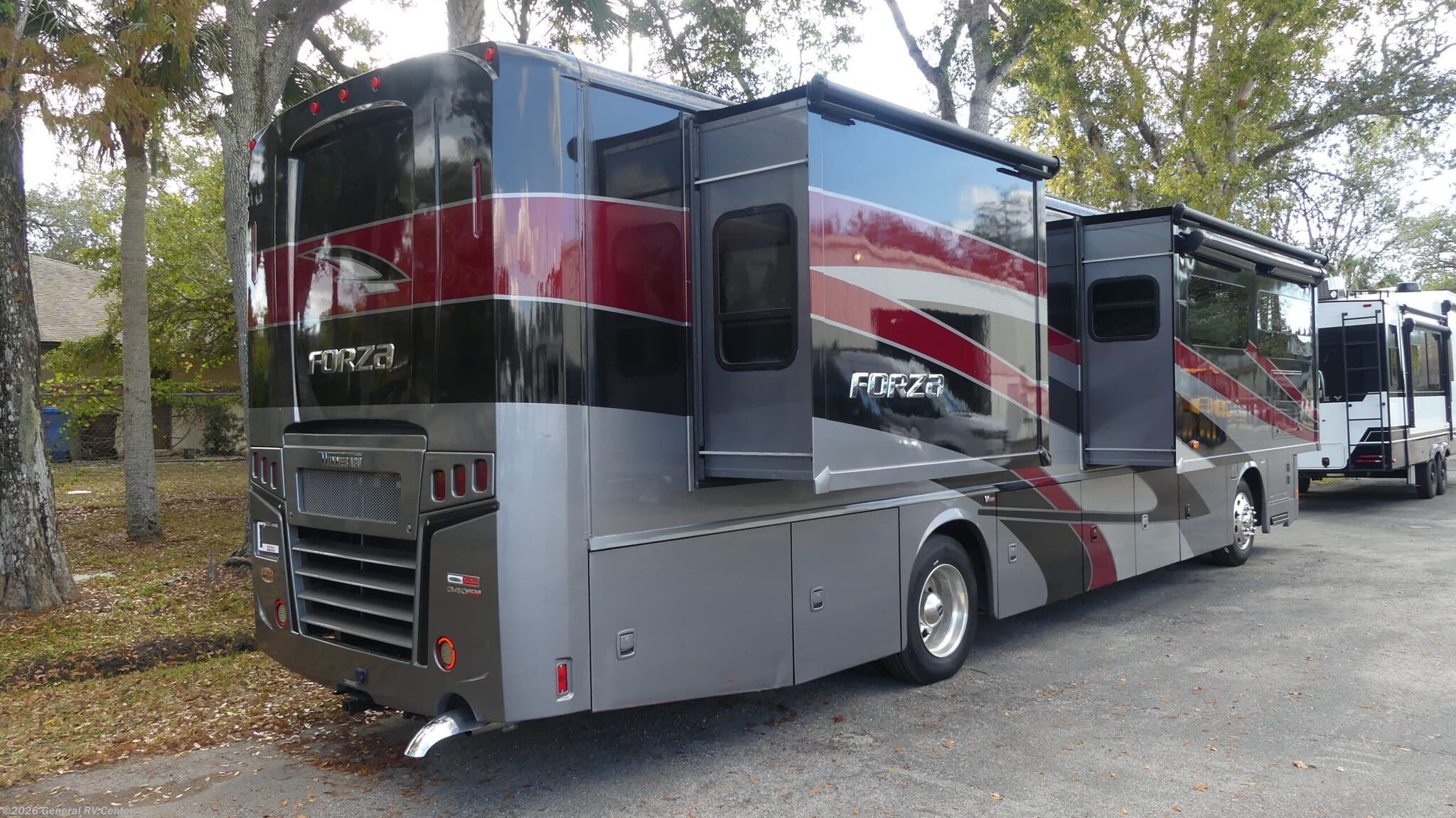 **Winnebago Forza Class A diesel motorhome 36H highlights:** * Triple Slides * Residential Refrigerator * TrueComfort+ Sofa * Walk-Around Queen Bed * Corian Countertops * Pull-Out Table You can have many adventures of all sorts with this Forza Class A diesel motorhome! There is so much interior living space because of the three large slides, and there is also great relaxation found with the swivel/reclining cab seats, the BenchMark dinette, and the TrueComfort+ sofa. The private bedroom has quite a bit of storage space with its chest of drawers and full-width wardrobe, and there is also a 40" HDTV and queen-size bed with nightstands on either side. The kitchen is going to be amazingly helpful with its residential refrigerator, convection microwave, flip-up countertop extension, and pantry, and you will also love having a full bathroom with a 38" x 30" shower with seat, a textured glass shower door, and a bath skylight. You can also choose the optional Studio Loft drop-down bed on this model if you are needing more sleeping space! There isn't a thing you won't love about the Winnebago Forza Class A diesel motorhome! These powerful and practical coaches have excellent quality in their construction, and the undercarriage lighting is quite stylish and impressive. You'll find NeWay air suspension with V-Ride, automatic hydraulic leveling jacks, a 10,000-LB hitch, and automatic entrance steps. Sitting in the cab will be enjoyable with the multi-adjustable swivel and recline seats, the radio/rearview monitor system with 9" LCD color touchscreen, the cellphone interface to radio, and the TRW® tilt/telescopic steering column with foot-actuated pedal. The interior has a Firefly switch panel that lights up when it's dark, and the 6,000W Cummins Onan generator is what you need to power your coach.