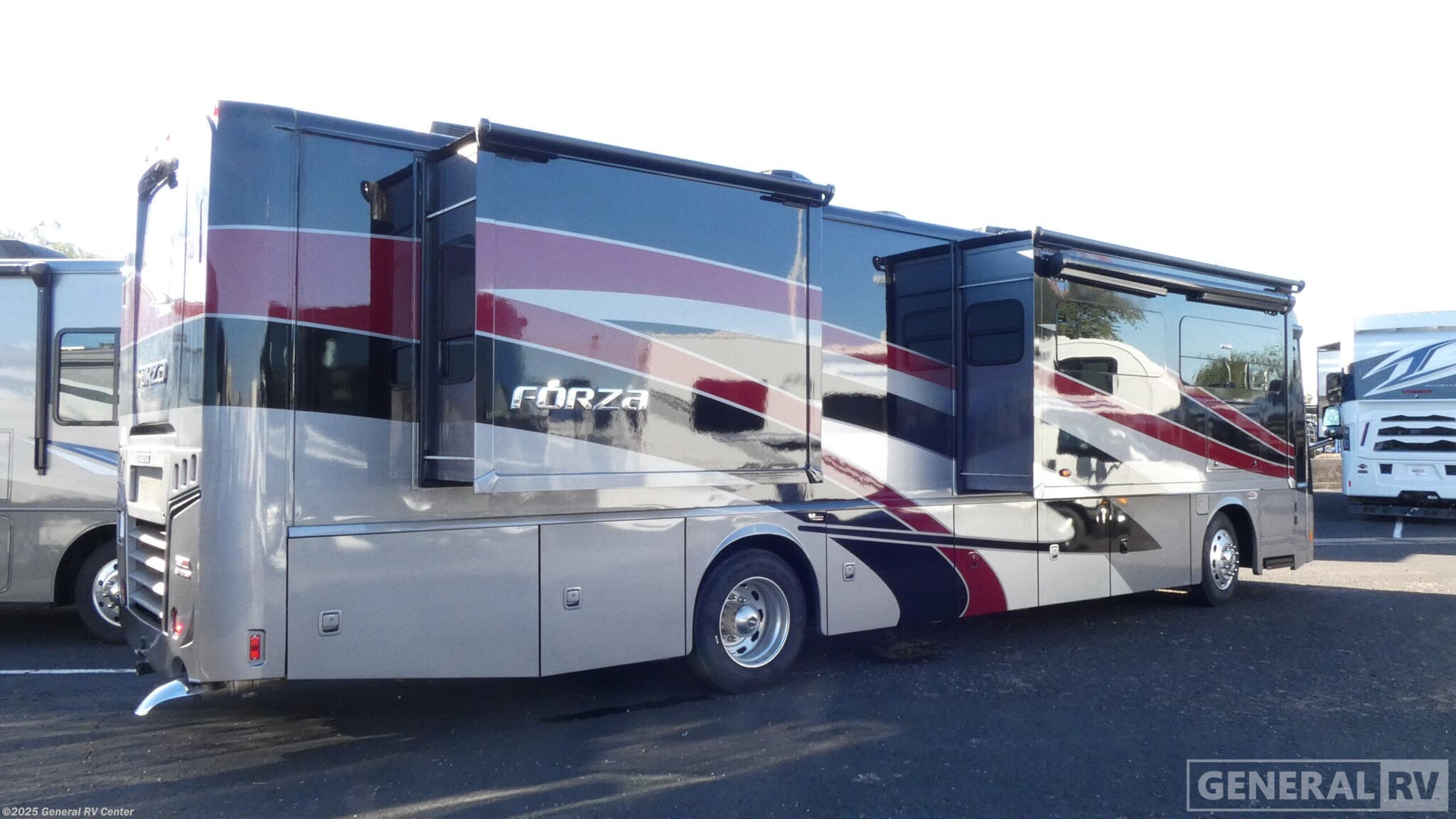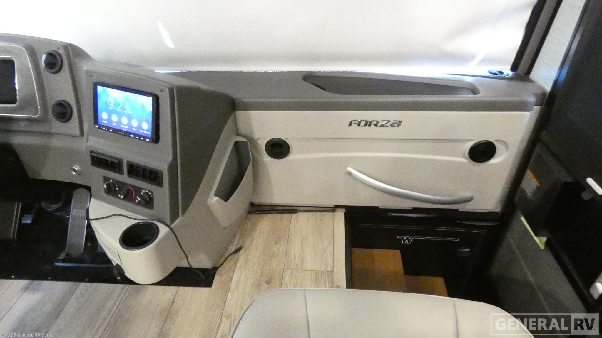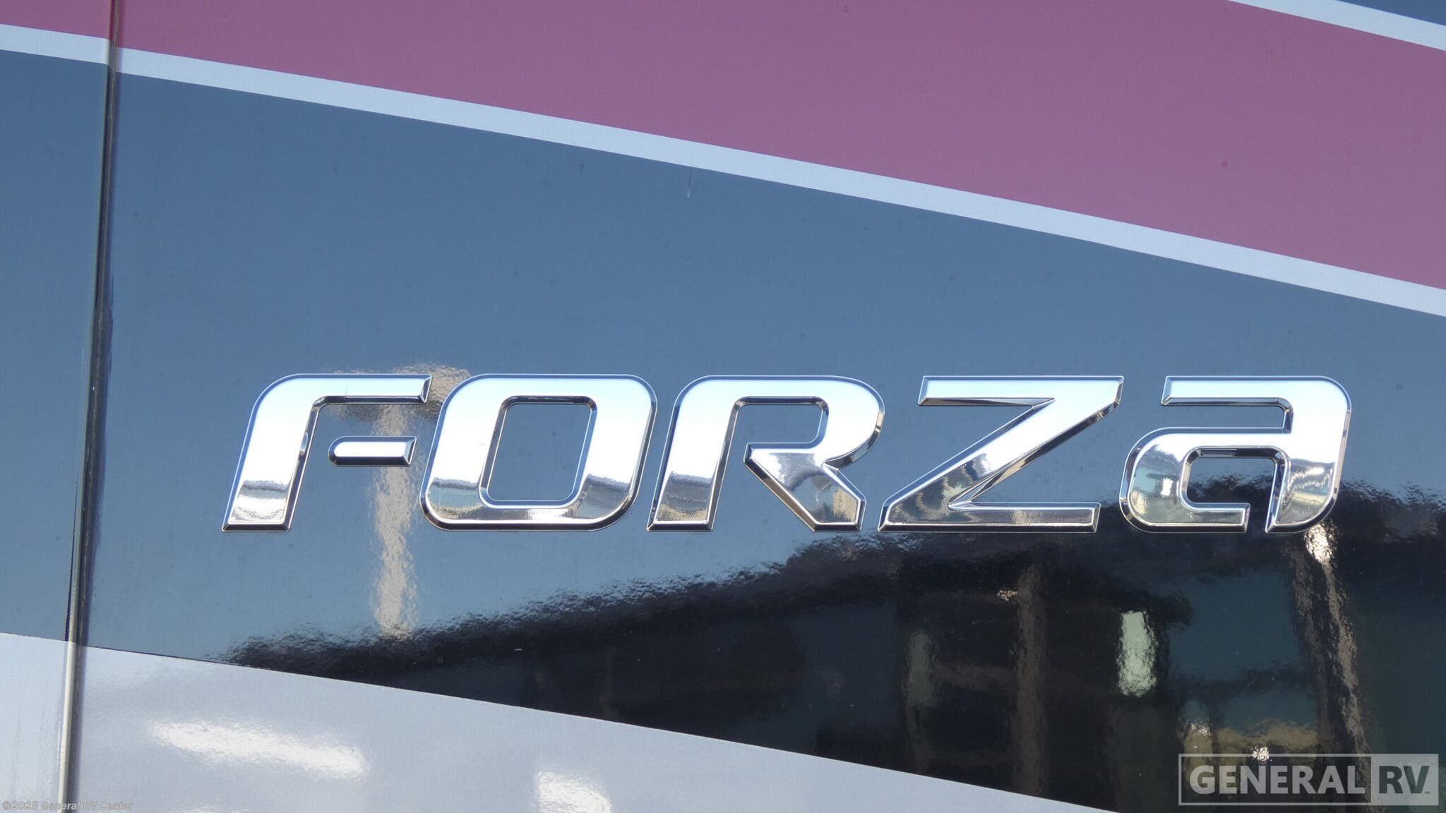Winnebago Forza Class A diesel motorhome 36H highlights: Triple Slides Residential Refrigerator TrueComfort+ Sofa Walk-Around Bed Corian Countertops Pull-Out Table You can have many adventures of all sorts with this Forza Class A diesel motorhome! There is so much interior living space because of the three large slides, and there is also great relaxation found with the swivel/reclining cab seats, the BenchMark dinette, and the TrueComfort+ sofa. The private bedroom has quite a bit of storage space with its chest of drawers and full-width wardrobe, and there is also a 40" HDTV and queen-size bed with nightstands on either side. The kitchen is going to be amazingly helpful with its residential refrigerator, convection microwave, flip-up countertop extension, and pantry, and you will also love having a full bathroom with a 38" x 30" shower with seat, a textured glass shower door, and a bath skylight. You can also choose the optional Studio Loft drop-down bed on this model if you are needing more sleeping space! There isn't a thing you won't love about the Winnebago Forza Class A diesel motorhome! These powerful and practical coaches have excellent quality in their construction, and the undercarriage lighting is quite stylish and impressive. You'll find NeWay air suspension with V-Ride, automatic hydraulic leveling jacks, a 10,000-LB hitch, and automatic entrance steps. Sitting in the cab will be enjoyable with the multi-adjustable swivel and recline seats, the radio/rearview monitor system with 9" LCD color touchscreen, the cellphone interface to radio, and the TRW® tilt/telescopic steering column with foot-actuated pedal. The interior has a Firefly switch panel that lights up when it's dark, and the 6,000W Cummins Onan generator is what you need to power your coach.