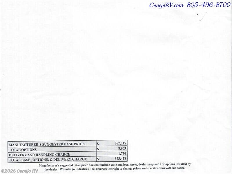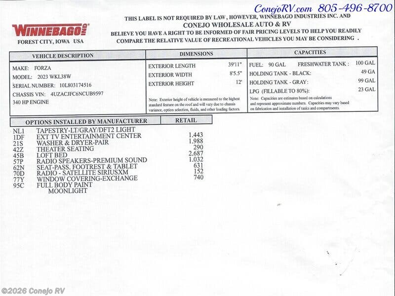 2023 Winnebago Forza 38W Triple Slide Outs Bunkhouse Loft Bed 2 Bath Cummins Turbo Diesel 45k Miles **159,990** Freightliner XCS Full Air Chassis, 340-hp Cummins® ISB 6.7L Turbo Diesel, Allison 6 Speed Automatic Transmission, Air Brakes w/ABS, Onan Quiet 6.0KW Diesel Generator, 2KW Inverter, Automatic Hydraulic Levelers, Private Rear Bedroom with Walk-Around Island Queen Bed, Mid Coach Bunkbeds & Private Full Bath with Porcelain Toilet, Vanity/Sink, Walk-in Shower with Glass Enclosure, Second Full Bath With Sink, Shower and Toilet, Washer and Dryer, Driver Side Slide Out With Nice Kitchen with Corian Countertops and Matching Sink Cover, Glass Stove Cover, Residential Refrigerator/Freezer, Icemaker, Microwave, Pantry, , Large Living Room Flat Screen TV, Electric Fireplace, Large Living Room Super-Slide with Ultra-Leather Convertible Booth Dinette and Ultra-Leather Theater Seats, Bunk Beds, Front Power Loft Bed, Sleeps up to 6, Ultra-Leather Swivel/Reline Captains Chairs, Passenger Flip Up Desk/Table, Radio/Rearview Monitor System w/9" LCD color Touch Screen, Bluetooth, Sirius-XM®-ready, USB input, Rear Back Up Camera, Power Patio Awning, Full Basement Storage with Pass-Thru, Outdoor Entertainment Center With Flat Screen TV, 100 Gallons Fresh Water, Dual Ducted Roof Airs with Heat Pumps, 50 Amp Storage, Tow Package, High Gloss Full Body Paint, 45k Original Miles, Like New Condition, ***Only $159,990*** We have some fantastic financing and take trades also! It is our #1 goal that your experience with our company is an enjoyable one with our staff of industry professionals, Conejo Wholesale Auto & RV, Exclusive Ventura County Dealer For Winnebago Navion, Revel, Solis, Ekko, and Travato, All Storyteller Products, Outside Van Syncline and Approach, Tiffin GH1, All Roadtrek Products, We Also Carry Some Quality Pre-Owned Motorhomes which come with Our 45 Day/1000 Mile In-House Warranty at No Charge, Conejo RV, 661 E. Thousand Oaks Blvd, Thousand Oaks, CA 91360, 805-496-8700, Open 7 Days, 9am to 6pm, All Coaches Fully Inspected, Serviced and Detailed, Come Experience the No Pressure No Haggle Sales Approach at Conejo RV, We Also Buy Clean Late Model Coaches, 1 Year Free Camping Membership Included Ask For Details! (***plus tax & license fees***)