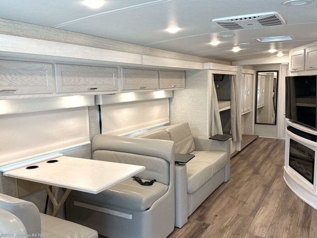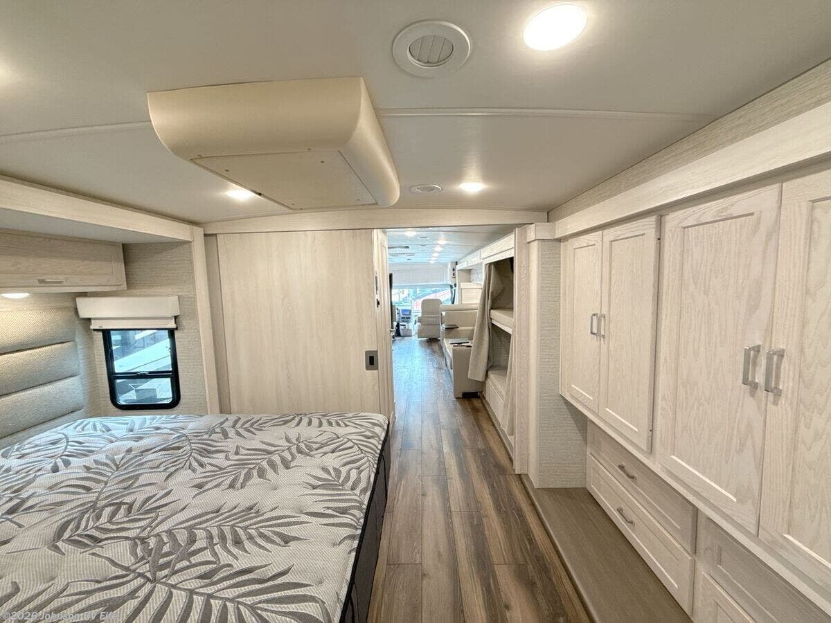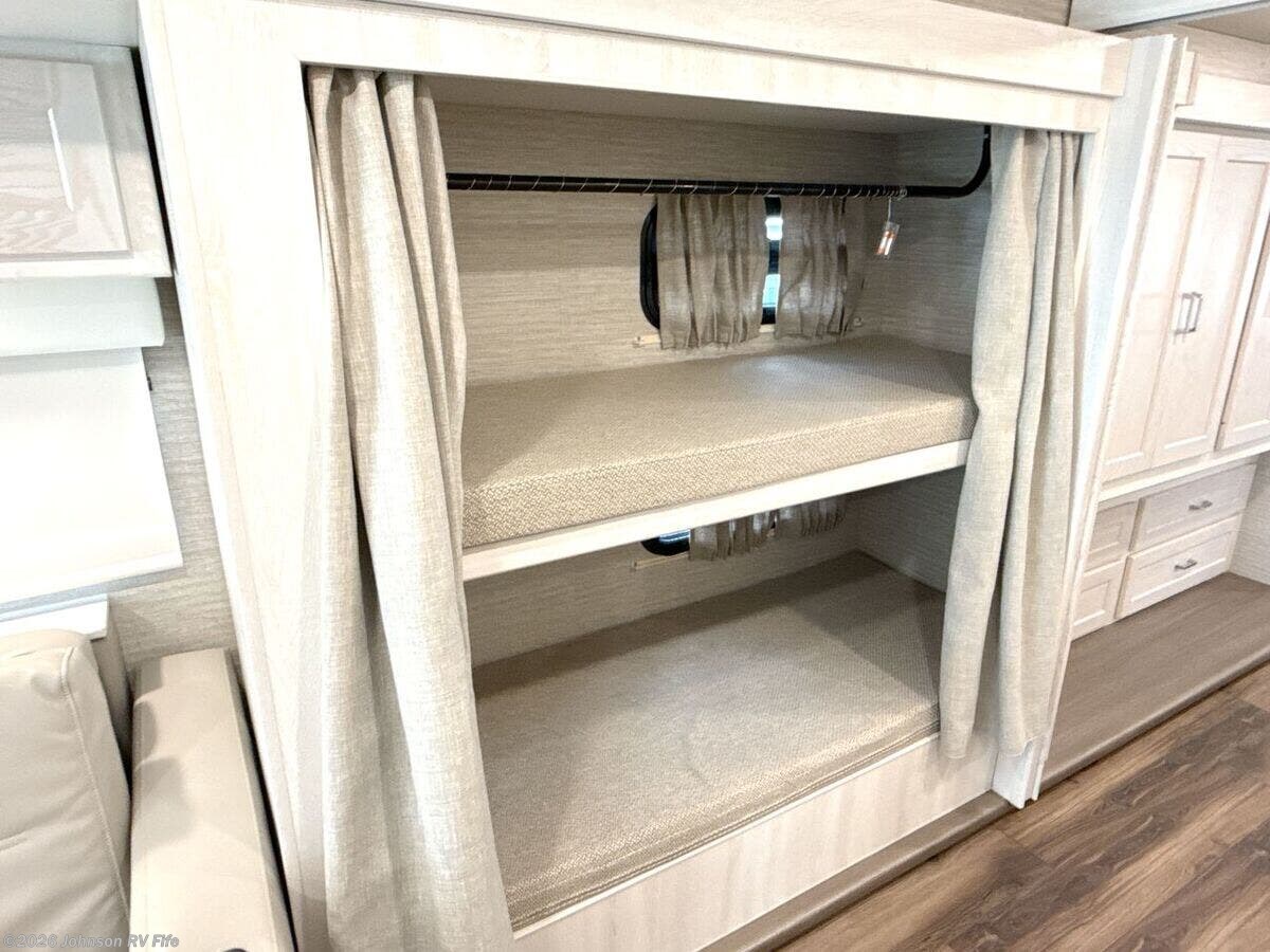 Features Include: 340 HP, 160-Amp Alternator, Exhaust Engine Brake, Air Brakes with ABS, Cab Features, Side Camera, OptiView Dash, Apple CarPlay, Android Auto, Sirius XM, Cell Phone Interface, Foot-Actuated Pedal, Power Steering, Cruise Control, Living Spaces, 38W), KeyOne Lock System, Entry Assist Handles, Vinyl Flooring, Soft Vinyl Ceiling, LED Ceiling Lights, 38W), 38W), BenchMark Dinette, Pull-Out Table (36H), Pantry, 36H), 36H), 3-Burner Cooktop, Bi-Fold Glass Cover, WiFi Signal Booster, Cable TV Hookup, 50-inch HDTV, Headboard, 38W), Wardrobe, Under Bed Storage, HDTV Bunk Beds (38W), Medicine Cabinet, Laminate Countertop, Skylight, 50-Amp Service Cord, Furnace Ducted Heat, On Demand Water Pump, Aluminum Structure
