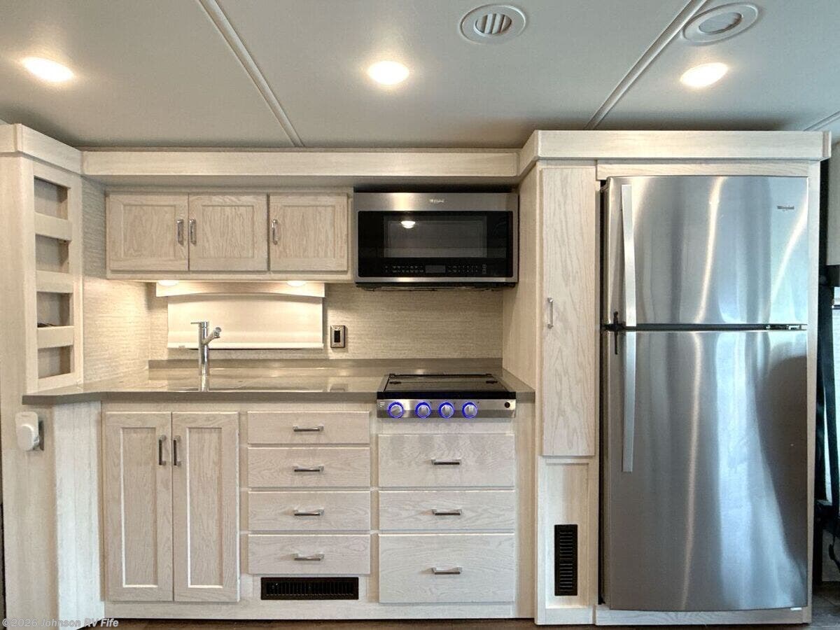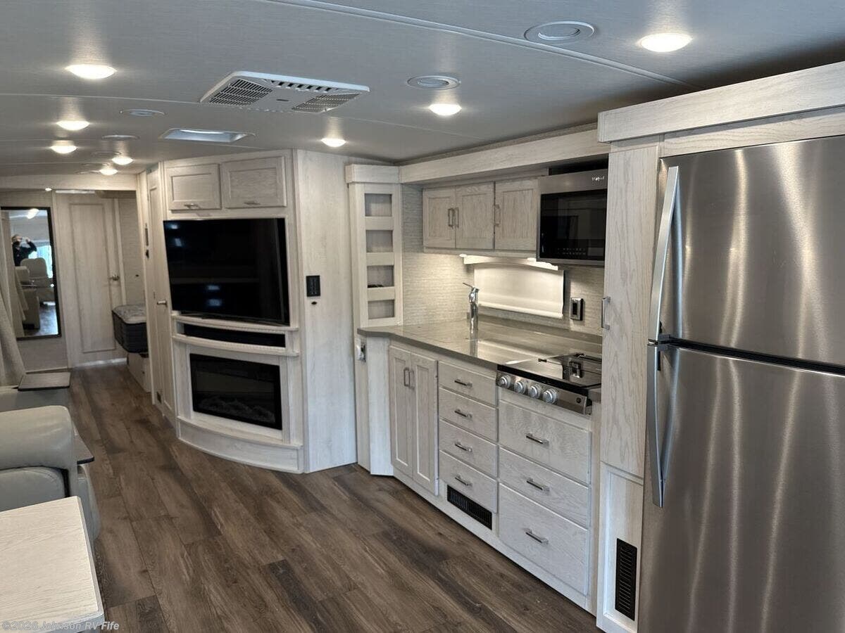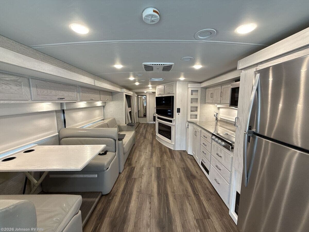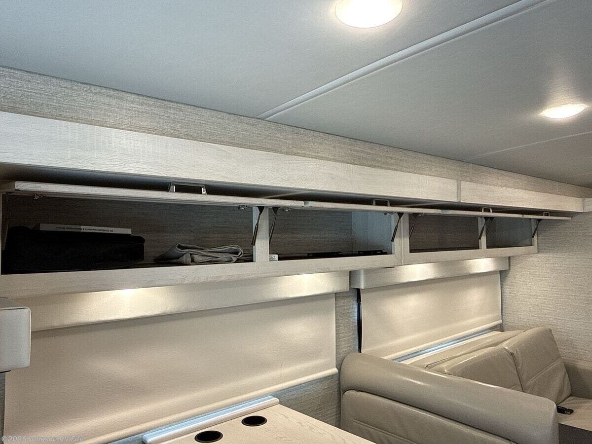 Features Include: 340 HP, 160-Amp Alternator, Exhaust Engine Brake, Air Brakes with ABS, Cab Features, Side Camera, OptiView Dash, Apple CarPlay, Android Auto, Sirius XM, Cell Phone Interface, Foot-Actuated Pedal, Power Steering, Cruise Control, Living Spaces, 38W), KeyOne Lock System, Entry Assist Handles, Vinyl Flooring, Soft Vinyl Ceiling, LED Ceiling Lights, 38W), 38W), BenchMark Dinette, Pull-Out Table (36H), Pantry, 36H), 36H), 3-Burner Cooktop, Bi-Fold Glass Cover, WiFi Signal Booster, Cable TV Hookup, 50-inch HDTV, Headboard, 38W), Wardrobe, Under Bed Storage, HDTV Bunk Beds (38W), Medicine Cabinet, Laminate Countertop, Skylight, 50-Amp Service Cord, Furnace Ducted Heat, On Demand Water Pump, Aluminum Structure