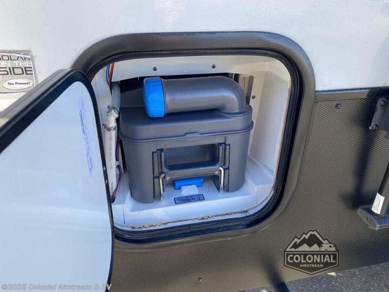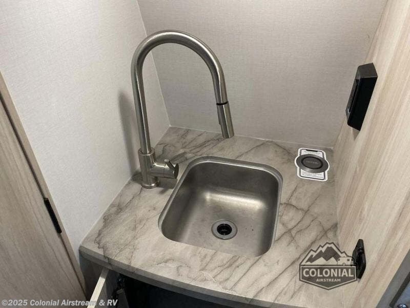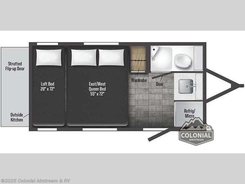 Explorers will love this trailer with the comfortable accommodations inside and rugged amenities outside. You can sleep on the east/west queen bed and a friend or family member can sleep on the loft bunk bed above. There is a wardrobe to store your clothing that is next to the wet bath which provides privacy to change and get cleaned up in after hiking or sitting by the campfire. The portable induction cooktop can be used inside or take it to the outside kitchen counter space to whip up a meal while enjoying your views, and there is a portable Truma cooler waiting for you to grab a beverage. Back inside, there is an undermount single bowl sink with cover, a convection microwave, and a 3.1 AC/DC compressor refrigerator.