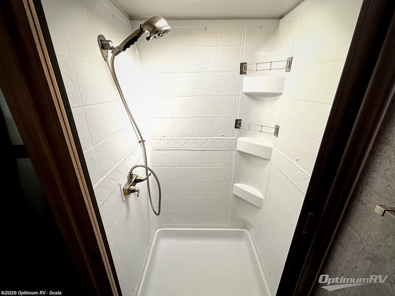 Pack your bags and head to the campground with this travel trailer! You will love all that it has to offer from the full rear bathroom with shower and a wardrobe for your clothes and linens to the front 60" x 74" RV queen bed with a wardrobe on one side, a nightstand on the other, and a privacy curtain to draw at night. The 44" x 72" booth dinette slide is not only a great place to enjoy your meals at or play card games, but it can also be transformed into an extra sleeping space if you want to bring along a guest. When you don't feel like making dinner, you can easily pop in some leftovers or a bag of popcorn into the convection microwave and relax while you watch a movie on the LED TV!