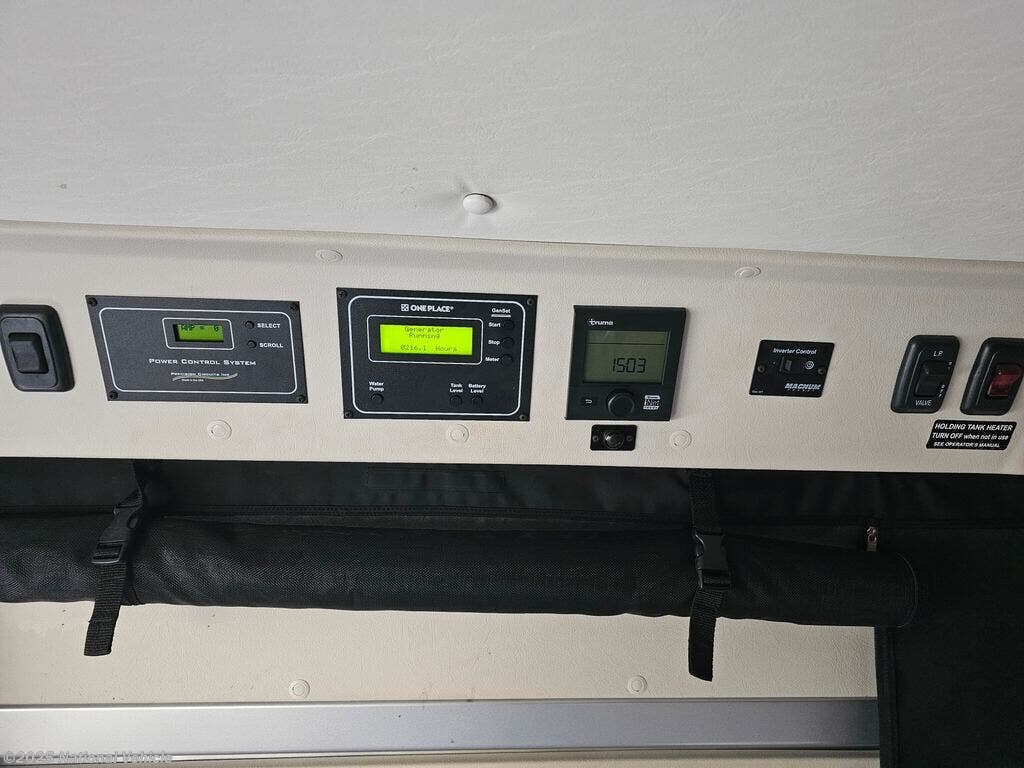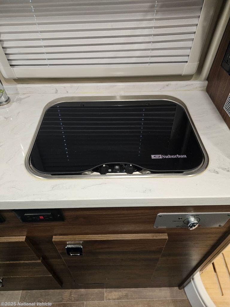 The well-equipped galley includes a stainless-steel sink, two-burner cooktop, microwave, refrigerator, and abundant cabinetry designed for efficient use of space. The compact yet functional wet bath provides everything you need on the road without compromising interior comfort.