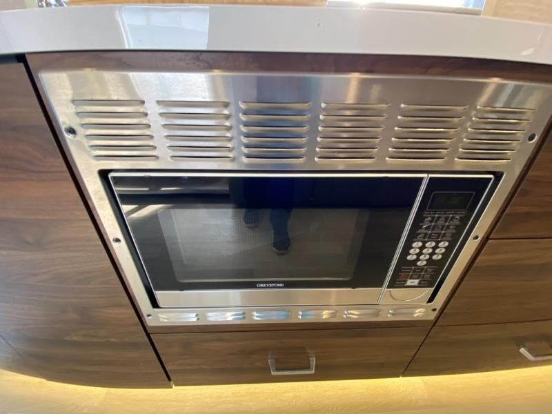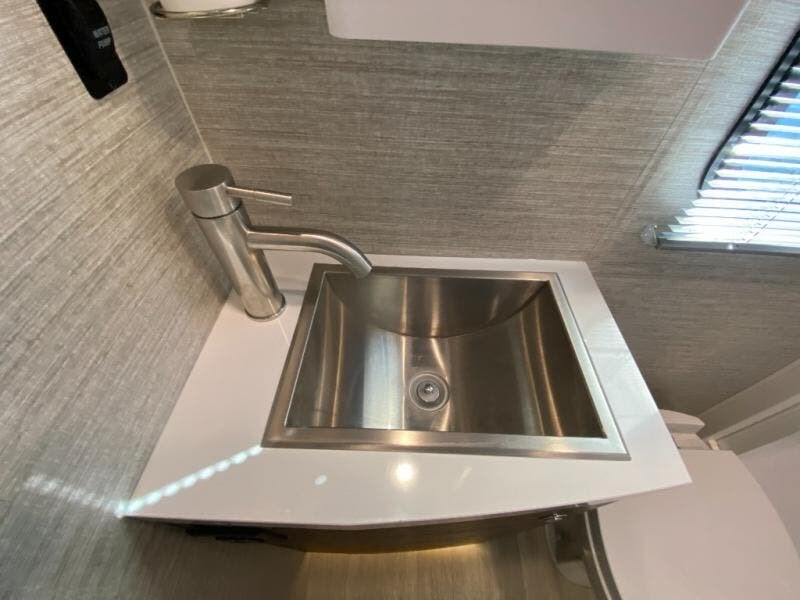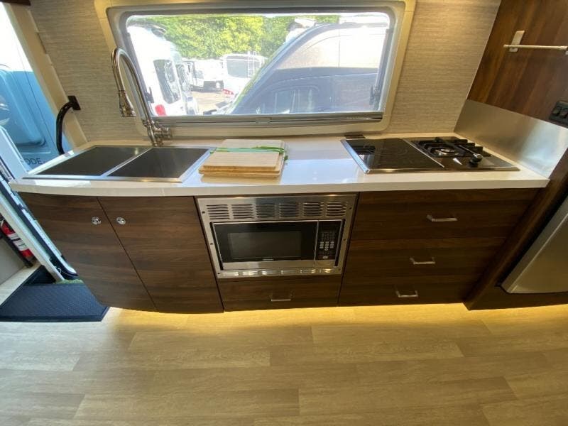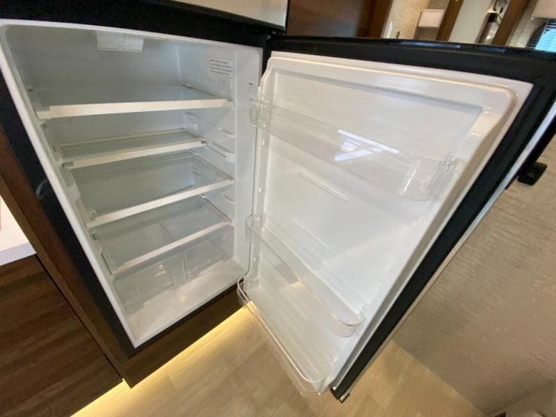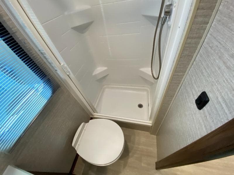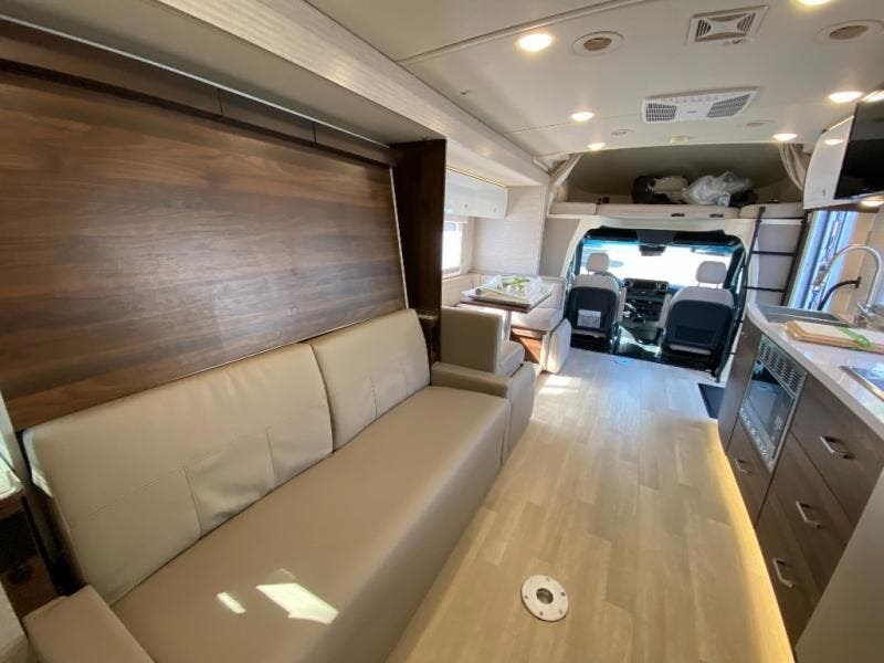 A couple or family will enjoy the look of the interior each time they take this View Class C diesel motorhome on the road. With the curved cabinets, the lighted soft-close galley drawers, and the sprung-cushion dinette and sofa seats, there will surely be a favorite feature for everyone. You will be able to easily set up the queen Murphy+ bed when it's time for bedtime while the kids sleep on the bunk above the cab or the U-shaped dinette. You might like to add the theater seating option with swivel tables if you don't need that extra sleeping space. Everyone can get cleaned up in the full rear bathroom that has a space-saving sliding door before making meals with full kitchen amenities including a convection microwave/oven.