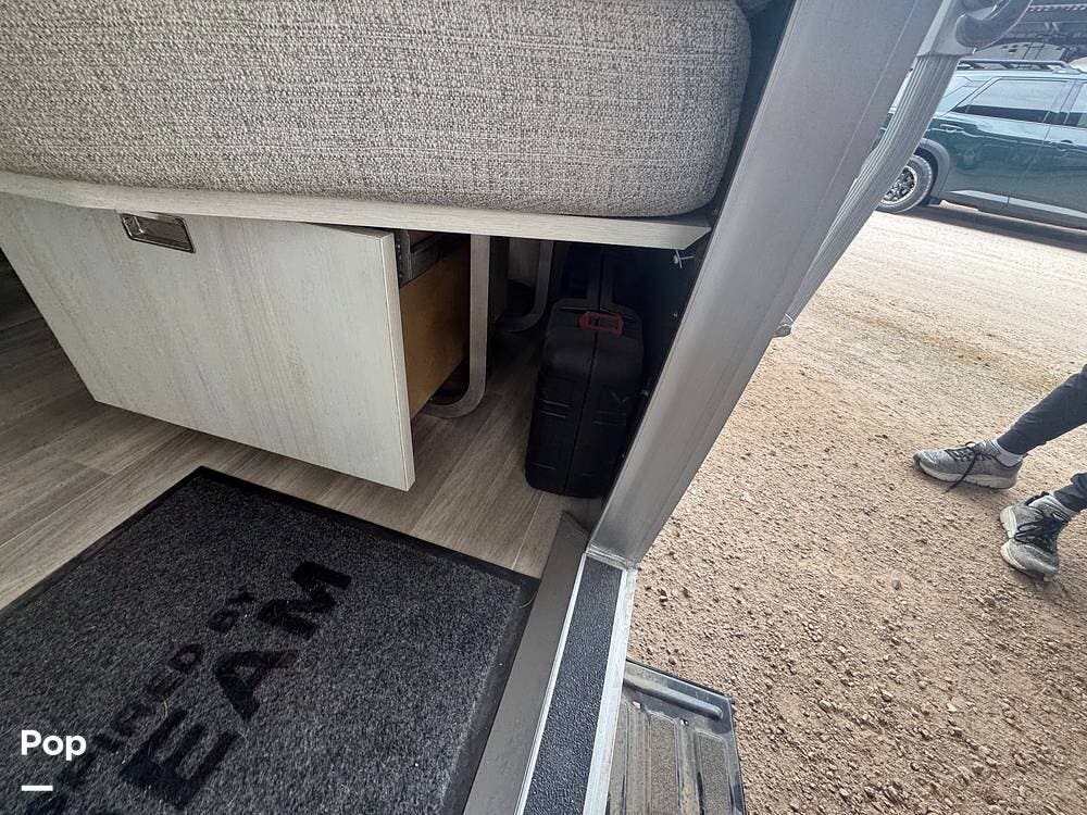 Positioned at the back, it offers a sense of separation and privacy that's rare in a trailer this size. Overhead cabinets and under-bed storage help keep clutter out of sight, maintaining the clean, uncluttered feel of the interior.