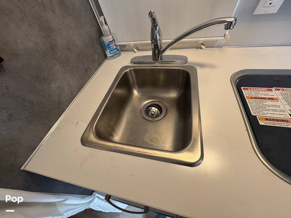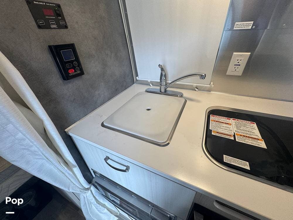 Mid-coach, the kitchen is efficient and neatly organized. There's no wasted motion here and features a two-burner cooktop with a cover that doubles as counter space, a compact refrigerator, a stainless sink and overhead storage