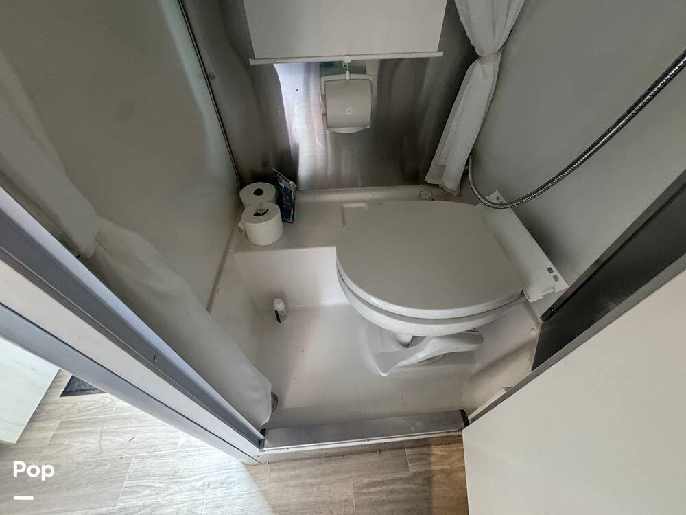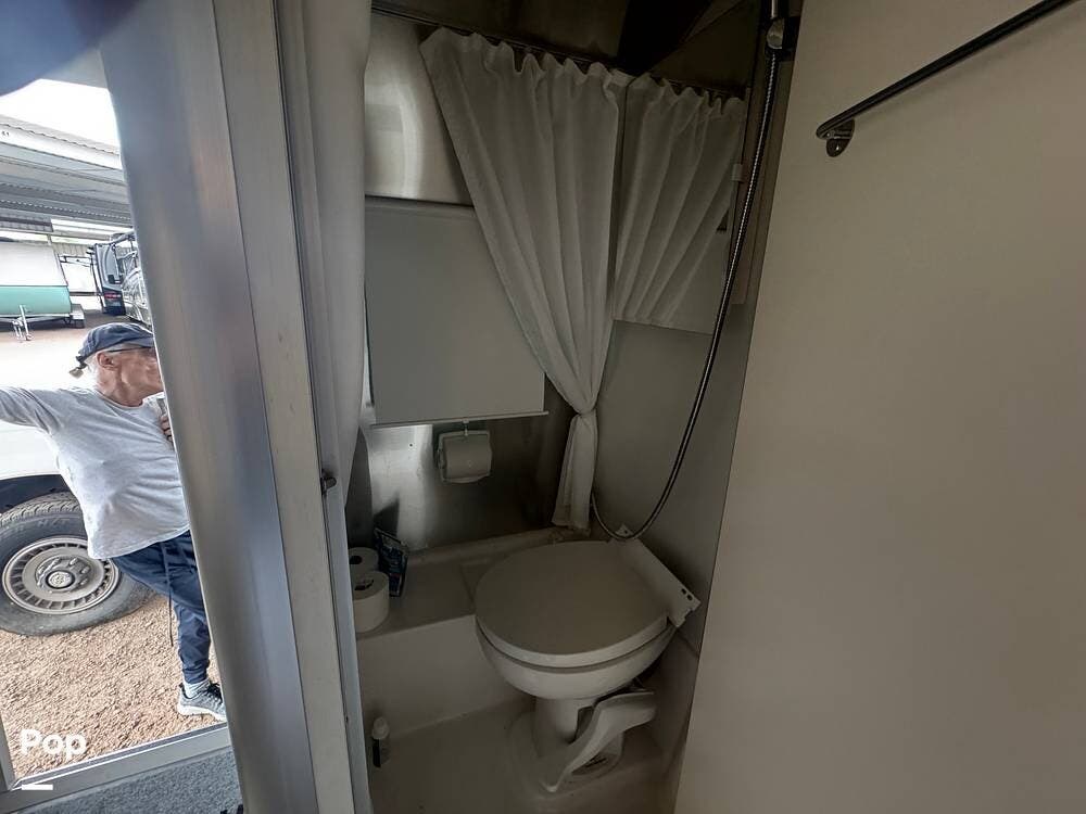 Across from the kitchen sits the wet bath, a hallmark of ultra-compact trailers. The shower, toilet, and bathing space are combined into one sealed compartment.