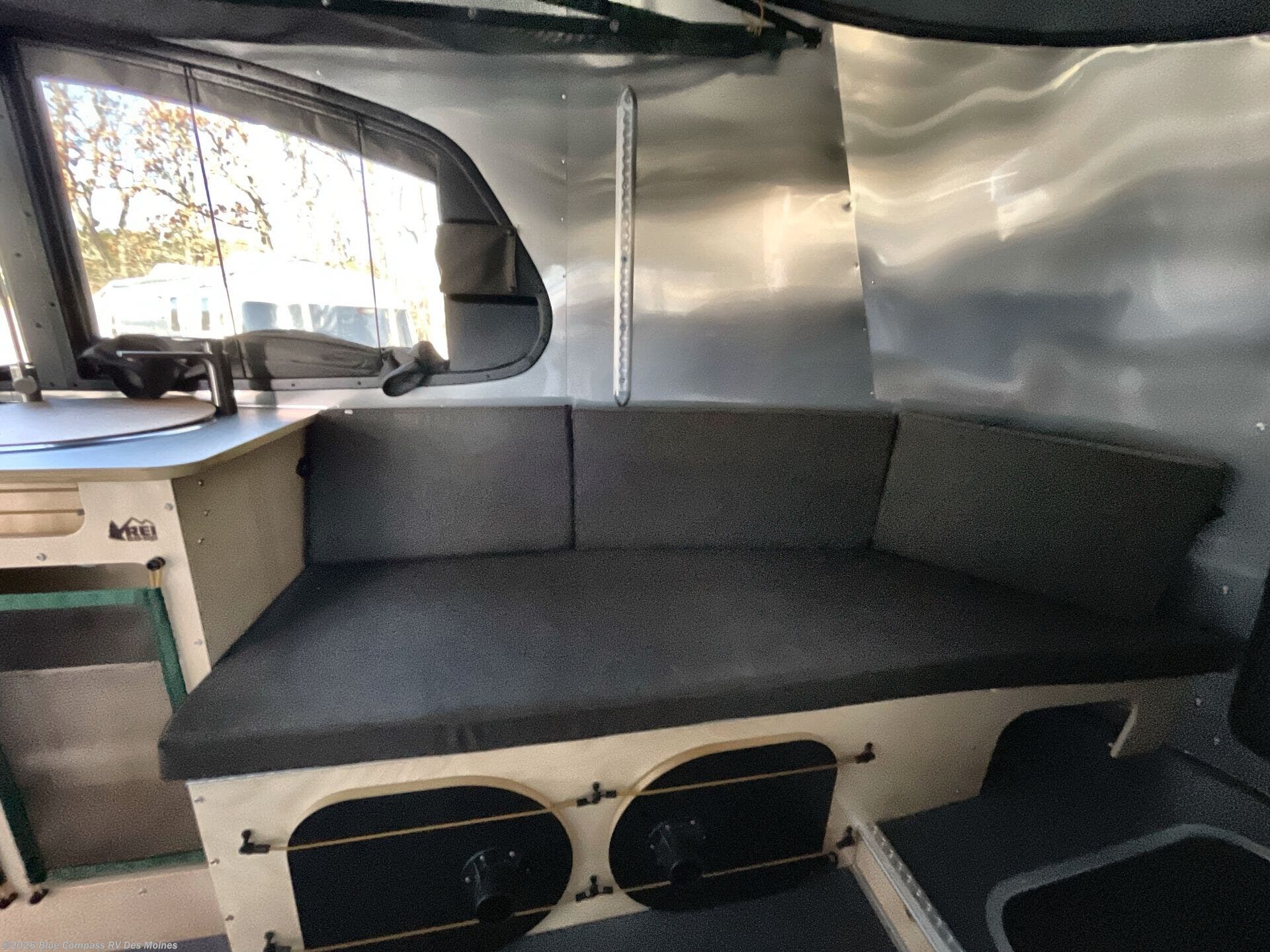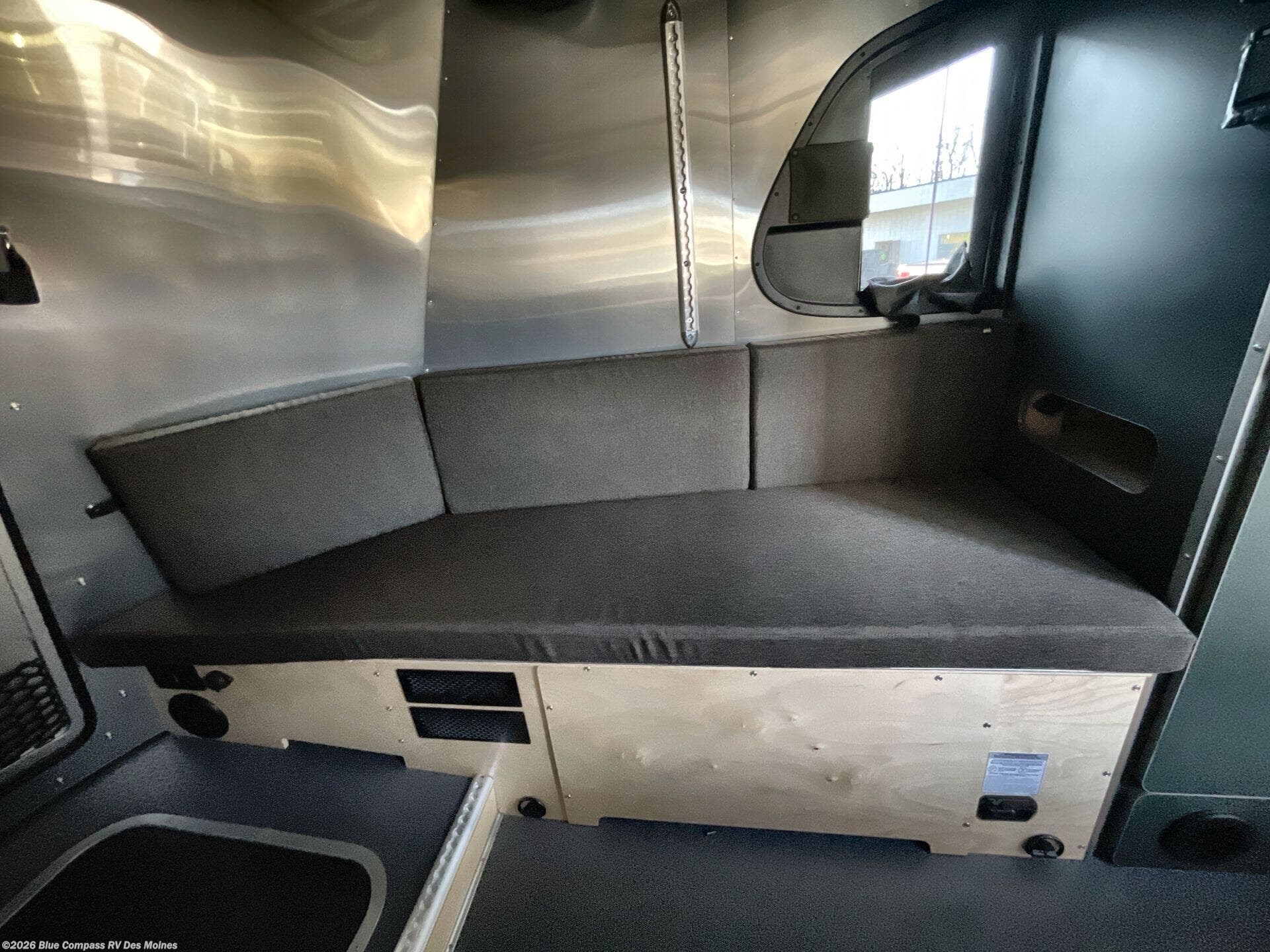 This travel trailer includes the Basecamp X Package that comes with stainless steel front stone guard protection, Goodyear off-road tires, and a 3" lift kit for added ground clearance. You can easily sleep everyone when using both the rear benches and the front U-shaped dinette. The benches provide split sleeping or a half-bed on one side and a full bed that spans the back of the trailer into an 82" x 78" area. There is storage under the cushions for the two removable tables that allow you to dine, work and relax with a place for your cellphones and such. The wet bath comes complete with a shower, sink and toilet so you can rinse off from a day outdoors, the galley kitchen gives the cook a place to make warm meals and store drinks and leftovers. This Basecamp also offers front panoramic windows, a steel entry step, a full-size spare tire, and a rear hatch allowing you to take your snowboards, skis, and paddle boards.