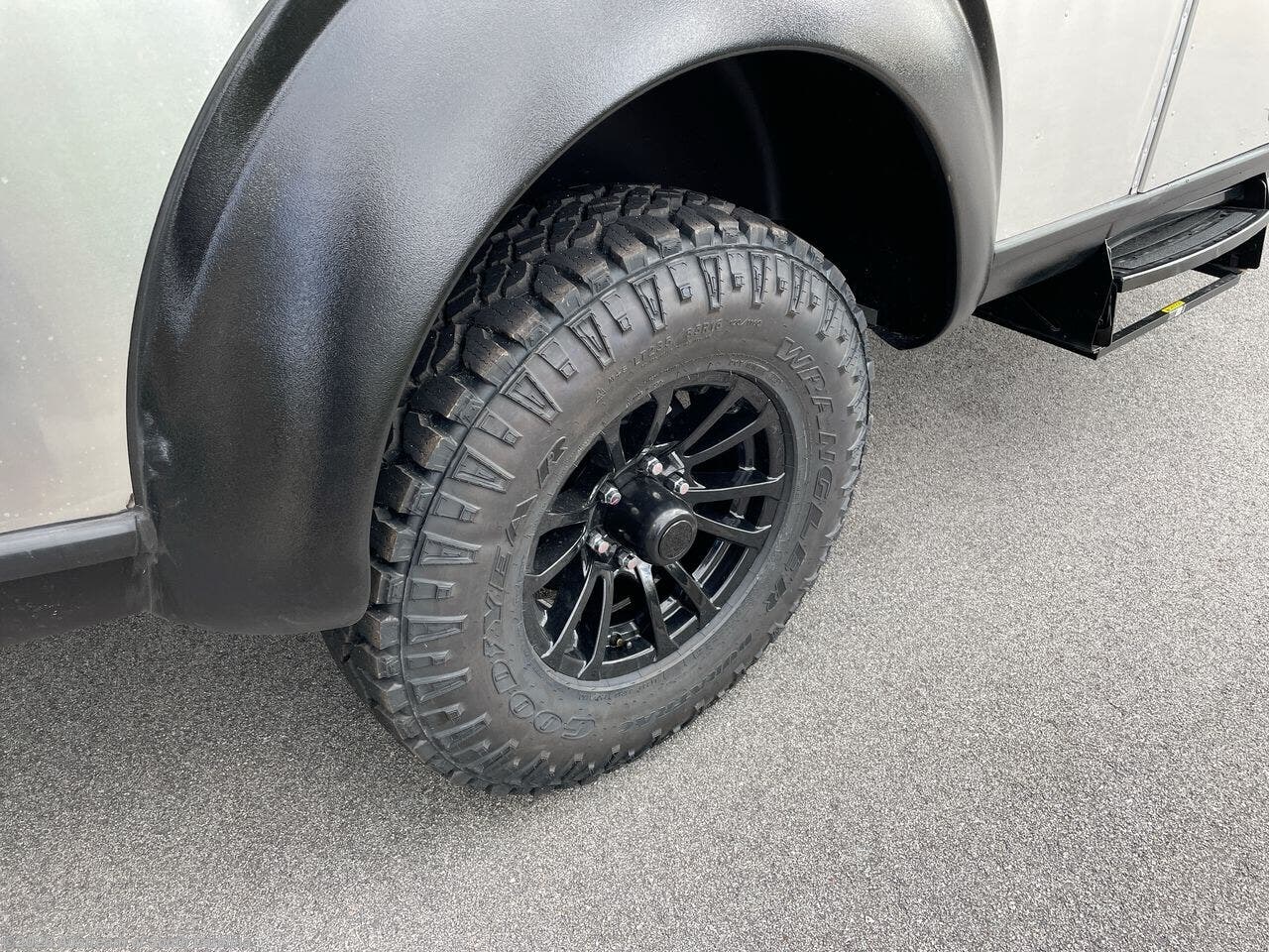 This travel trailer includes the Basecamp X Package that comes with stainless steel front stone guard protection, Goodyear off-road tires, and a 3" lift kit for added ground clearance. You can easily sleep everyone when using both the rear benches and the front U-shaped dinette. The benches provide split sleeping or a half-bed on one side and a full bed that spans the back of the trailer into an 82" x 78" area. There is storage under the cushions for the two removable tables that allow you to dine, work and relax with a place for your cellphones and such. The wet bath comes complete with a shower, sink and toilet so you can rinse off from a day outdoors, the galley kitchen gives the cook a place to make warm meals and store drinks and leftovers. This Basecamp also offers front panoramic windows, a steel entry step, a full-size spare tire, and a rear hatch allowing you to take your snowboards, skis, and paddle boards.