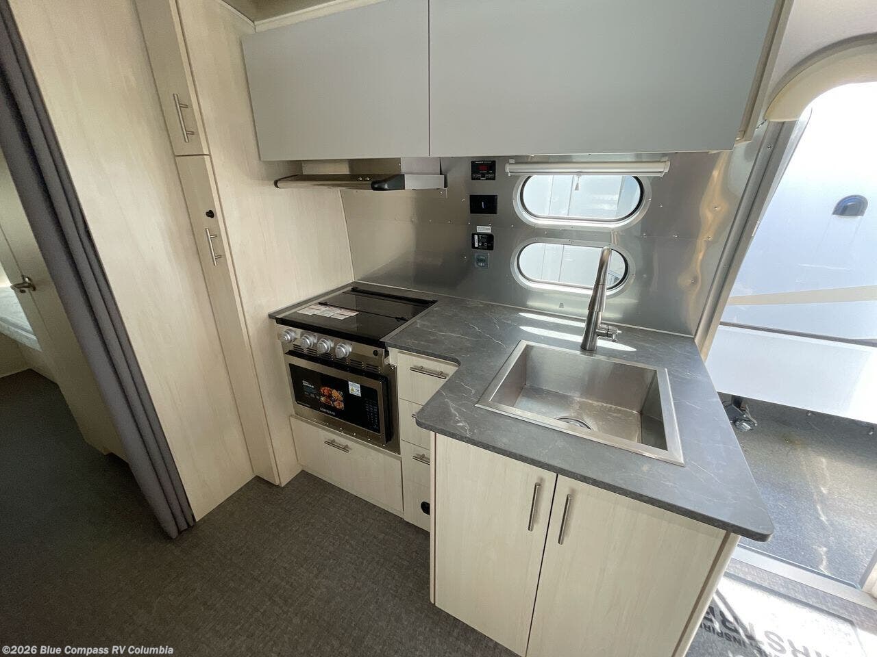 With each Flying Cloud travel trailer by Airstream, there are two axles, and each is built for ease of towing, plus there is a rear-view camera to make reversing and parking easier, and stainless steel front stone guards to protect the lower segments from road debris. The iconic Airstream design is created outside and inside by the semi-monocoque aluminum superstructure, the temperature reducing one-piece white aluminum roof, the panoramic front windows, and the stylish aluminum wheels. The interior will have you feeling right at home with handcrafted cabinetry, plenty of storage and counter space, sleek roller blinds and blackout curtains, plus residential style faucets!