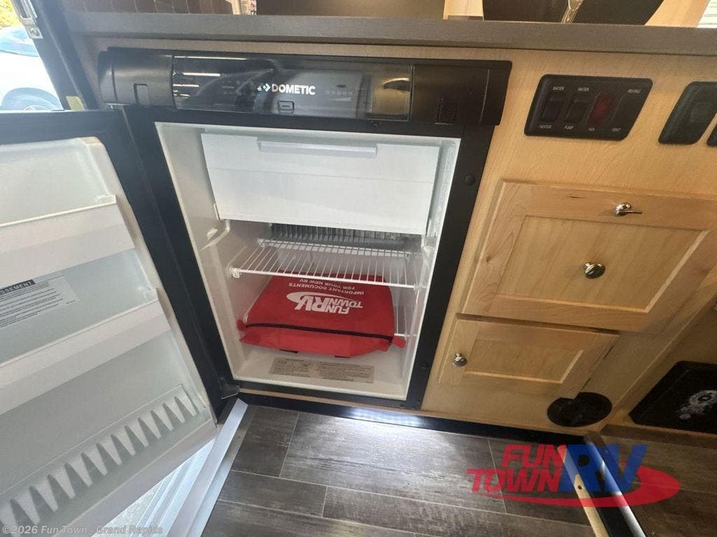 Your time at the campground will be complete with this lightweight travel trailer. There are two dinette seats with a table to dine, relax, and convert to a 77" x 72" bed size when you're ready for bed. You won't have to use the camp's facilities thanks to the wet bath with an enclosed shower and toilet combination plus a shower door for privacy. This model includes a two burner cooktop, a sink, plus a 3.0 cu. ft. two-way refrigerator under the range to store your perishables.