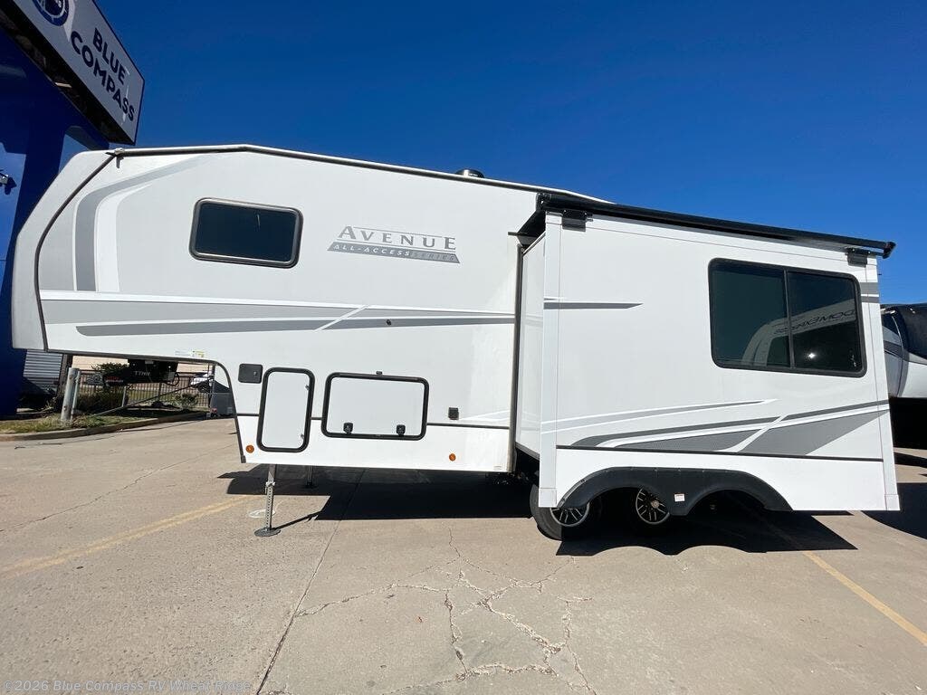 - The Avenue 26RD fifth wheel is the perfect getaway for couples looking to hit the road in comfort and style. The front private bedroom features a queen bed with nightstands on either side and a wardrobe to keep your clothes organized. The full bathroom includes a 30" x 36" shower and a linen closet for convenient towel storage.