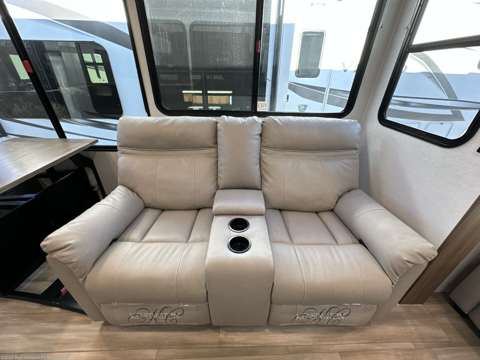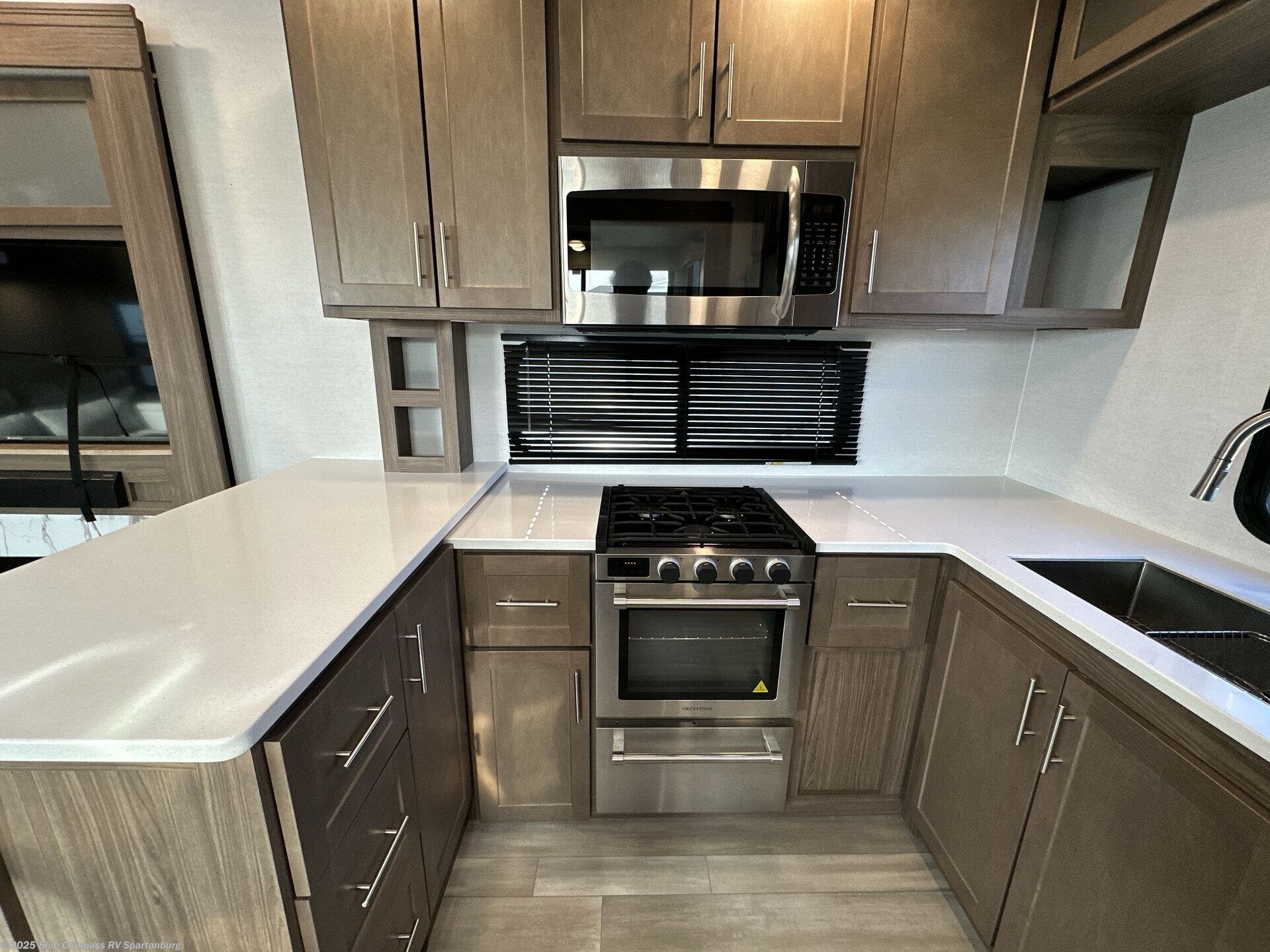 If you've been on the search for a luxury fifth wheel, this is the one! You'll love the rear kitchen with ample counter space, a 16 cu. ft. 12V refrigerator, plus a large sink to clean up. The swing-mount 50" HDTV will provide entertainment for your family while you relax on the dual recliner theater seat or tri-fold sofa. Freshening up each day will be a breeze in the full bath that includes a shower with a seat, and the front private bedroom is close by for convenience. You'll have the queen bed all to yourselves with an option to choose a king bed instead. And check out the large front closet with washer and dryer prep. Going full-time has never been easier!
