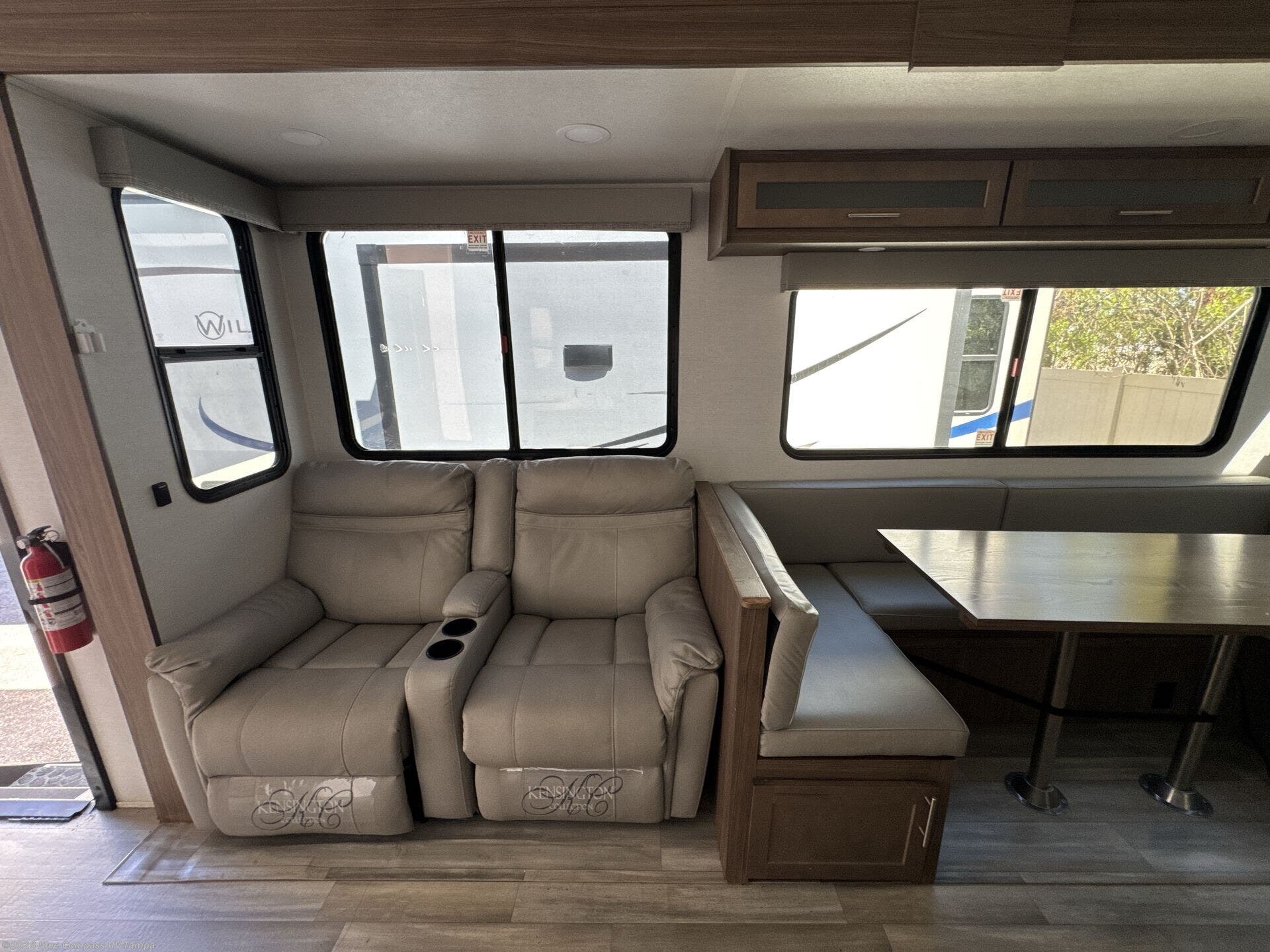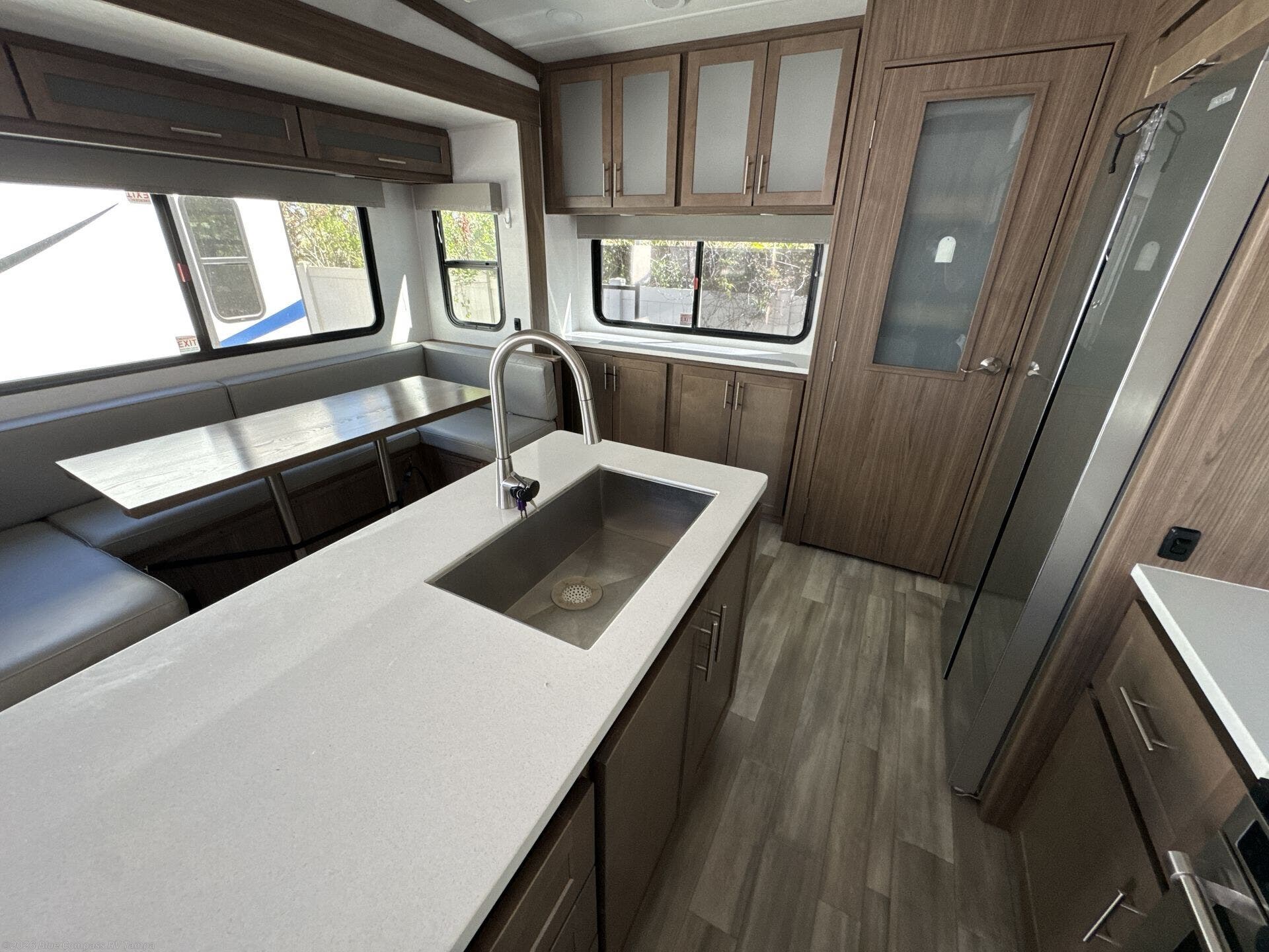 A benchmark chassis creates a space saver upper deck with each one of these Avenue fifth wheels by Alliance RV! The 101 in. wide-body construction gives you more room to walk around and the flush slide out floors throughout prevent any tripping. There are Azdel composite sidewalls inside and out, and a seamless fully walkable PVC roof for extreme durability, zero maintenance, and it is more solar reflective because of the bright white color. Twin 13,500 BTU A/C units provide 27,000 BTUs of cooling power which are ultra quiet and independently controlled keeping you comfortable during your entire trip. And, the fully enclosed and heated underbelly means that you can extend your camping season into the colder months if you like. You are sure to love the "no carpet zone" making each Avenue easy to clean and allergen free, not to mention pet friendly with vinyl flooring throughout. And, strategically placed Atrium windows in the bedroom and living area will not only provide more light, cross ventilation and fresh air, but bring a spectacular view of your surroundings right inside. You can maximize your space throughout with innovative storage solutions like the hidden storage behind the TV, inside the end tables, ottoman, and dinette chairs. Come choose your favorite model today!