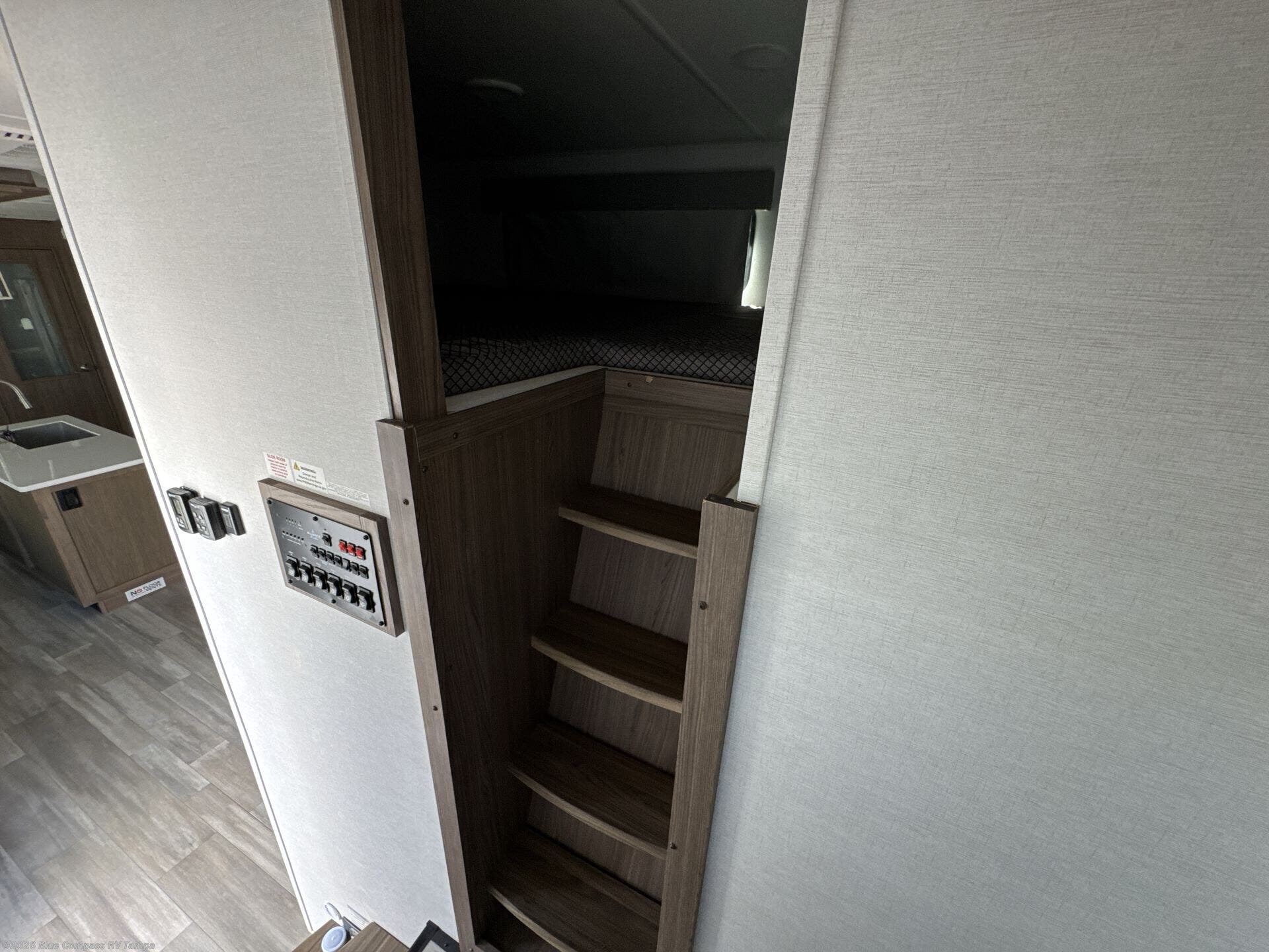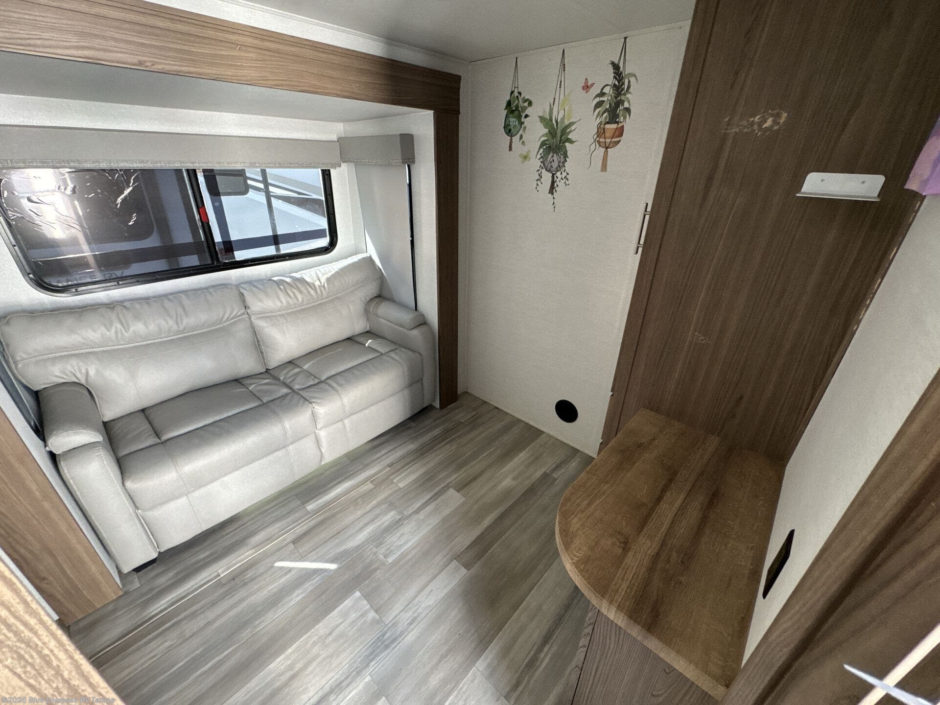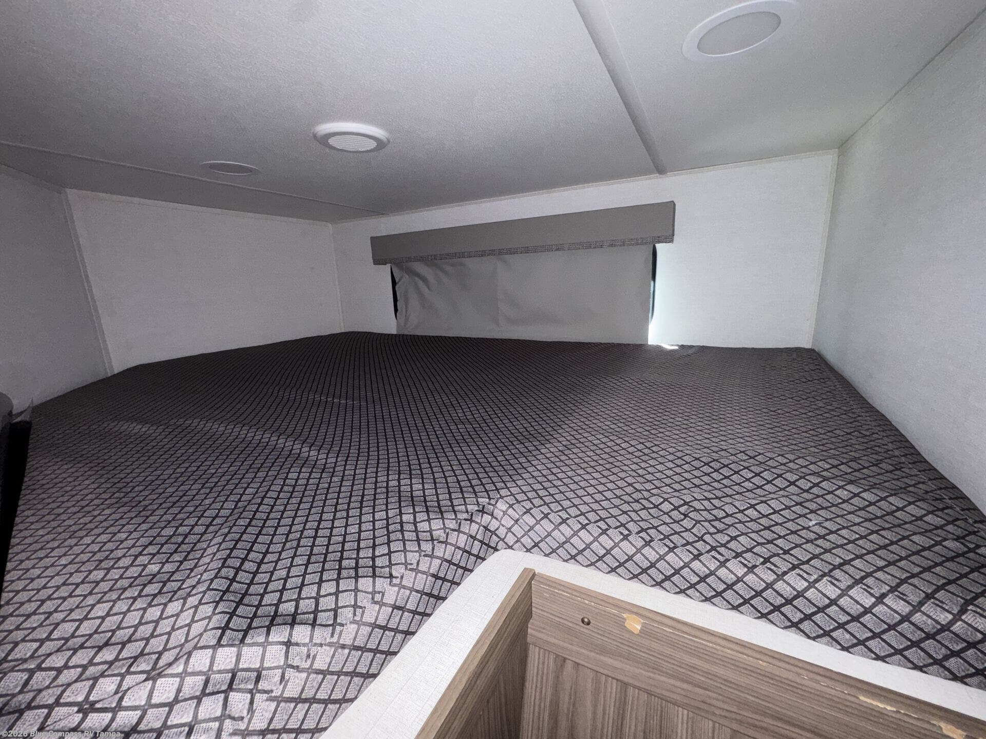 This fifth wheel is packed full with comfortable features! The front private bedroom has a queen bed slide that can be switched out for an optional king bed, a dresser, and a front wardrobe that is prepped to add an optional washer and dryer. Freshen up each morning in the full bathroom with a 30" x 50" shower then head to the full kitchen to prepare breakfast using the kitchen island and three burner cooktop. The second bedroom has a sofa slide with a loft above it all accessible from a staircase at the top of the steps up to the front master bedroom and bath, right before the bathroom door on your left. Relax each night on the dual recliner theater seating across from the swing mount 50" HDTV with hidden storage behind it, or play a few games at the U-shaped dinette. This model also has the option to switch out the U-shaped dinette for an optional floating dinette table beside the theater seat. You also have an outside refrigerator and outside griddle by a flip-up baggage door for storage!