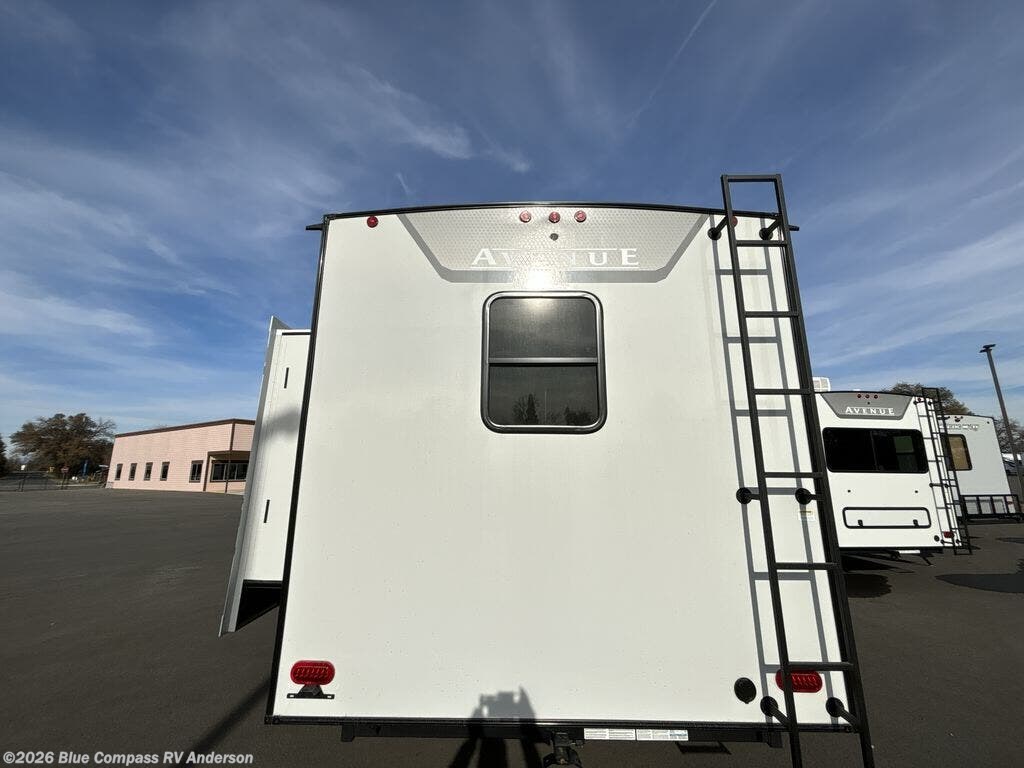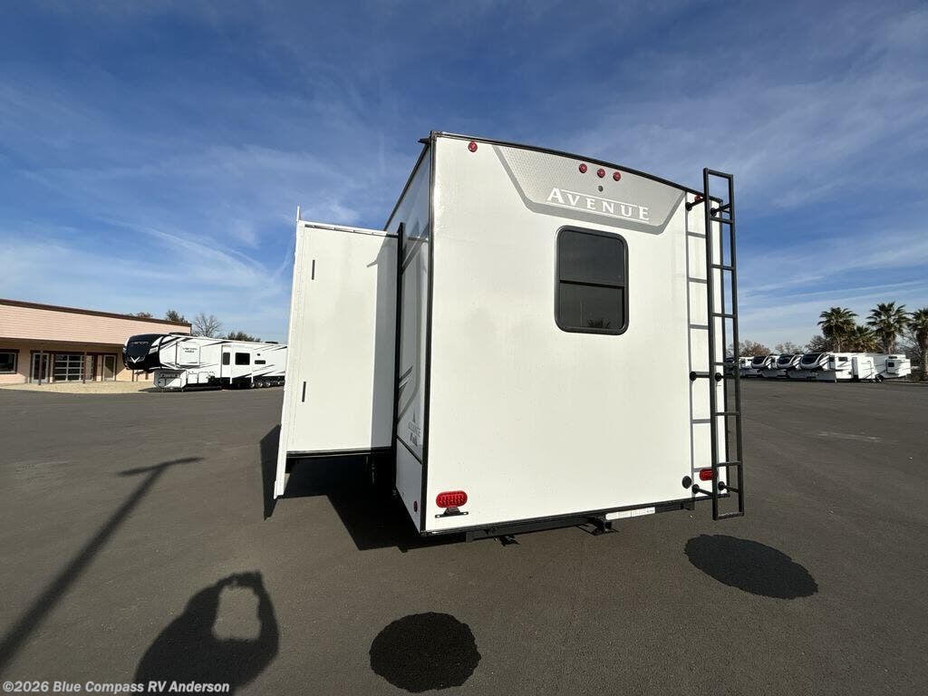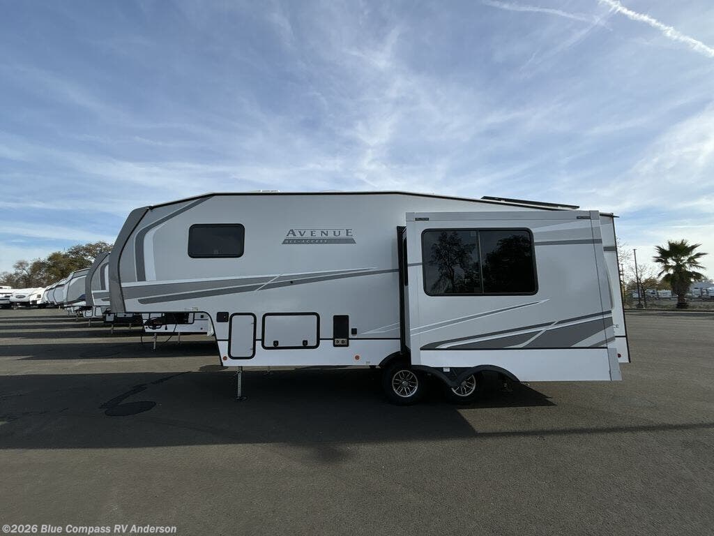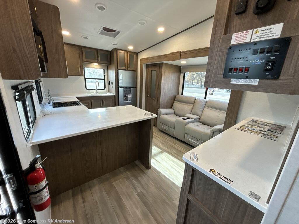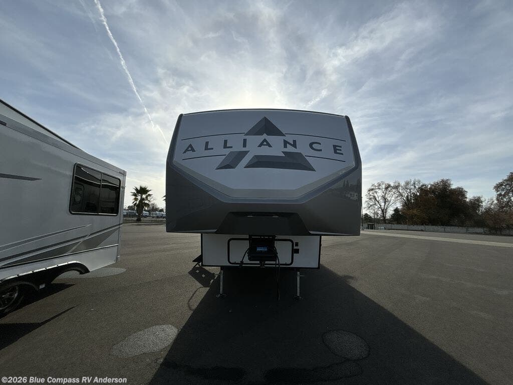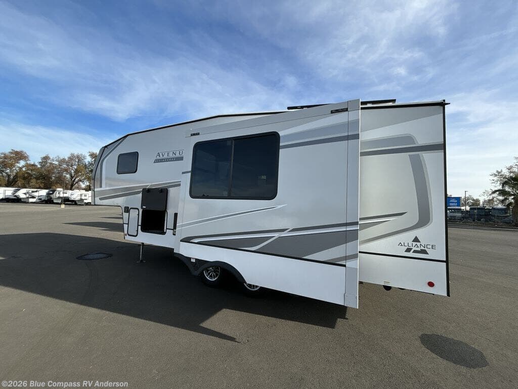 A benchmark chassis creates a space saver upper deck with each one of these Avenue All-Access fifth wheels by Alliance RV! The 101 in. wide-body construction gives you more room to walk around and the flush slide out floors throughout prevent any tripping. There are Azdel composite sidewalls inside and out, and a seamless fully walkable PVC roof for extreme durability and zero maintenance. You are sure to love the "no carpet zone" making each Avenue easy to clean and allergen free, not to mention pet friendly with vinyl flooring throughout. You can maximize your space throughout with innovative storage solutions like the hidden storage behind the TV, inside the end tables, ottoman, and dinette chairs. There are a few available options you might like to add to further customize your fifth wheel, like the optional second 13.5K A/C or the optional Solar Package for off-grid camping capabilities!