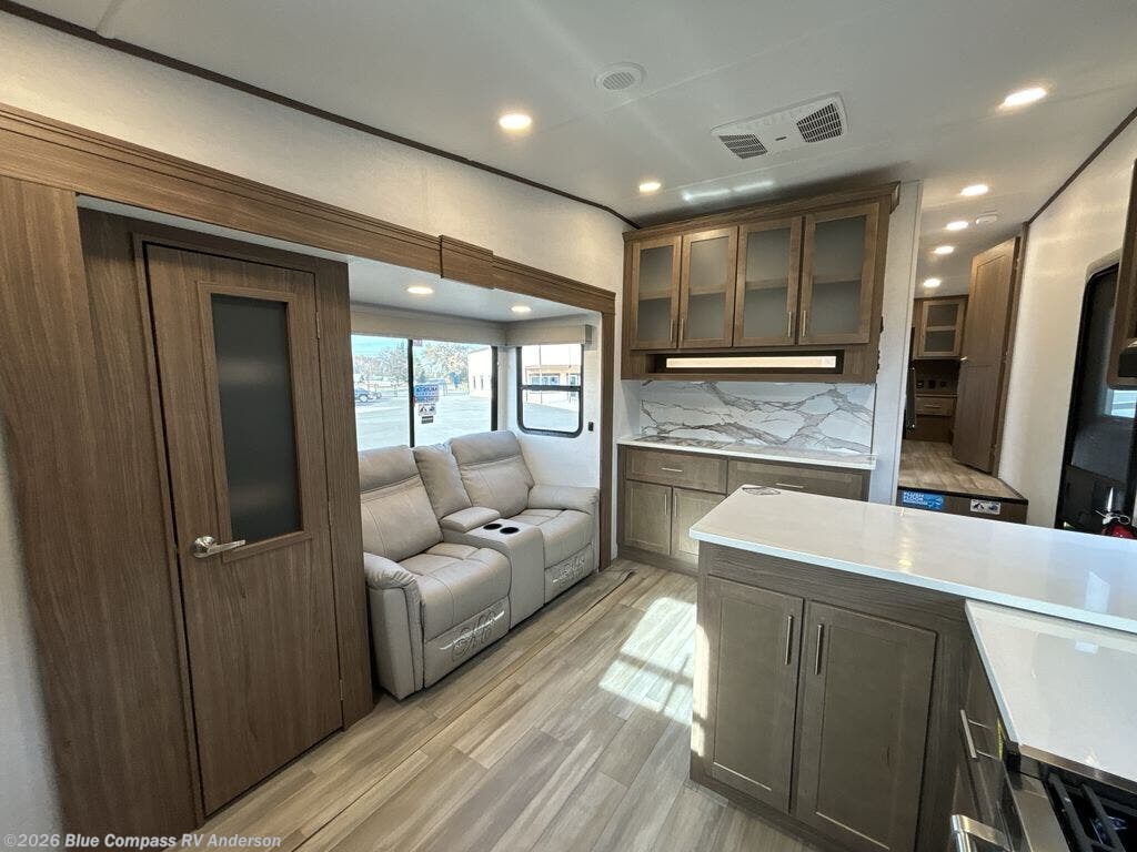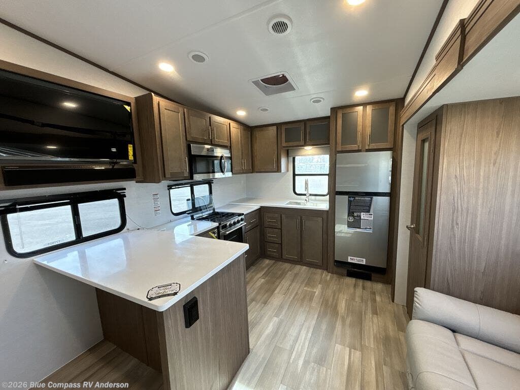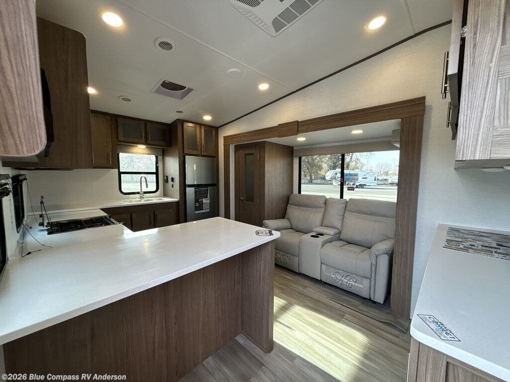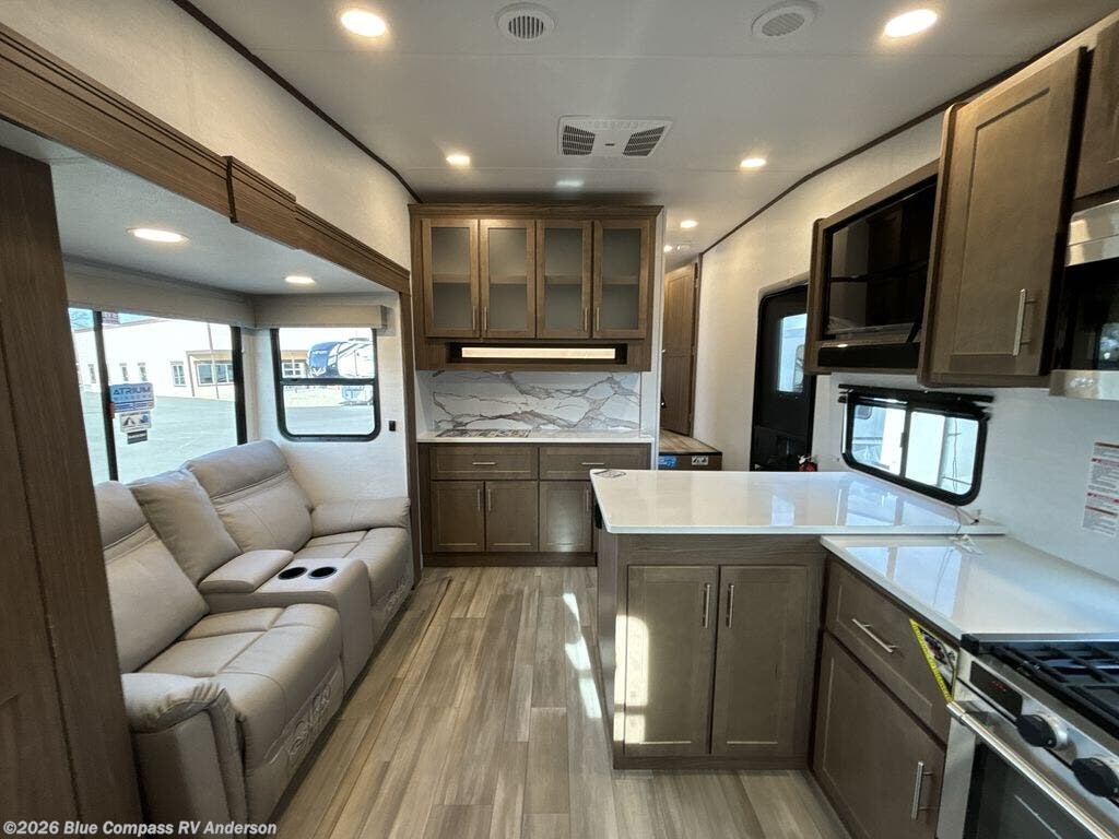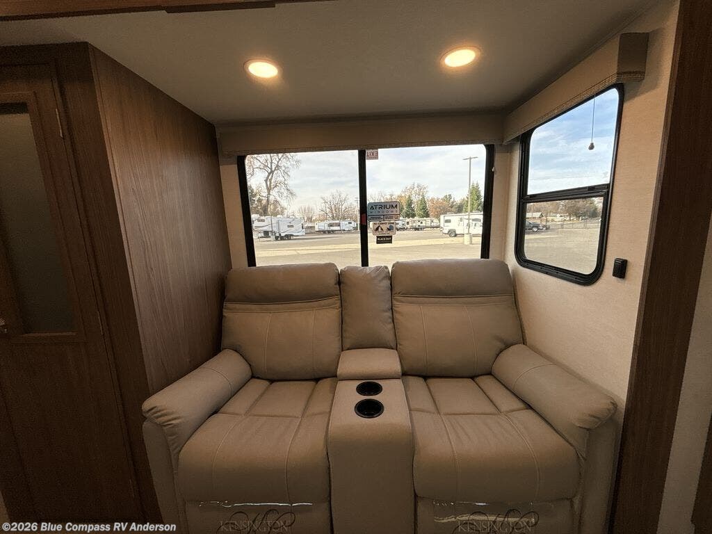 This rear kitchen fifth wheel is the perfect couple's coach! There is a dual recliner theater seat within the slide out across from the swing mount 40" HDTV for movie night. You will also find a spacious pantry and a hutch to store food and dishes. The counter with stools provides a place to enjoy your breakfast at, and the full bath allows you to freshen up each day. You will feel right at home in the front private bedroom that includes a queen bed, dual nightstands, plus a closet to keep your clothes wrinkle-free!