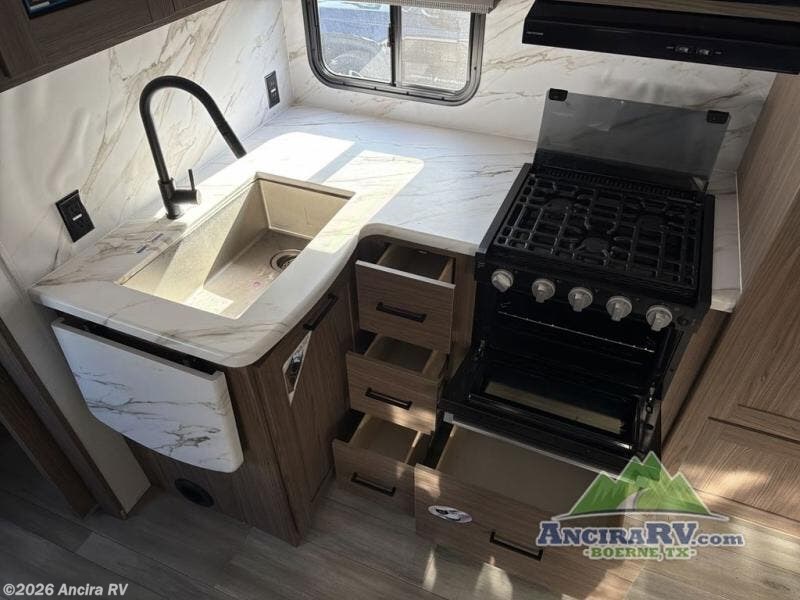 Form and function works together with every one of these Alliance RV Delta travel trailers! They are built with a walk-on roof with a seamless PVC roof covering, Mylar reinforced exterior seals, and a heated and enclosed underbelly to protect your unit in all seasons. The commercial grade vinyl flooring will be easy to clean and the oversized atrium windows throughout let in plenty of natural sunlight. With 62 cu. ft. of drop frame pass-through storage, you can bring along all of your essential camping gear plus it has USB charging for more convenience. There are many at home interior conveniences including a Bluetooth speaker, USB charging throughout, and even a pull-out kitchen trash can. Come find your favorite model today!