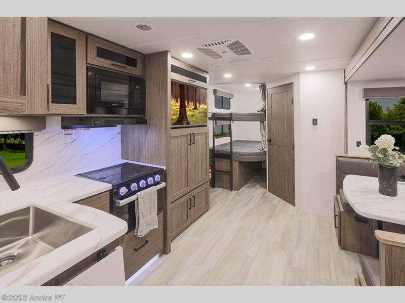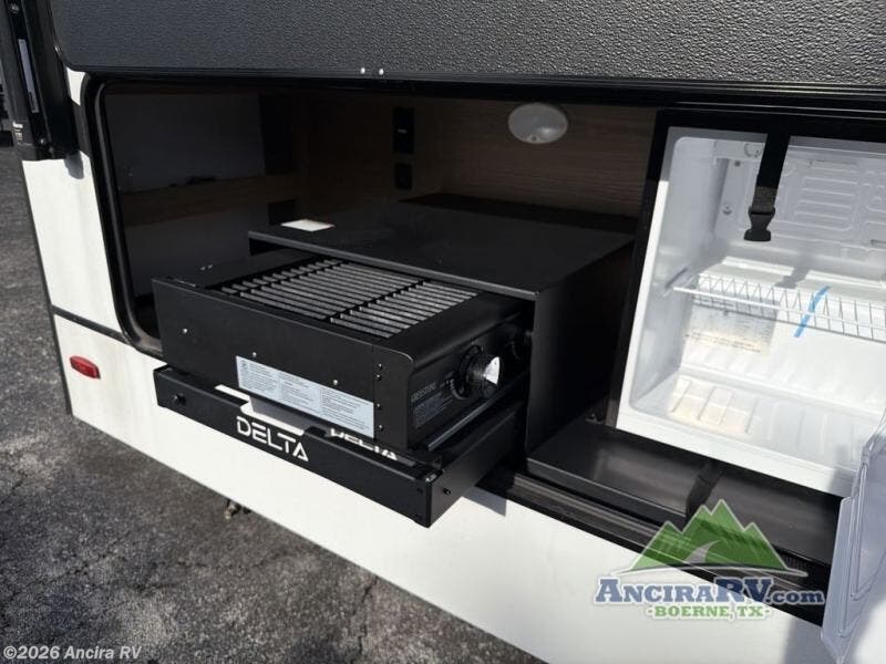Sleeping for eight is easy in this new Delta travel trailer with a set of 46" x 75" rear corner bunks, a queen bed in the front private bedroom, and a U-shaped dinette. The front bedroom features plenty of storage with large overhead cabinets as well as within bedside wardrobes and nightstands for your personal items. You can easily prepare all of your favorite meals and snacks with the kitchen amenities provided. A three burner range allows you to easy cook indoors, or you can enjoy cooking outside using the outdoor griddle/grill if you like. There is a 10 cu. ft. 12V refrigerator to keep all of your perishables and drinks nice and cold, plus a large sink for dishes and cleaning up, as well as a pull-out trash can and flip-up counter extension. You will also appreciate the rear corner bath featuring a 30" x 36" shower, vanity with sink, and soft close porcelain toilet with foot flush.