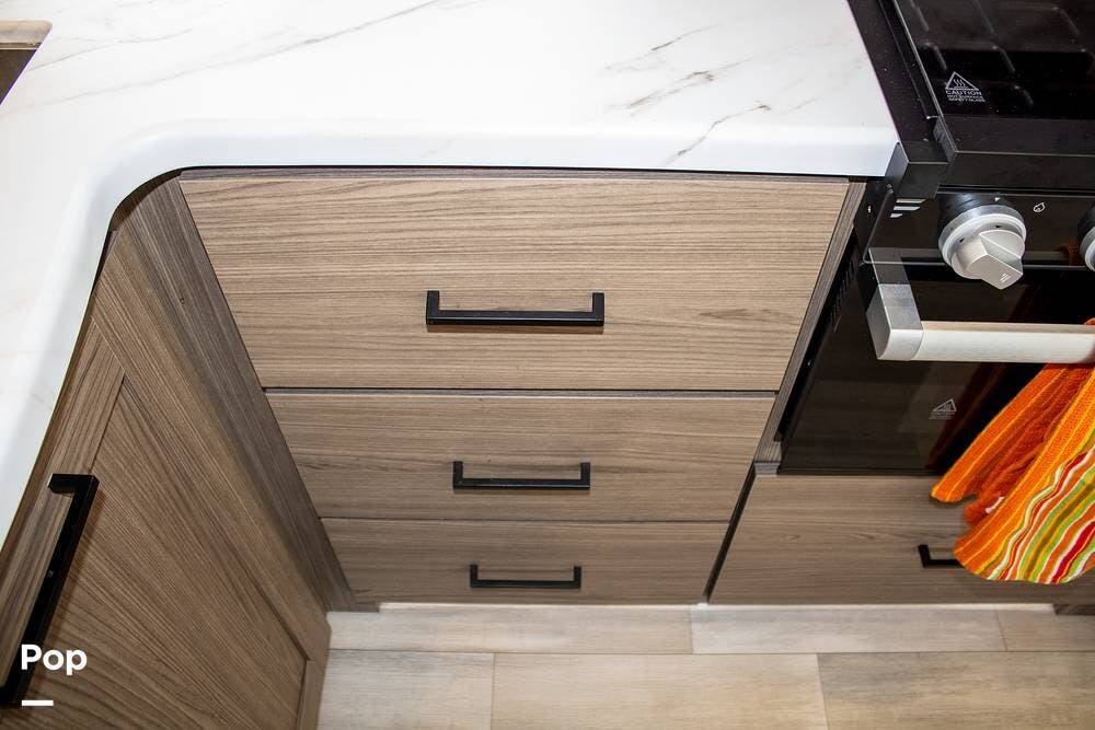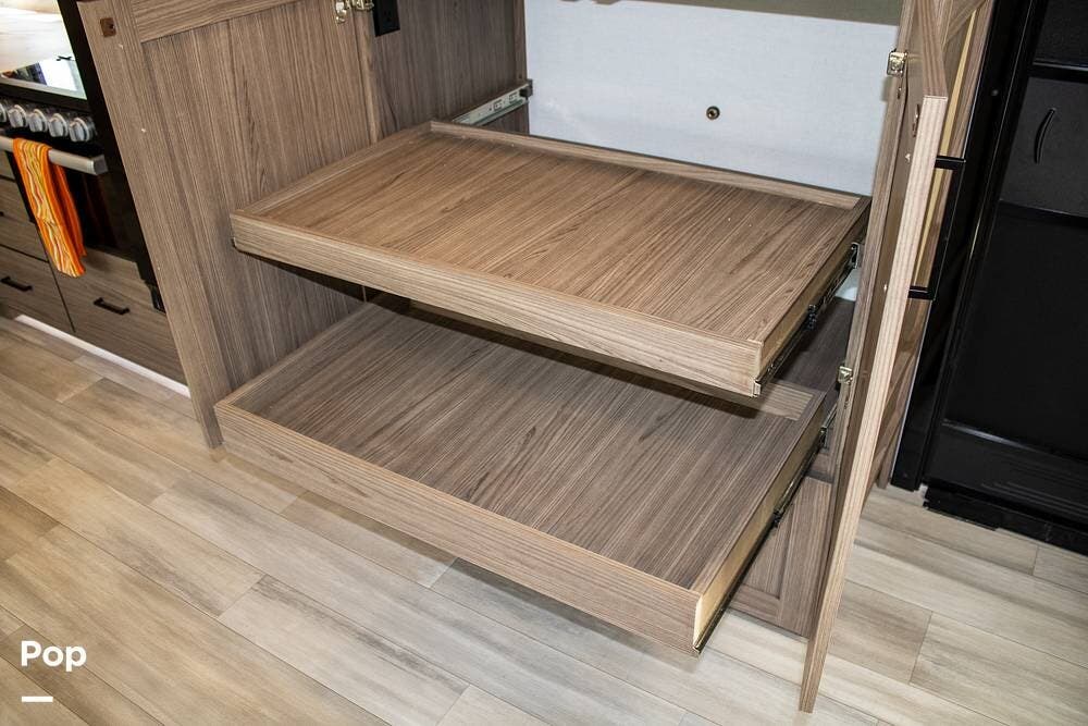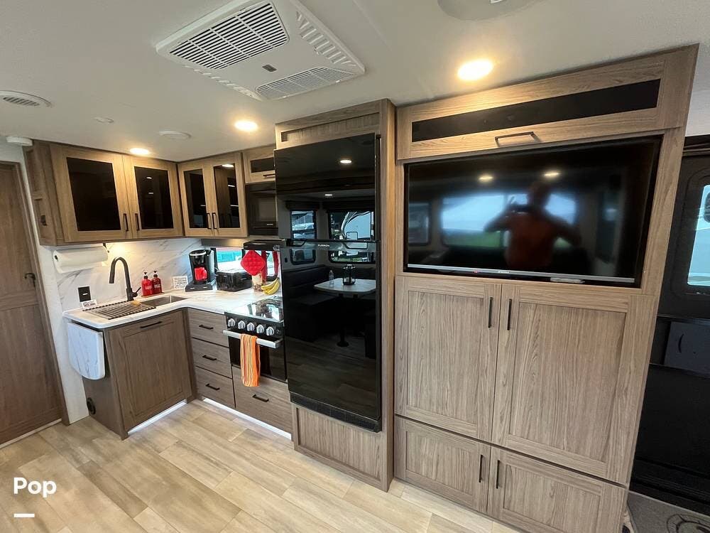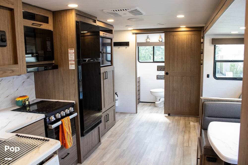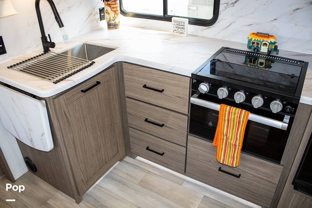 The kitchen includes a 10 cu. ft. 12V fridge, oven, 3-burner cooktop, microwave, and a large sink. There's also a pantry with good shelf depth.