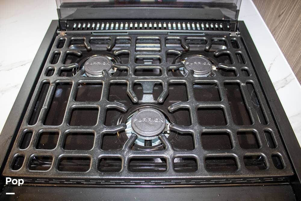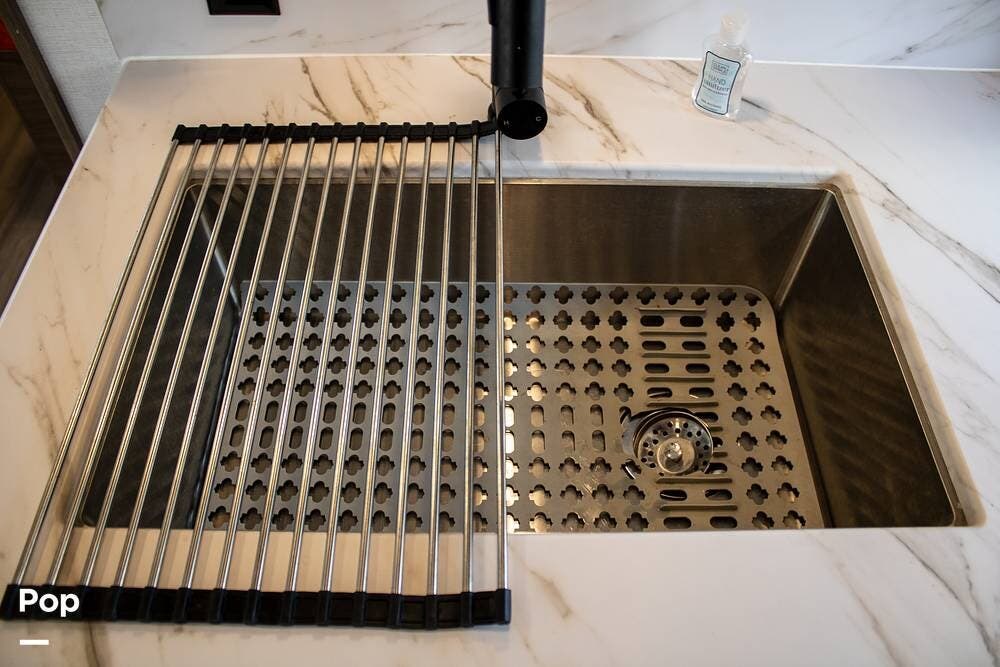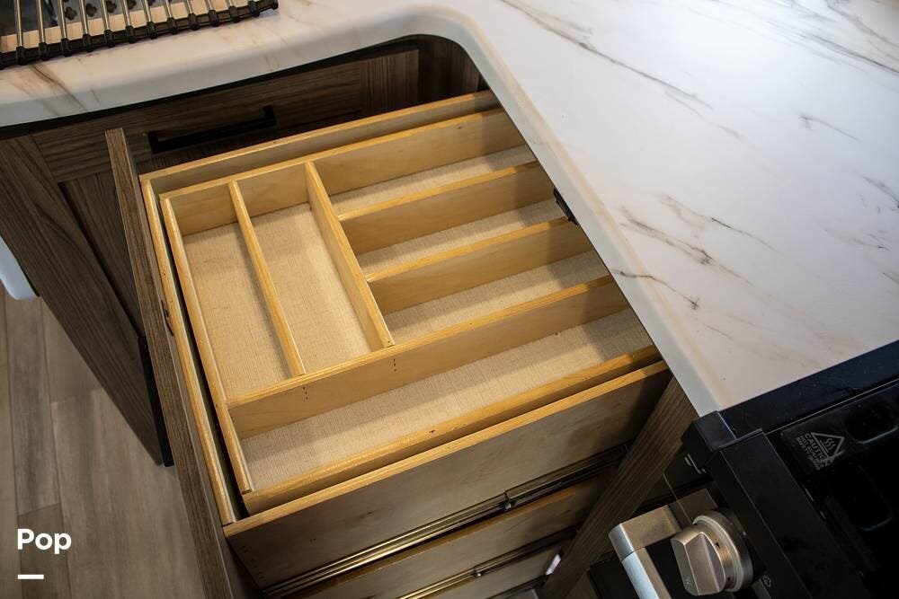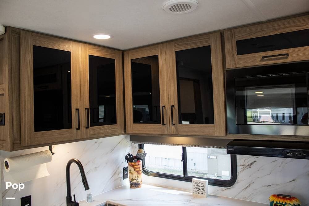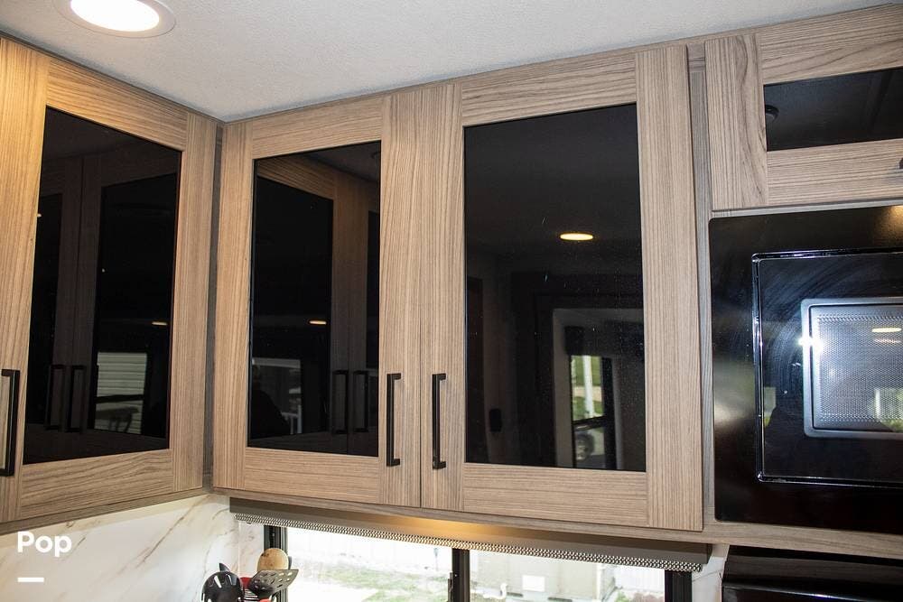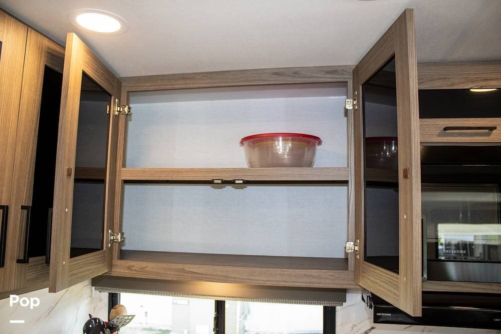 The kitchen includes a 10 cu. ft. 12V fridge, oven, 3-burner cooktop, microwave, and a large sink. There's also a pantry with good shelf depth.