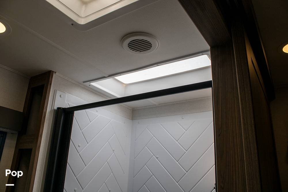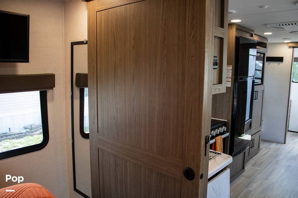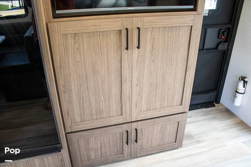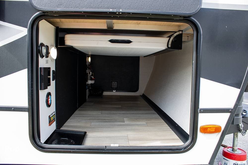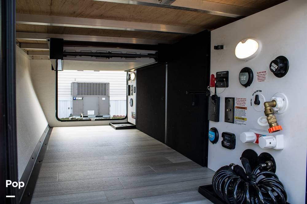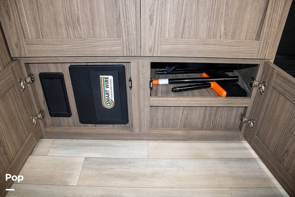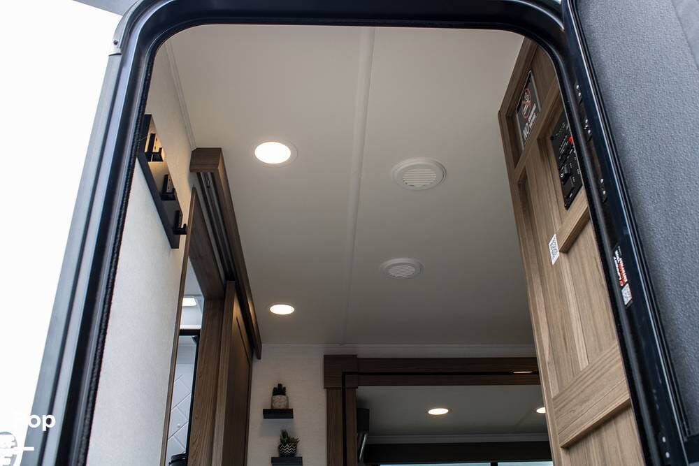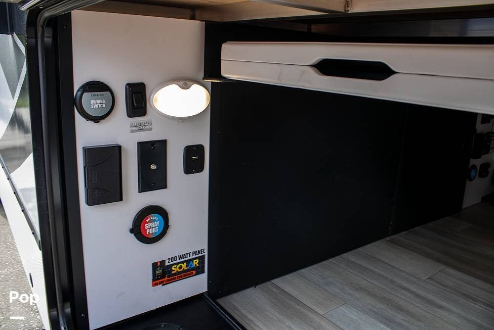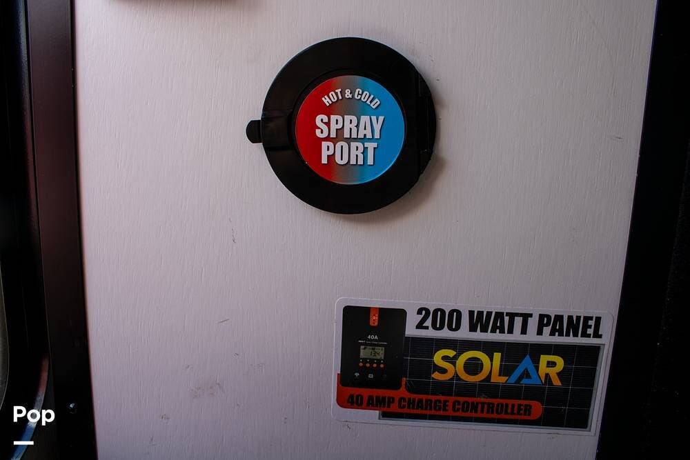 Outside, it's set up with a power awning, rear ladder, Extra Deep pass-through storage, and a side gas hookup for grilling. This one comes with the factory solar package, including a 400W panel, MPPT controller, and inverter, already in place. No generator is needed if you're off the grid for a bit.