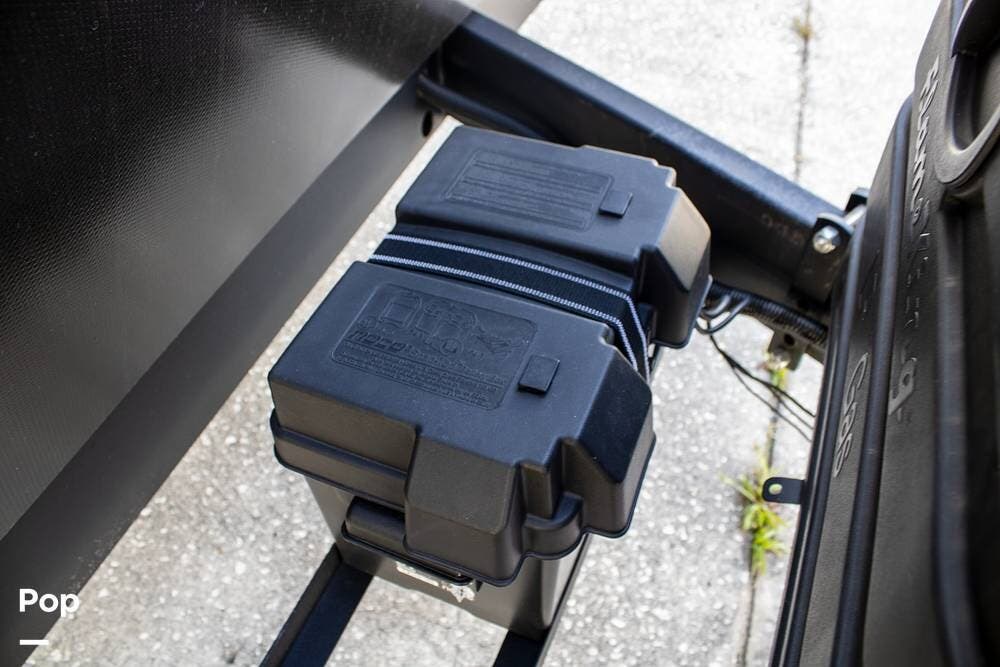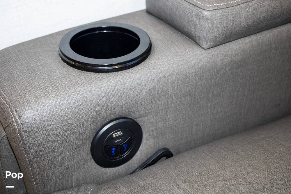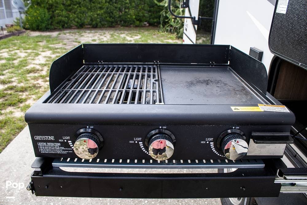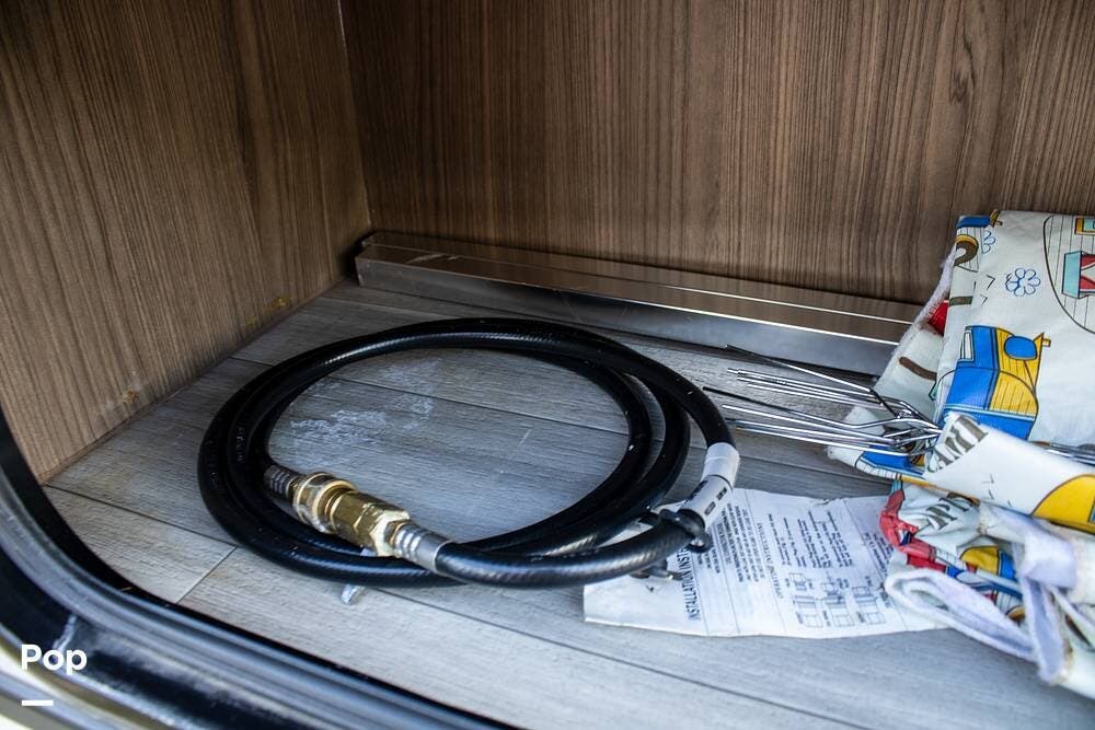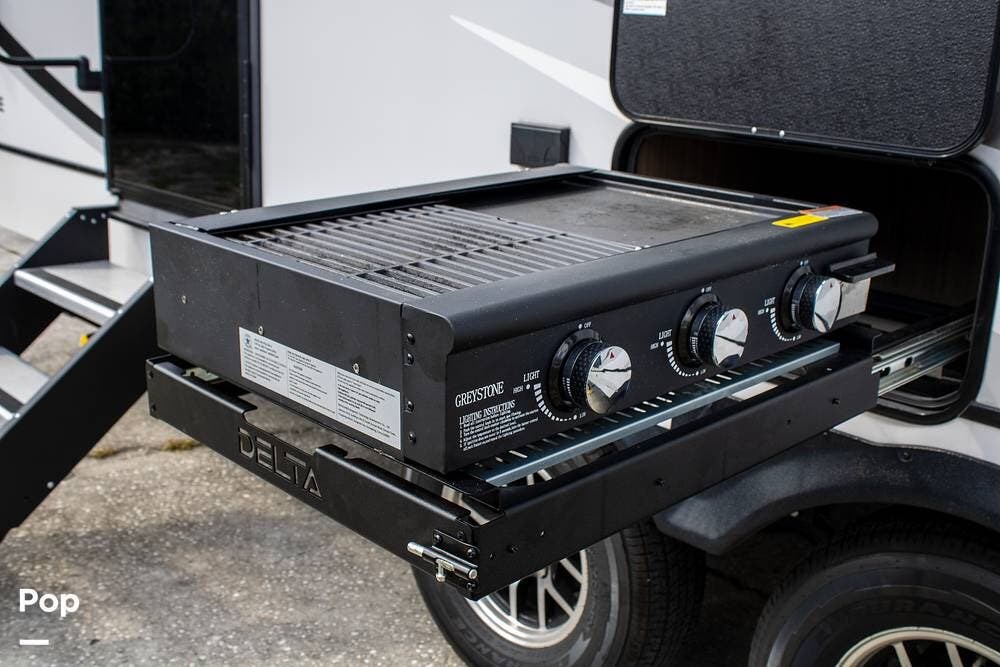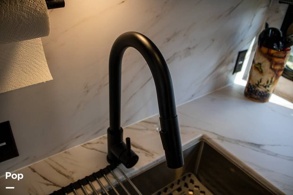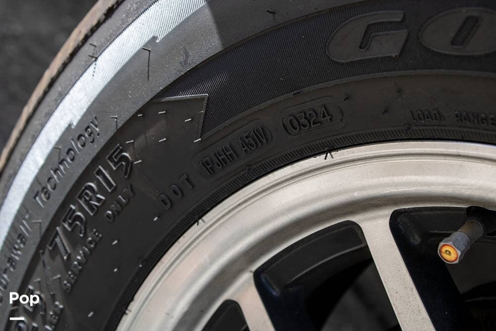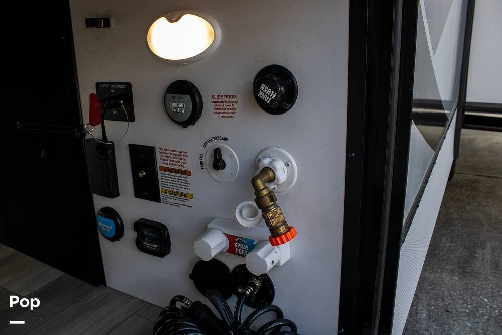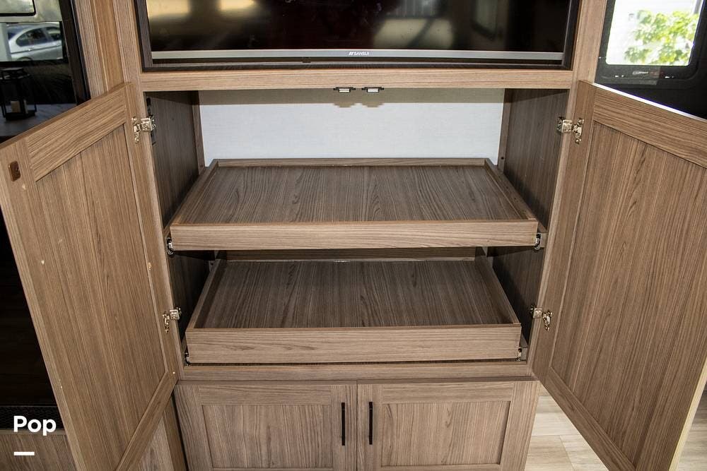 Outside, it's set up with a power awning, rear ladder, Extra Deep pass-through storage, and a side gas hookup for grilling. This one comes with the factory solar package, including a 400W panel, MPPT controller, and inverter, already in place. No generator is needed if you're off the grid for a bit.