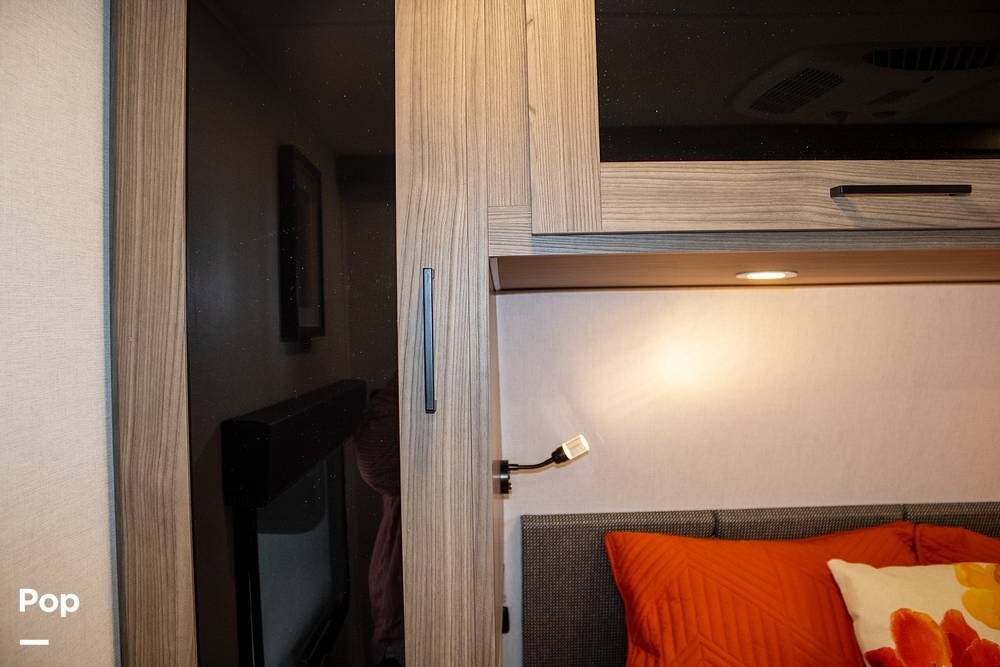 Up front, there's a private queen bedroom with cabinet space, under-bed storage, and outlets with USB ports on both sides. A second TV is mounted in the bedroom, which is a nice addition.