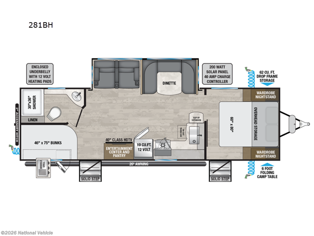The Delta 281BH features a private front bedroom with a walk-around queen bed and dual wardrobes, while the rear double-over-double bunk beds provide generous sleeping space for kids or guests. The open living area boasts a large U-shaped dinette and a theater seating, both conveniently placed across from the entertainment center. A fully equipped kitchen with a 3-burner cooktop, oven, microwave, and 10 cu. ft. refrigerator makes mealtime on the road a breeze.