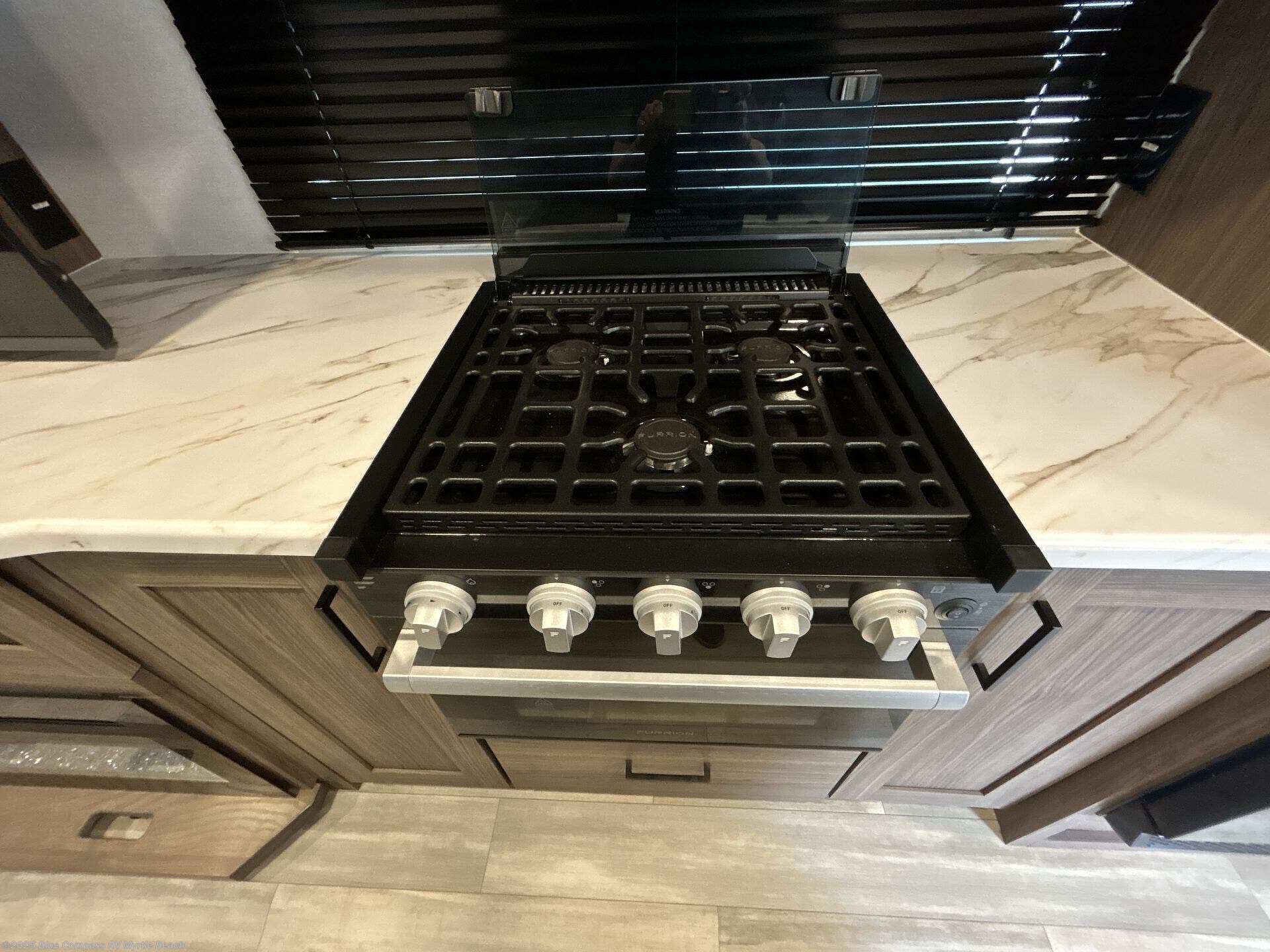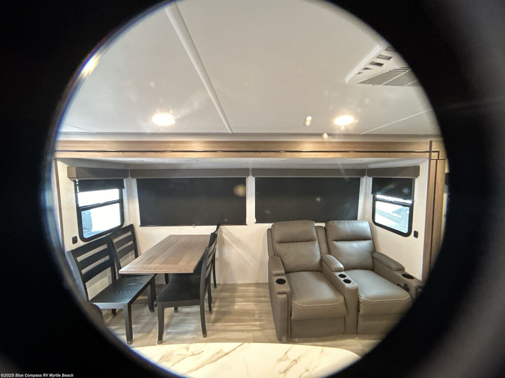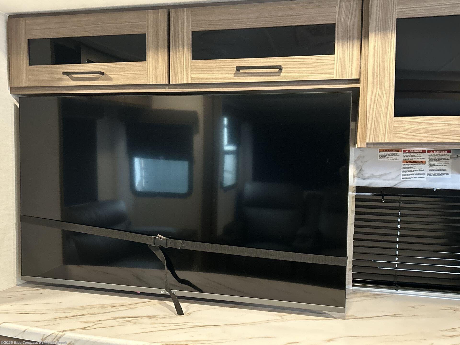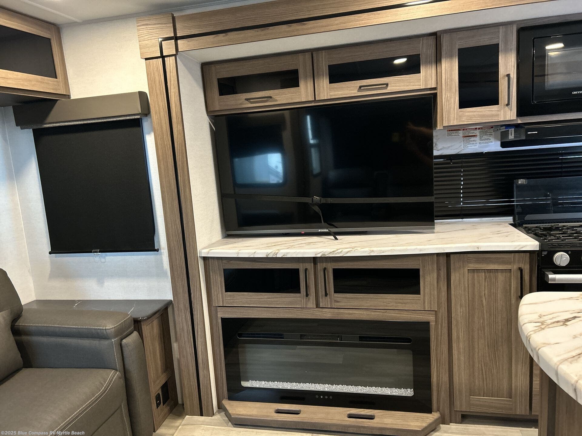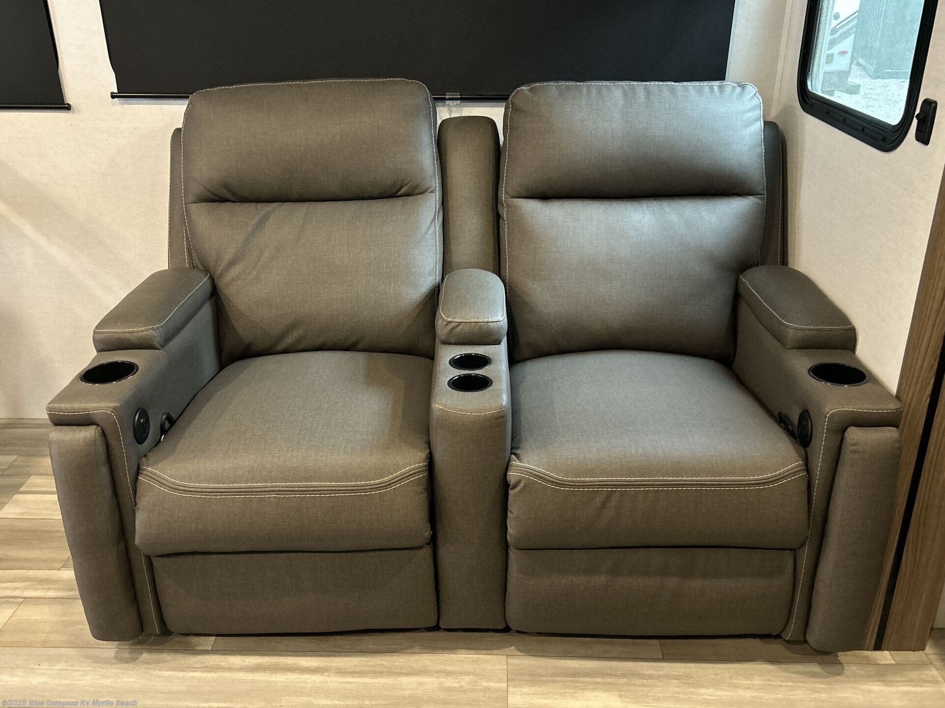 You will feel right at home camping in this travel trailer! The rear living area has a rear sofa and a set of theater seating conveniently across from the entertainment center with a 50" class HDTV above a pull-out fireplace storage for a cozy evening indoors. Prepare your best home cooked meals with the three burner cooktop, kitchen island which even has a tip-out trash can, and 10 cu. ft. 12V refrigerator. Enjoy your meals at the free standing dinette then either freshen up in the full bathroom with the 30" x 36" shower or head outside to relax under one of the two awnings. The front private bedroom has a queen bed for you to lay your head on at night and has wardrobe nightstands for your items!