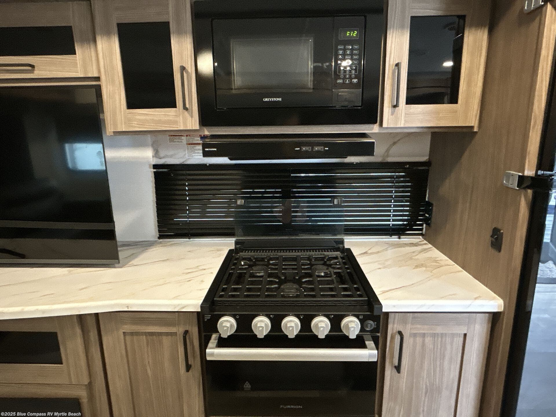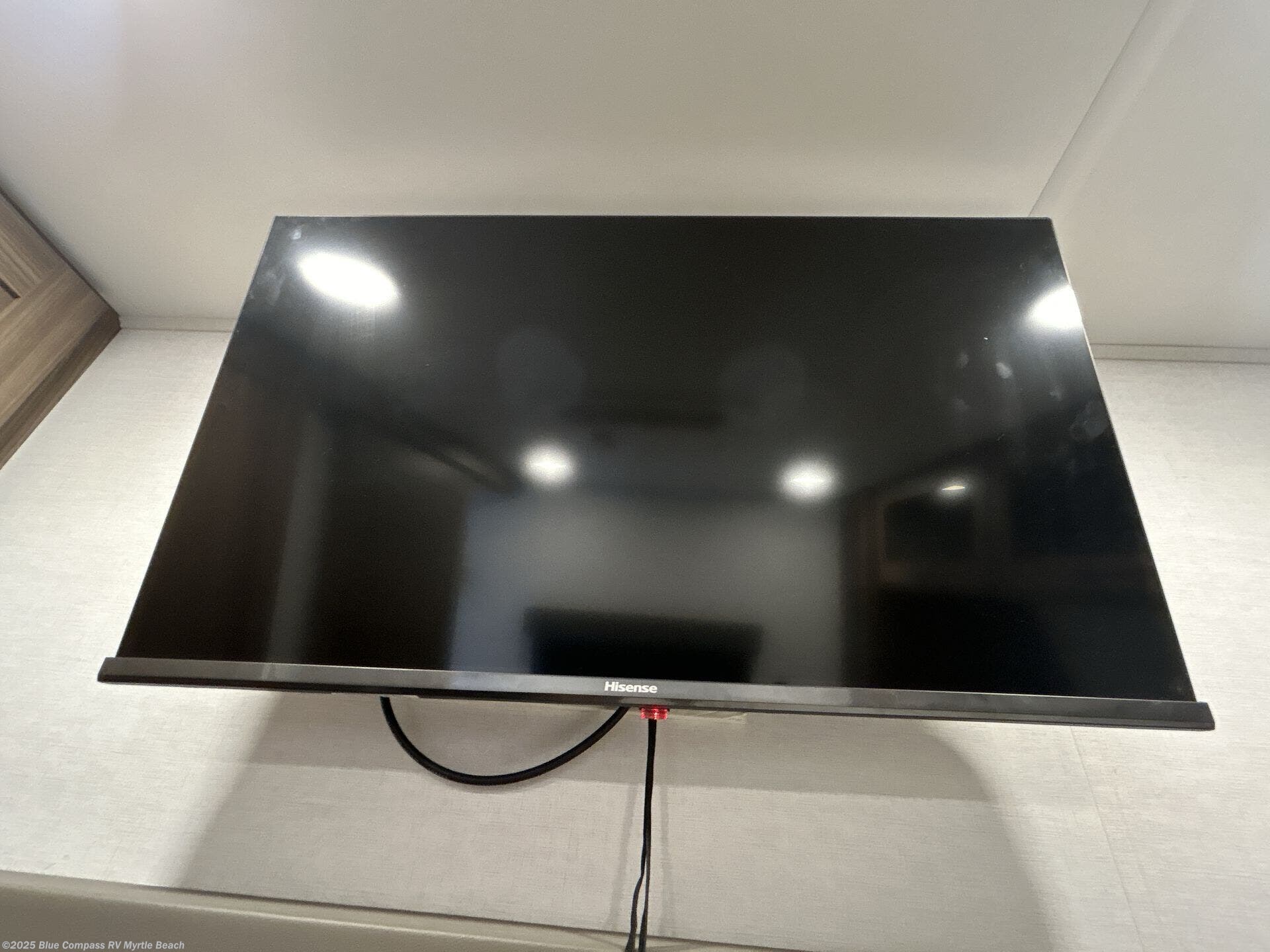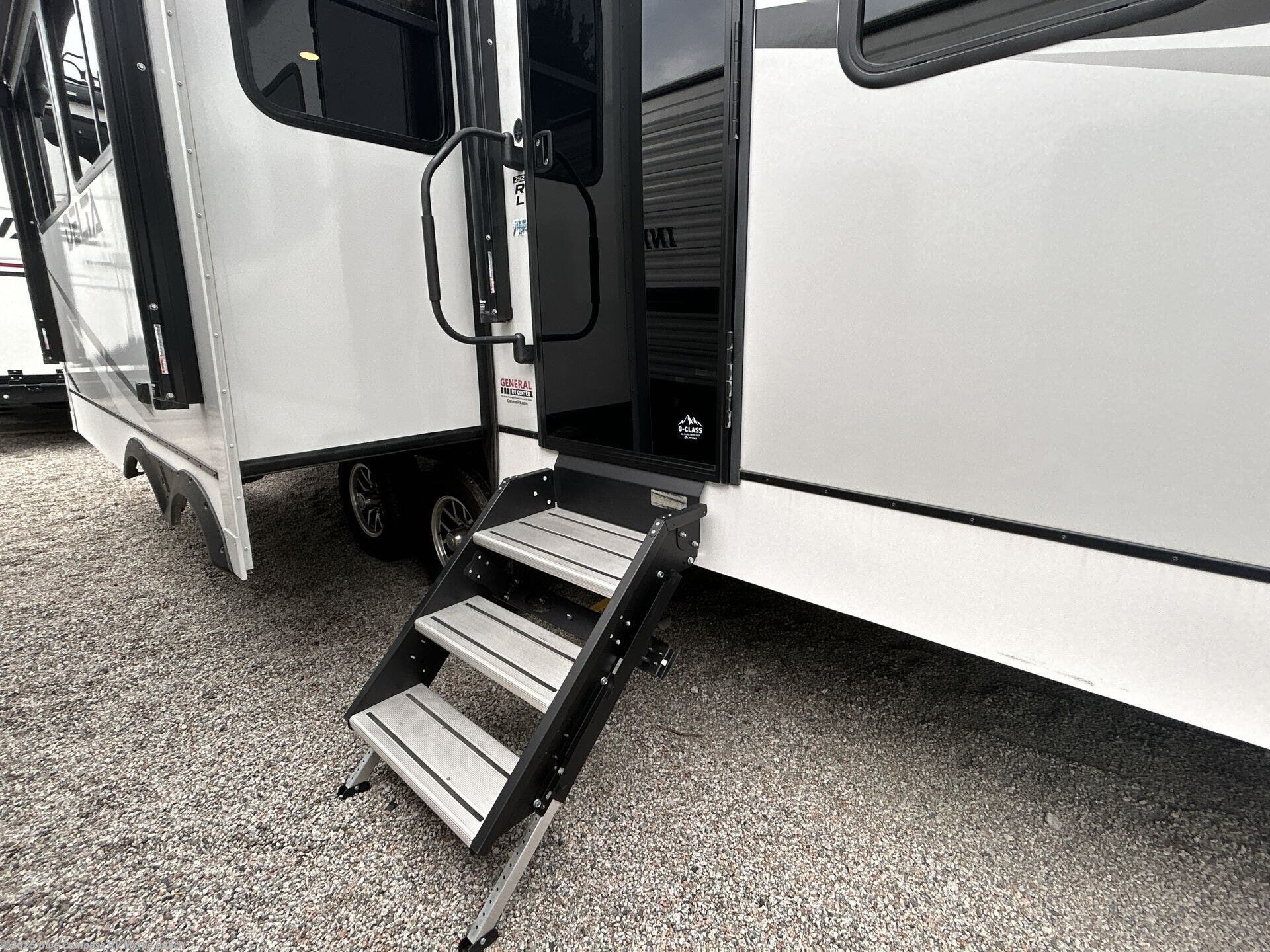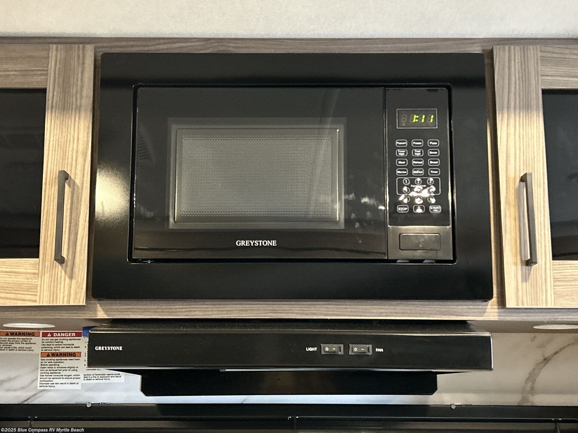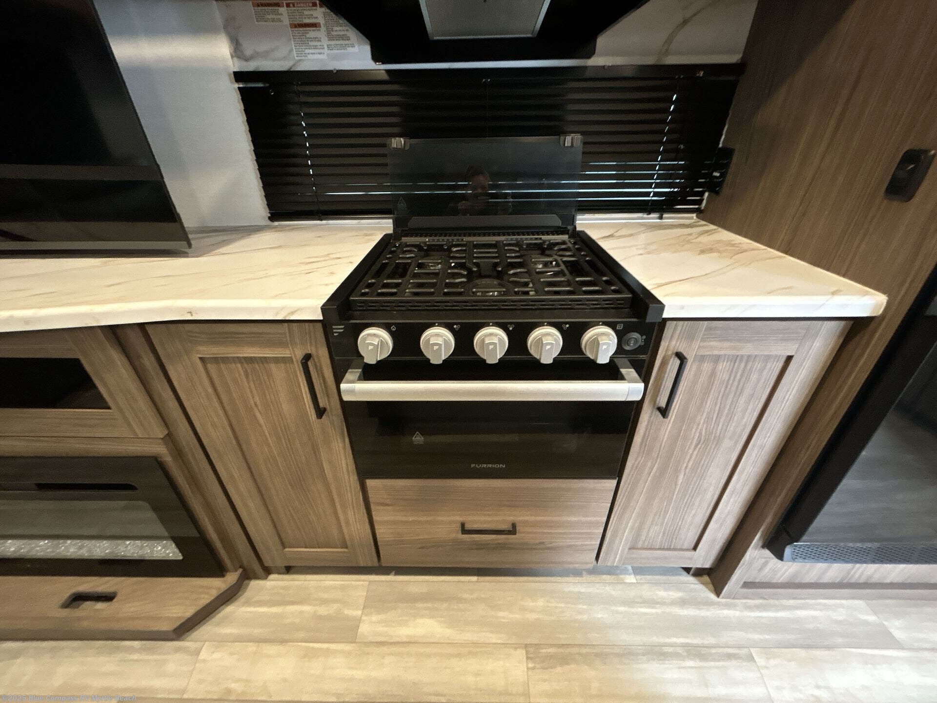 You will feel right at home camping in this travel trailer! The rear living area has a rear sofa and a set of theater seating conveniently across from the entertainment center with a 50" class HDTV above a pull-out fireplace storage for a cozy evening indoors. Prepare your best home cooked meals with the three burner cooktop, kitchen island which even has a tip-out trash can, and 10 cu. ft. 12V refrigerator. Enjoy your meals at the free standing dinette then either freshen up in the full bathroom with the 30" x 36" shower or head outside to relax under one of the two awnings. The front private bedroom has a queen bed for you to lay your head on at night and has wardrobe nightstands for your items!