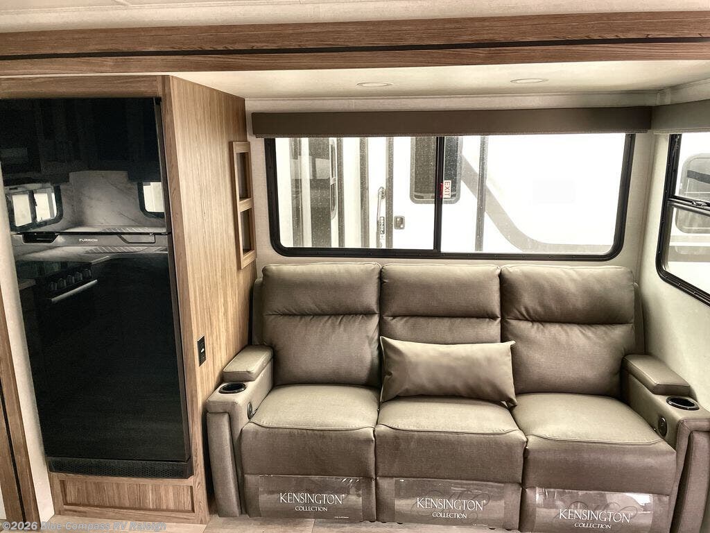Start camping in luxury with this travel trailer! Prepare your best home cooked meals in the rear kitchen with the three burner cooktop, 10 cu. ft. 12V refrigerator, tip-out trash can, and even two bar stools to enjoy your morning coffee while reading the newspaper. Freshen up in the full bathroom with the 30" x 36" shower or head outside to relax under one of the two awnings. There is even an outdoor griddle/grill underneath one of the awnings to protect you while you grill up some juicy burgers, plus an outside 32" TV. The front private bedroom has a queen bed for you to lay your head on at night and has wardrobe nightstands for your items. Relax in true comfort each night on one of the two furniture spots in front of the entertainment center with a 50" class HDTV with a fireplace below it!