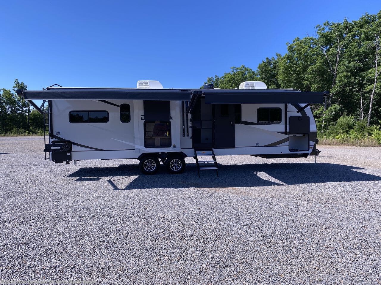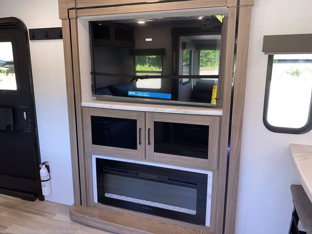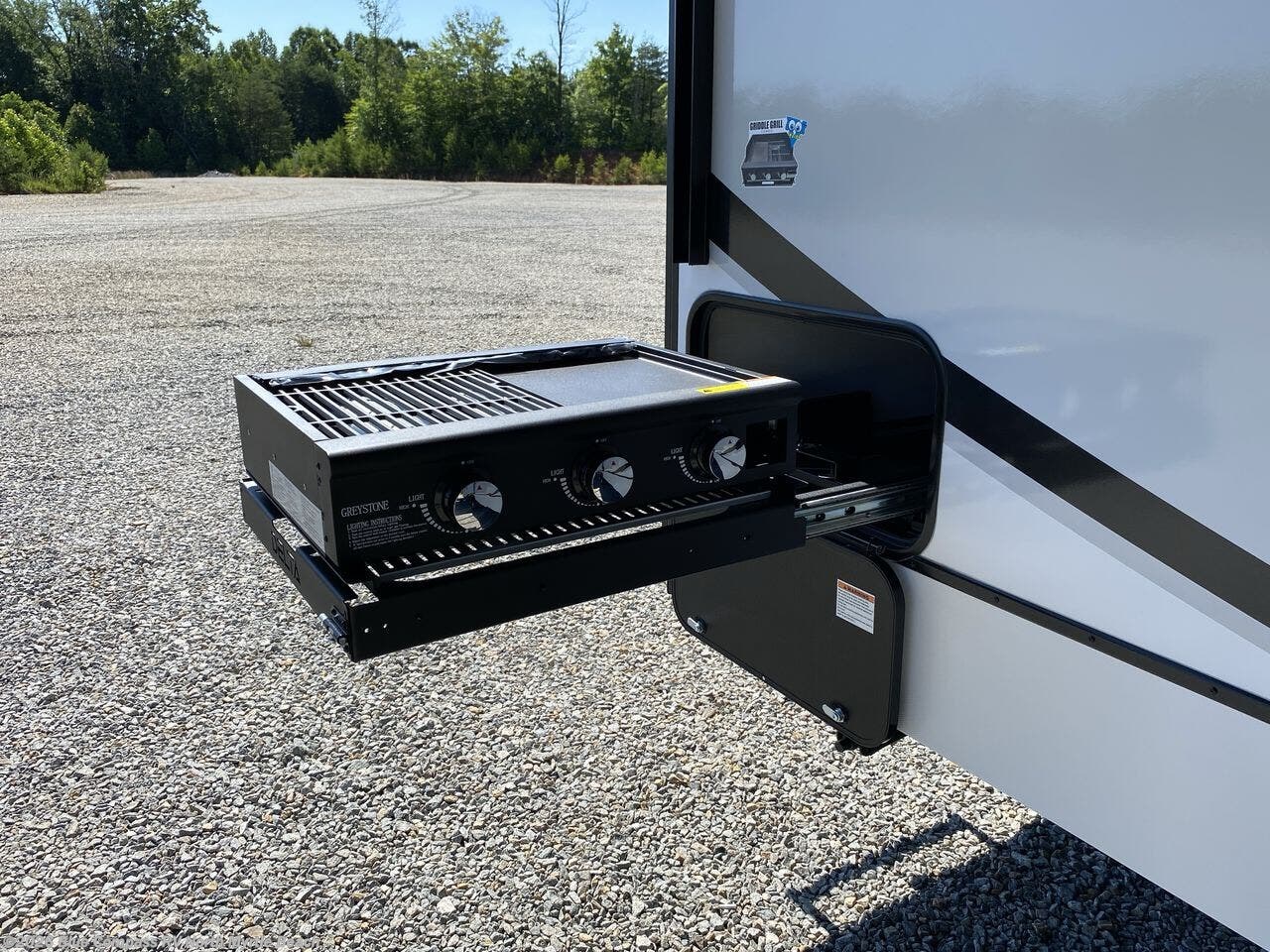 Start camping in luxury with this travel trailer! Prepare your best home cooked meals in the rear kitchen with the three burner cooktop, 10 cu. ft. 12V refrigerator, tip-out trash can, and even two bar stools to enjoy your morning coffee while reading the newspaper. Freshen up in the full bathroom with the 30" x 36" shower or head outside to relax under one of the two awnings. There is even an outdoor griddle/grill underneath one of the awnings to protect you while you grill up some juicy burgers, plus an outside 32" TV. The front private bedroom has a queen bed for you to lay your head on at night and has wardrobe nightstands for your items. Relax in true comfort each night on one of the two furniture spots in front of the entertainment center with a 50" class HDTV with a fireplace below it!