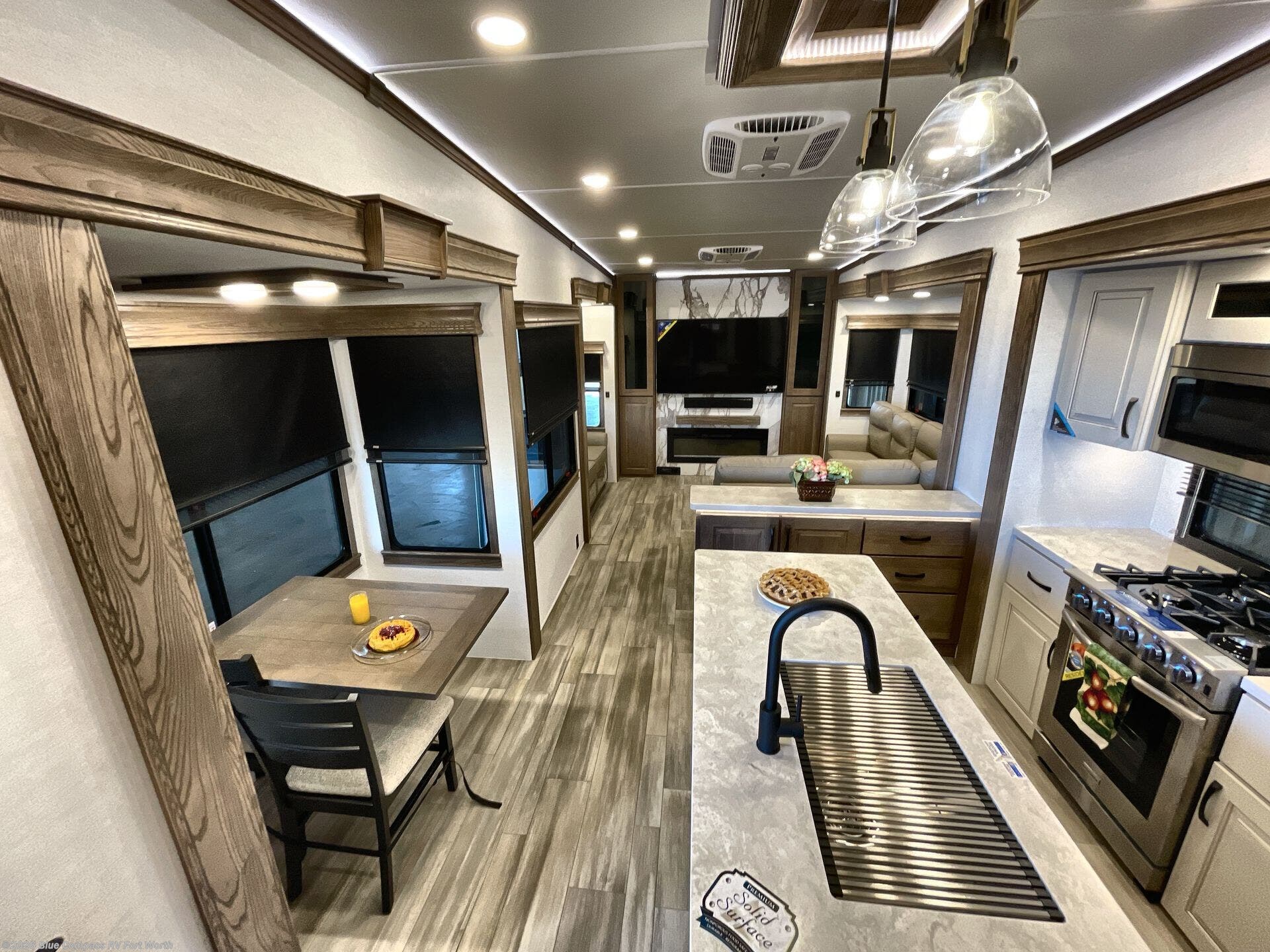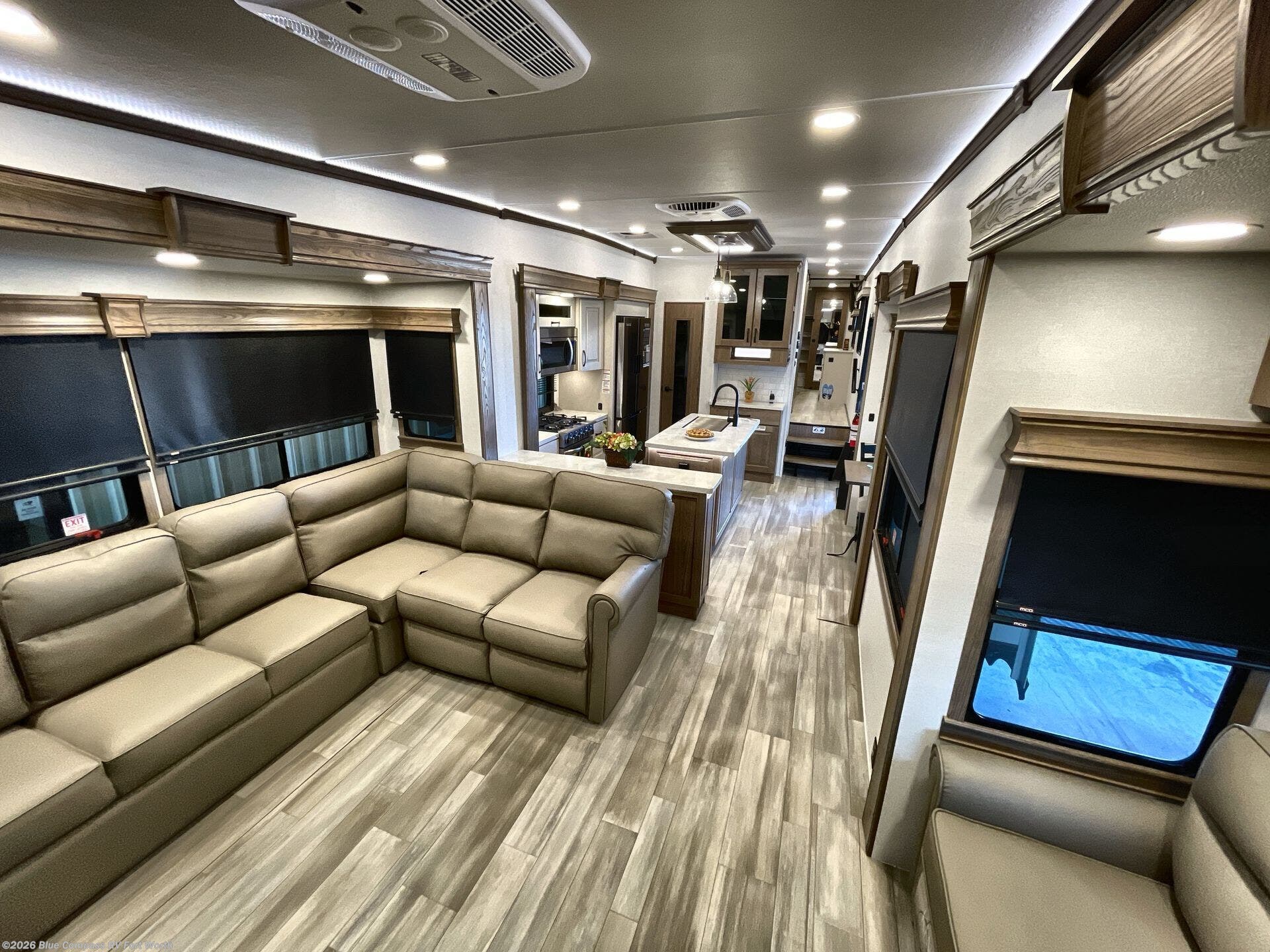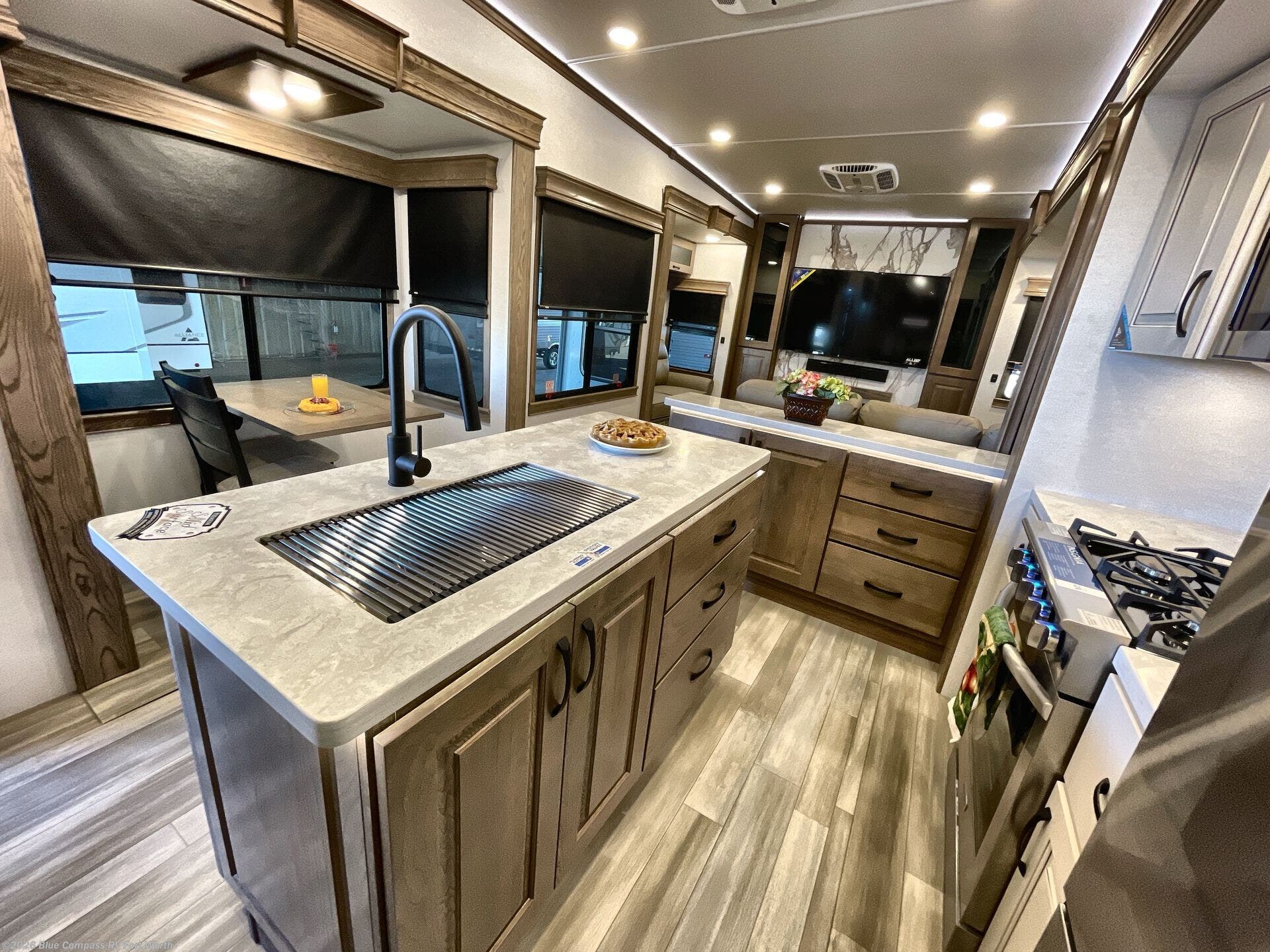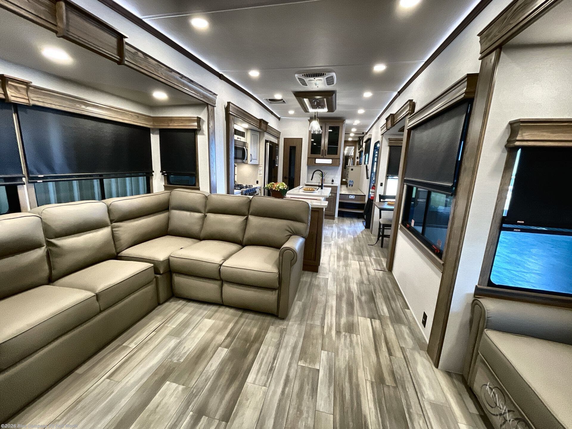 You'll love everything about this luxurious fifth wheel! There are five slide outs so you can enjoy more space than ever, and the rear living area can double as a den for guest. They can sleep on the sleeper sofa or second sofa, and there is a dual recliner across from the 65" Smart TV. The middle kitchen includes a kitchen island with dishwasher prep, generous counter space, a pantry and hutch for storage, and a floating dinette table to dine at! This model also includes a spacious full bath with a large 61" x 30" shower for all-around comfort plus a front private bedroom with a king bed slide out. There is also a walk-in closet with washer and dryer prep, a flip top dresser with a Smart TV, and a seat with storage to keep everything tidy!