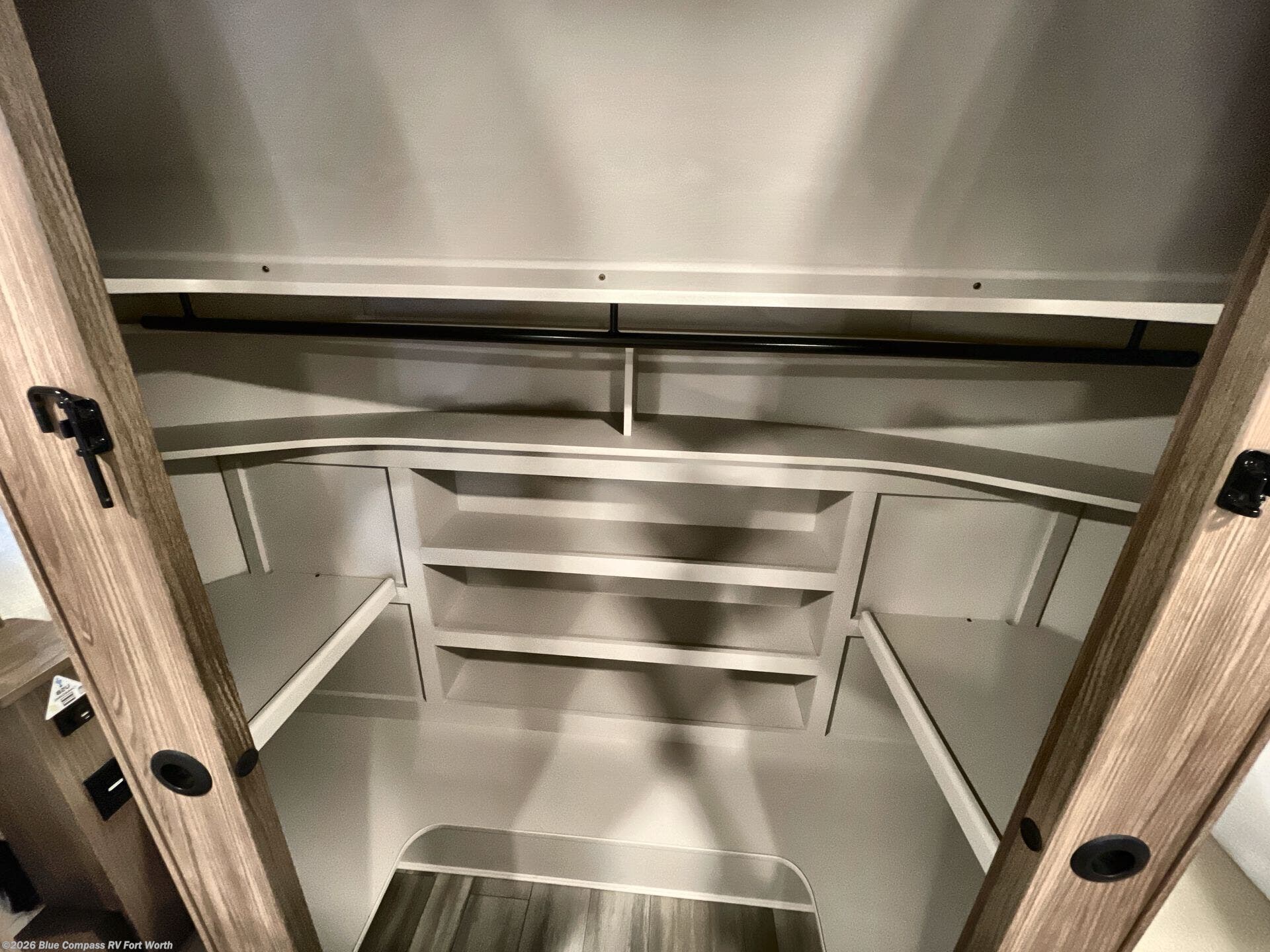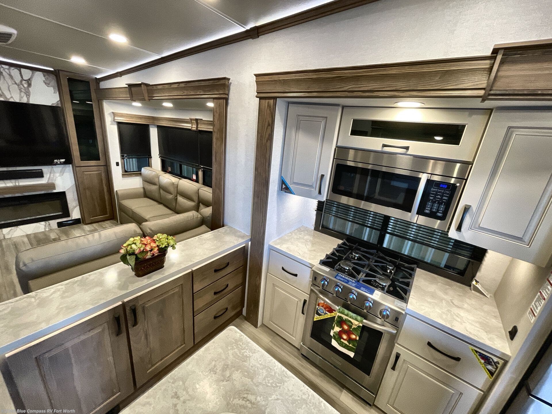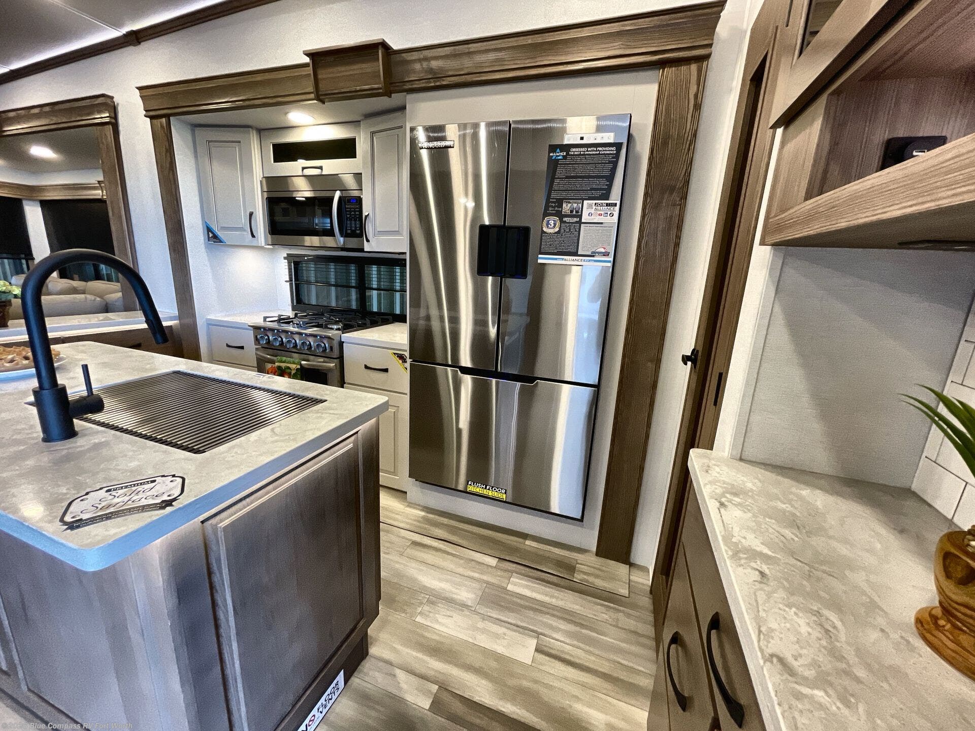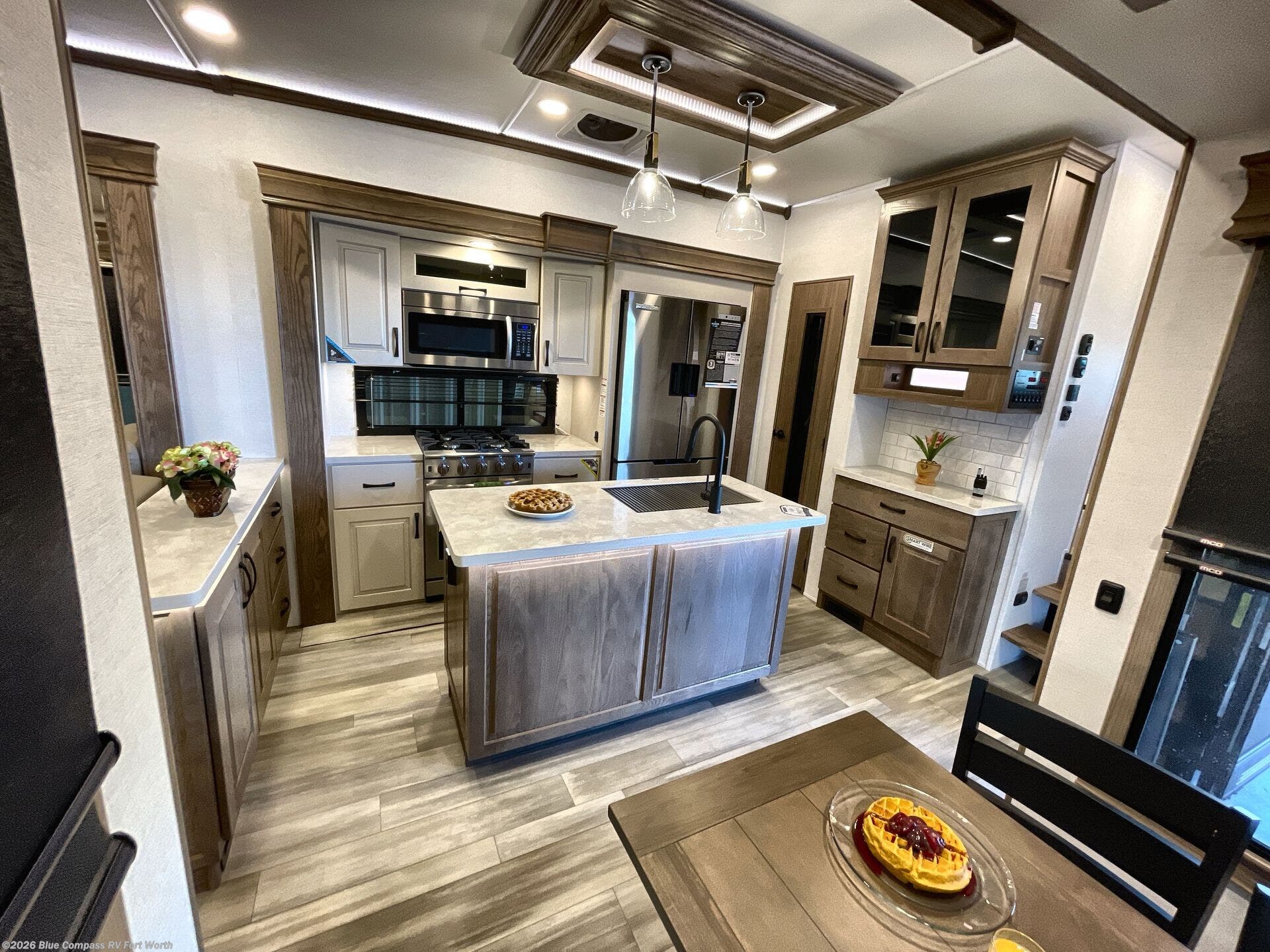 You'll love everything about this luxurious fifth wheel! There are five slide outs so you can enjoy more space than ever, and the rear living area can double as a den for guest. They can sleep on the sleeper sofa or second sofa, and there is a dual recliner across from the 65" Smart TV. The middle kitchen includes a kitchen island with dishwasher prep, generous counter space, a pantry and hutch for storage, and a floating dinette table to dine at! This model also includes a spacious full bath with a large 61" x 30" shower for all-around comfort plus a front private bedroom with a king bed slide out. There is also a walk-in closet with washer and dryer prep, a flip top dresser with a Smart TV, and a seat with storage to keep everything tidy!