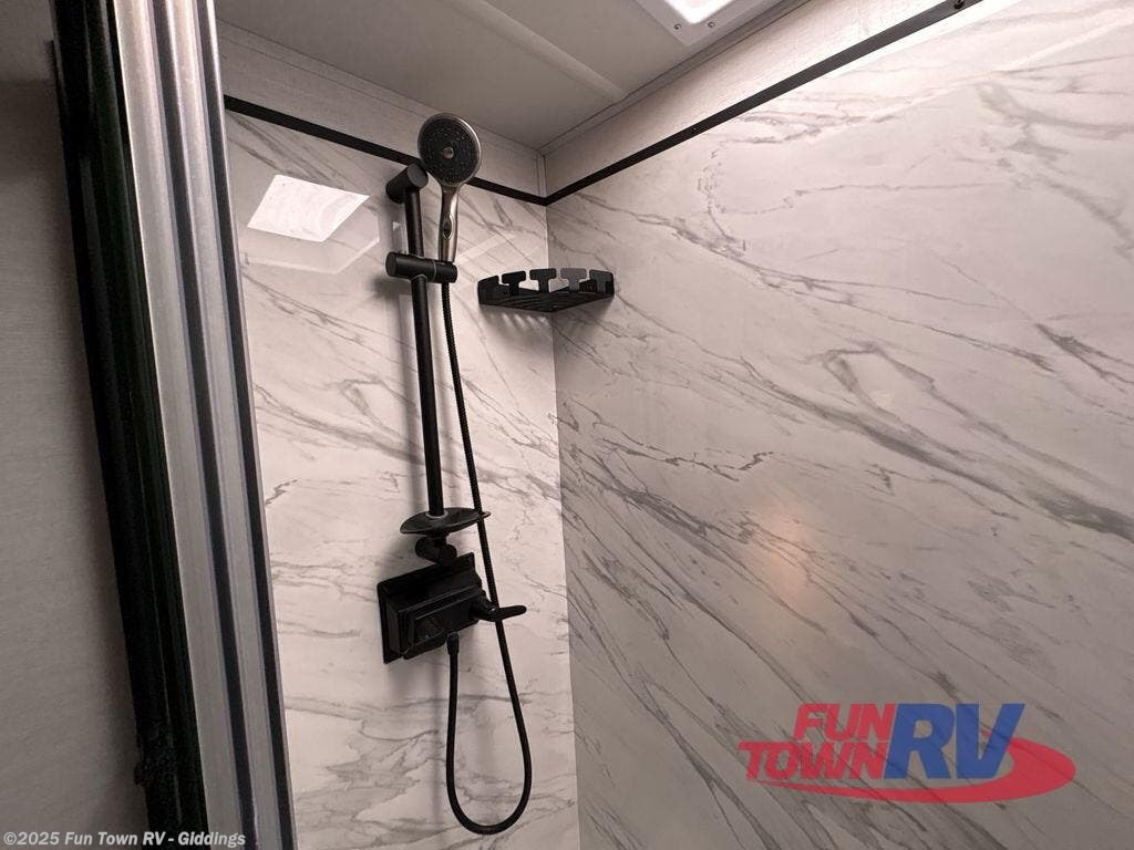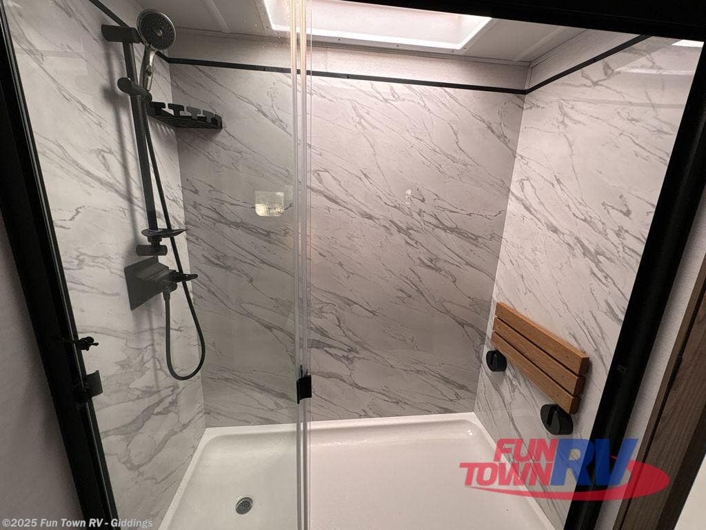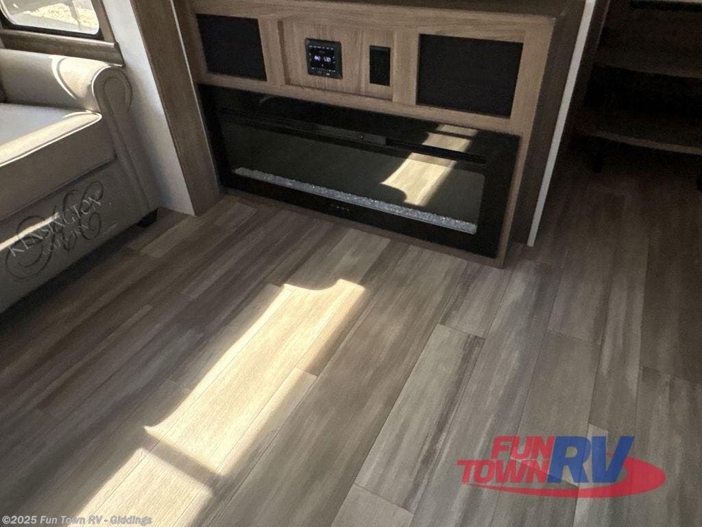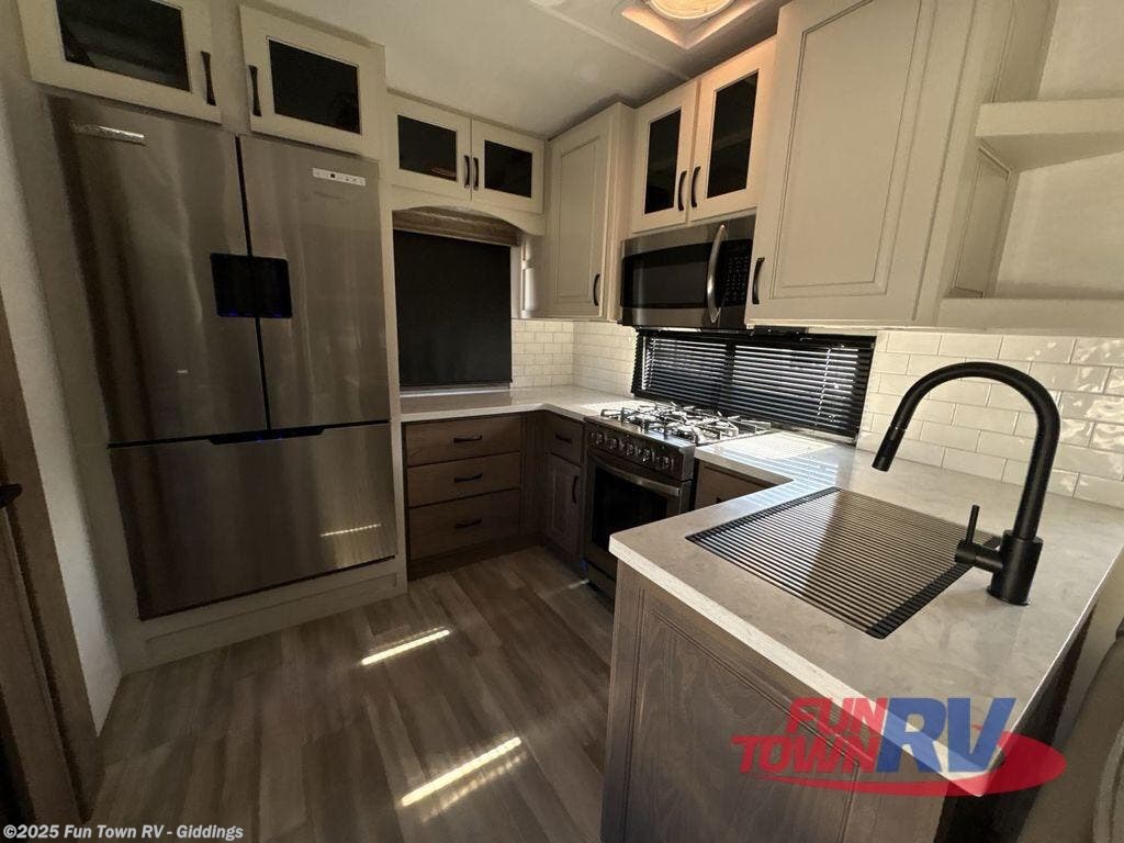 You won't want to camp any other way once you step inside this fifth wheel! the chef will enjoy all of the space in the rear kitchen with ample counter space, a 19 cu. ft. 12 volt residential refrigerator, and a pantry for snacks. Everyone will love to meet in the middle living area that includes dual sleeper sofas and a dual recliner loveseat across from the 50" Smart TV and fireplace. The half bathroom is nearby for quick bathroom breaks too. You will feel right at home in the master suite with a king bed slide to lay your head on at night, a flip top dresser with a Smart TV above it to watch your movies in true comfort, and a seat with storage, plus access to the front full bathroom. Inside the bathroom, you will find a 61" x 30" shower to freshen up in and a walk-in closet with a hamper, shelves, and washer and dryer prep for clean clothes throughout your entire trip!