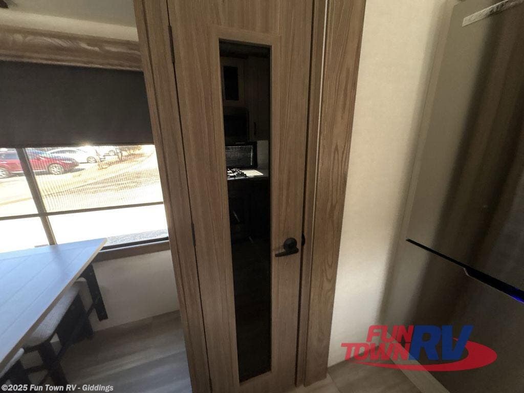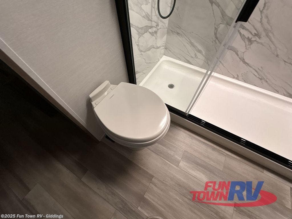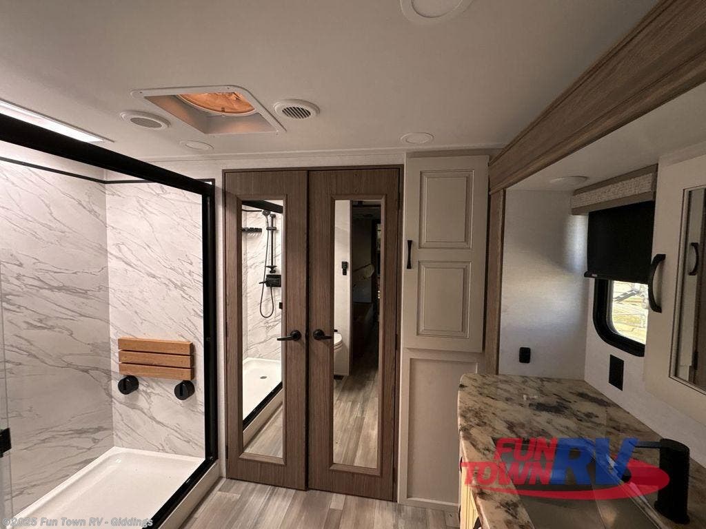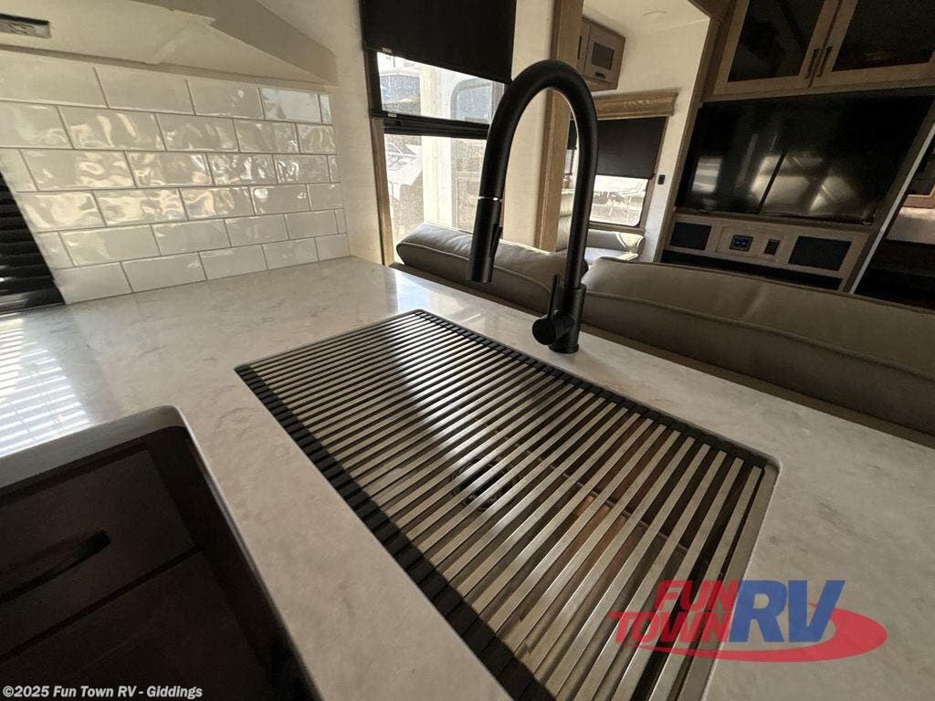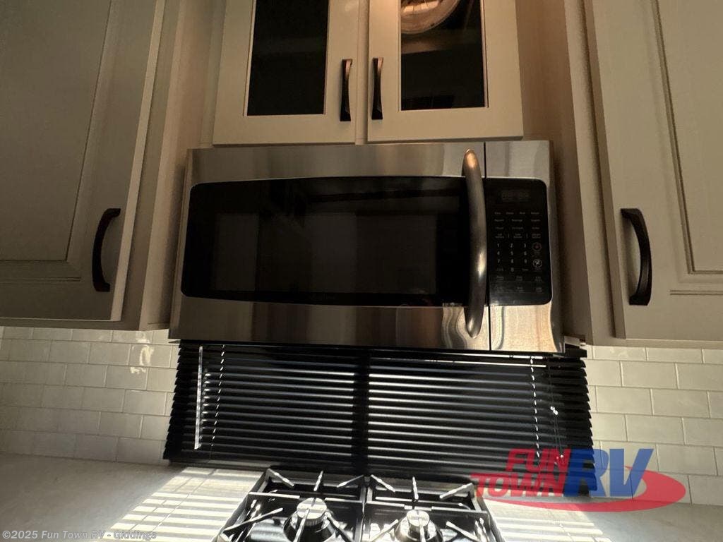 You won't want to camp any other way once you step inside this fifth wheel! the chef will enjoy all of the space in the rear kitchen with ample counter space, a 19 cu. ft. 12 volt residential refrigerator, and a pantry for snacks. Everyone will love to meet in the middle living area that includes dual sleeper sofas and a dual recliner loveseat across from the 50" Smart TV and fireplace. The half bathroom is nearby for quick bathroom breaks too. You will feel right at home in the master suite with a king bed slide to lay your head on at night, a flip top dresser with a Smart TV above it to watch your movies in true comfort, and a seat with storage, plus access to the front full bathroom. Inside the bathroom, you will find a 61" x 30" shower to freshen up in and a walk-in closet with a hamper, shelves, and washer and dryer prep for clean clothes throughout your entire trip!