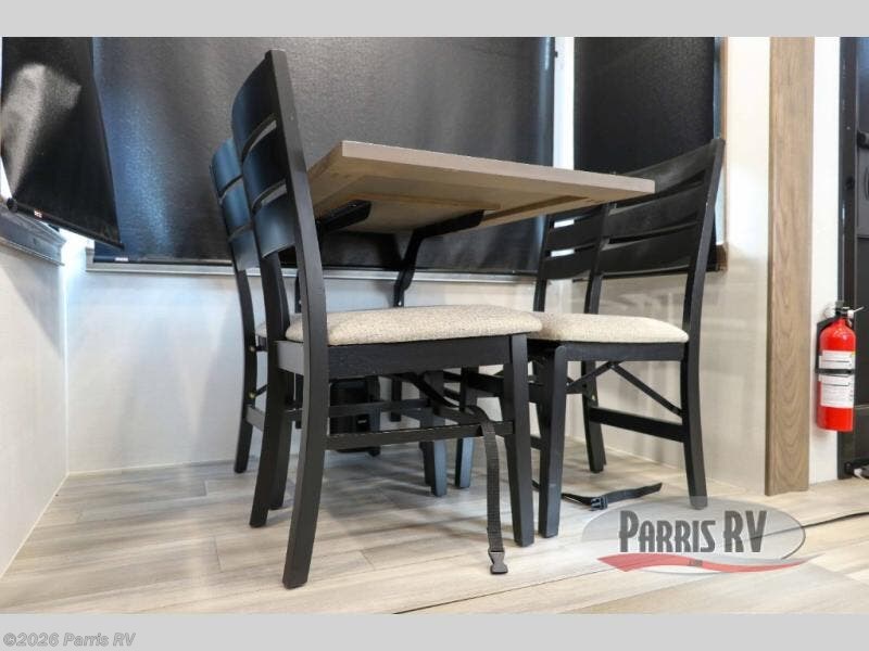 An active family will want this fifth wheel with its 48" x 115" exterior basement pull-out tray for kayaks or extra storage. Just above this area is the master suite with a rear bathroom that offers a residential shower, a porcelain toilet with soft close seat, plus a wardrobe and shelf storage. The king bed slide gives you more floor space, and you will have a seat, a flip-top dresser, and a Smart TV to watch movies in bed. The half bath is next to the main entry which is super convenient, and the middle kitchen is separate from the front living area. The cook will love the residential microwave, range and oven, plus the 19 cu. ft. 12 volt residential refrigerator. There is also a pantry and extra counter space on the kitchen island with a large sink. The views out of the atrium windows in the slide out, which includes the floating dinette table, are a must see. And when you need to watch the big game, the 55" Smart TV with a pull-out fireplace storage are up front with the dual recliner love seat and two sleeper sofas.