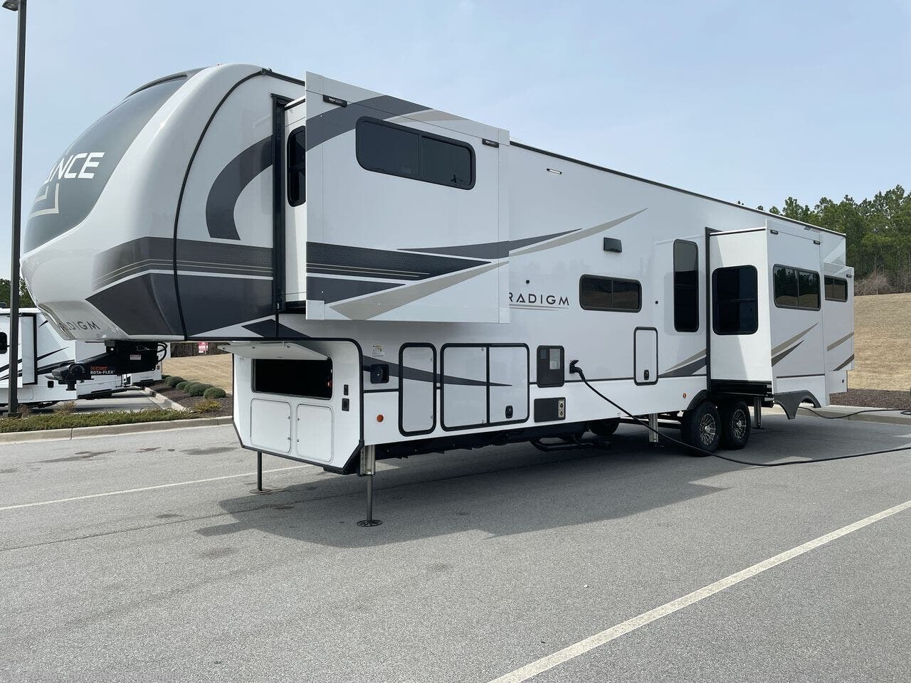 The Paradigm fifth wheels by Alliance RV are functional, high-quality, and luxurious for an unforgettable camping experience. There are three A/C units and a 40K BTU furnace to keep you comfortable year around, and you'll appreciate additional convenient amenities, like the all-in-one enclosed/heated utility center and the color coded and numbered wiring. A Rota-Flex pin box comes standard for hassle-free towing, along with Super-G 4,400 lb. rated tires and Dexter 7,000 lb. axles. You'll love the kitchen with its LG solid surface countertops and Insignia range, plus there is LED motion lighting in the pantry and a Maxx fan with a rain sensor to keep everything fresh when making dinner. Each model also includes an HD Smart TV in the living room and bedroom, plus a Winegard Air 360 antenna to keep you connected to the outside world. And of course there are a variety of options you can choose from to further customize your fifth wheel; dual pane windows, Super Solar Plus, slide out awning toppers, and generator prep or a generator to name a few!