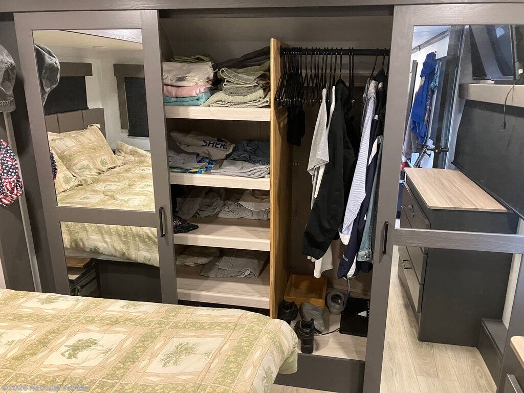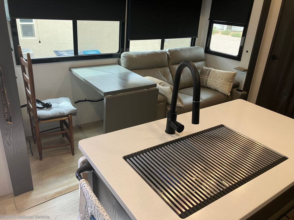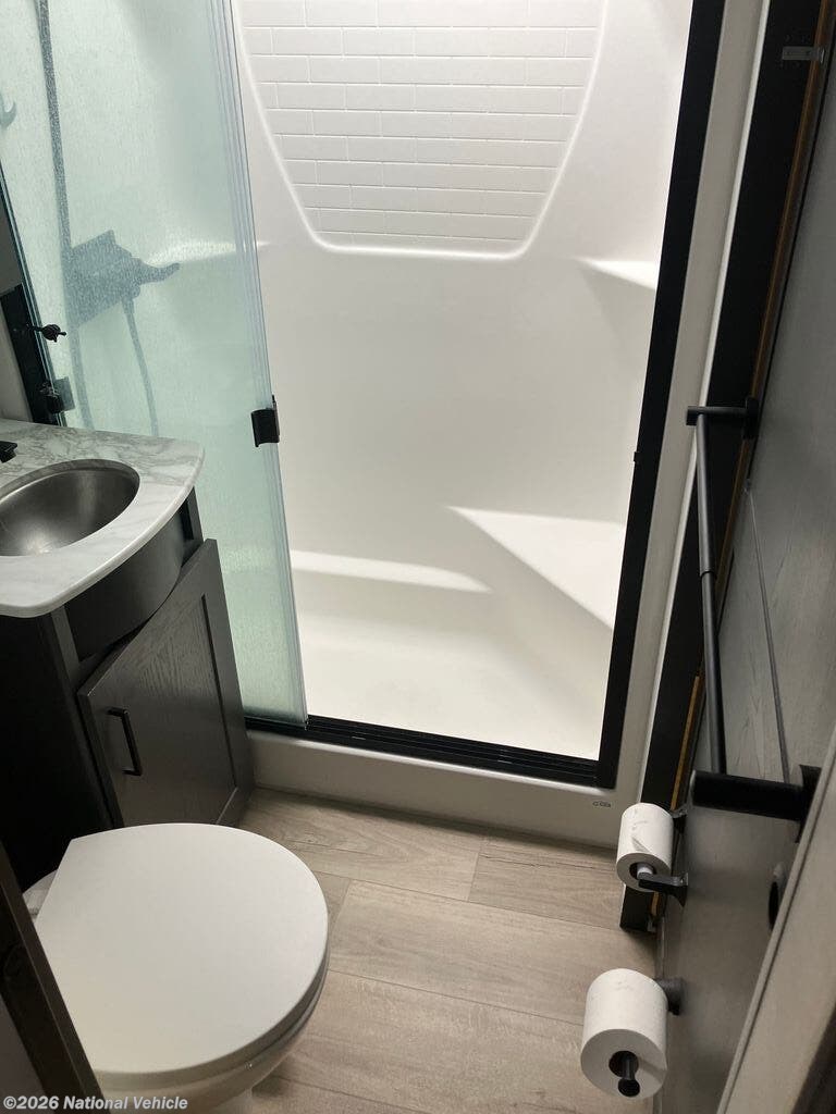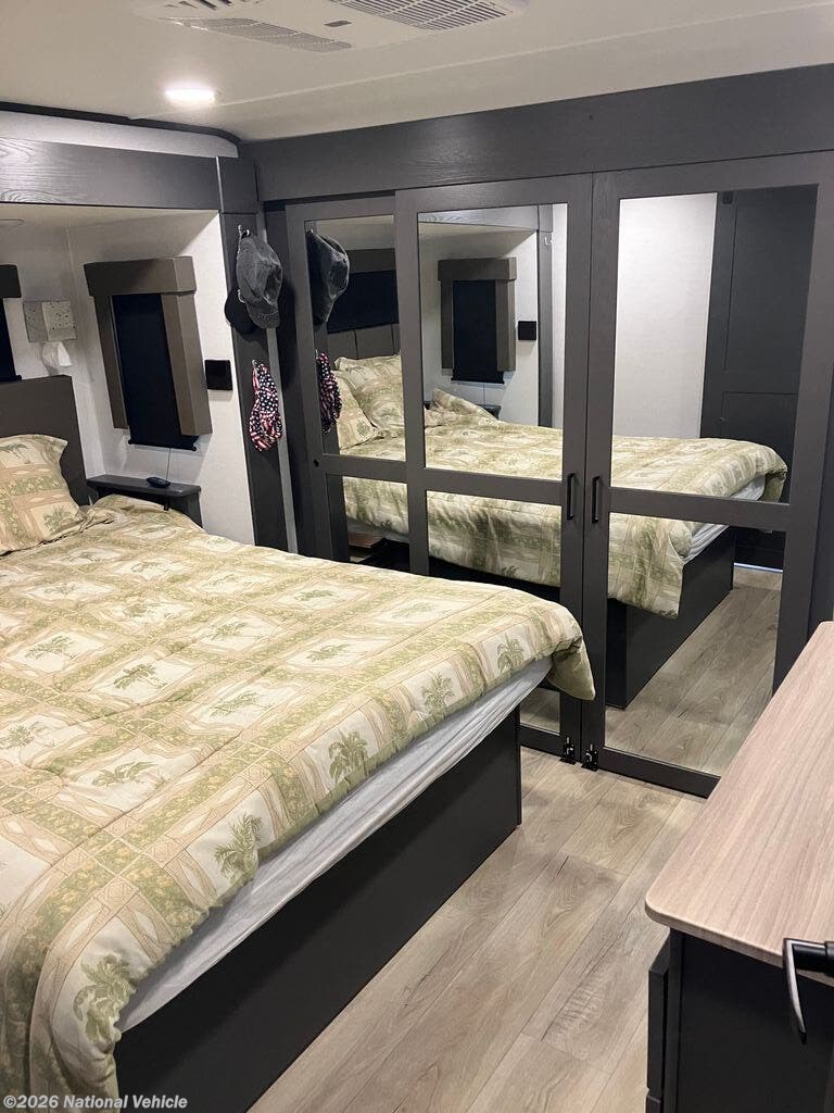 The master suite provides a queen bed, generous wardrobe space, and direct access to a residential-style bathroom with a one-piece shower and premium finishes. Other standout features include dual 13,500 BTU A/C units, a robust heating system, and abundant basement storage. On the exterior, enjoy a massive awning, patio deck system, and a fuel station for your toys?ensuring your adventures never have to stop.
