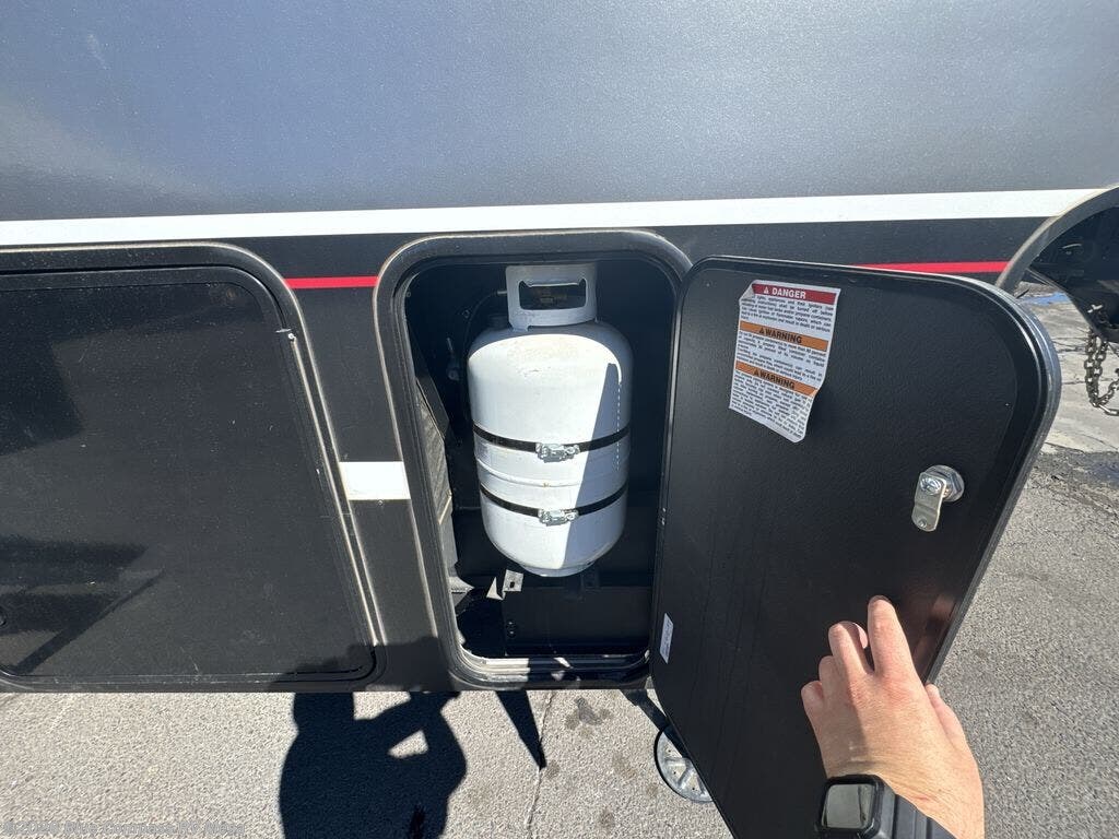 The whole family will have a fun time camping in this toy hauler! You can easily load up your toys into the 11' garage area with the 8' weather resistant ramp door and keep them filled with the dual 30 gallon fuel tanks. Once you unload your toys from the garage area, you can set up the opposing HappiJac sofas with a queen mattress above them, the loft that opens to the living room, and the half bathroom. The kitchen has everything you need to prepare your best meals including two hutches, three pantries, and a kitchen island with two bar stools to enjoy your morning coffee and eggs. The dual entry bathroom has a 48" x 30" shower and leads directly into the front private bedroom. Inside the bedroom is a king bed slide for more walking around space, a flip top dresser, and a front wardrobe that has an area prepped to add the optional washer and dryer.