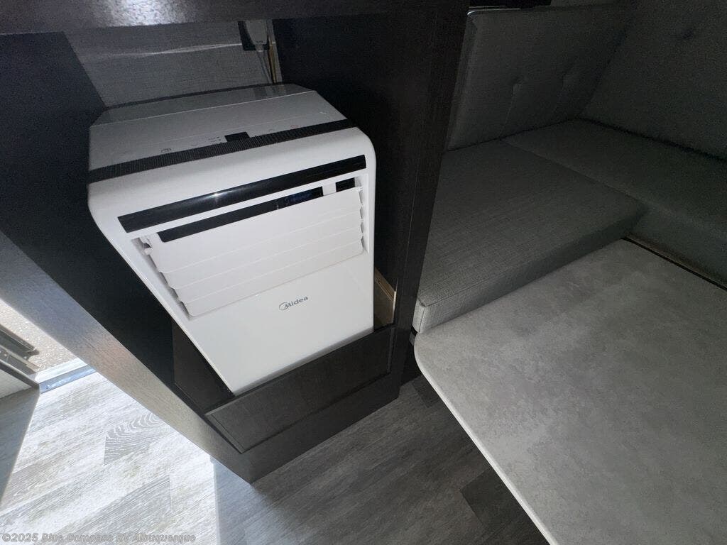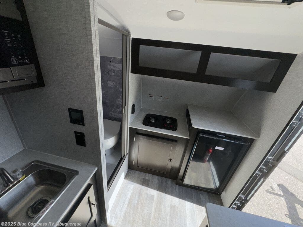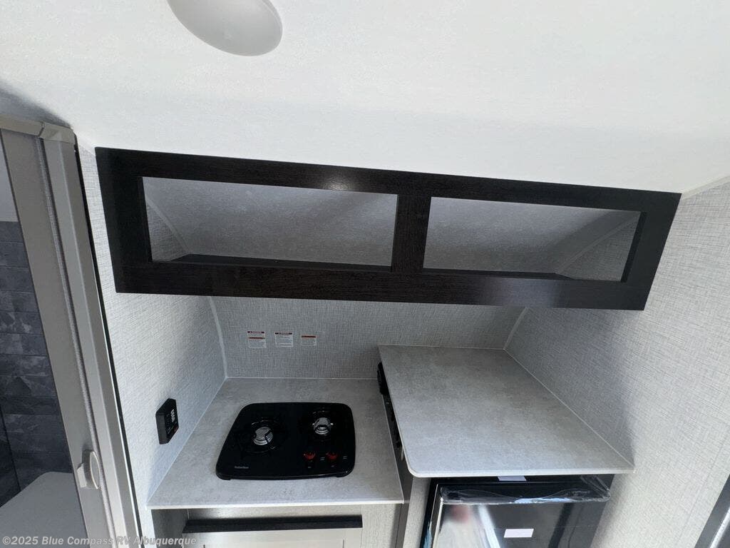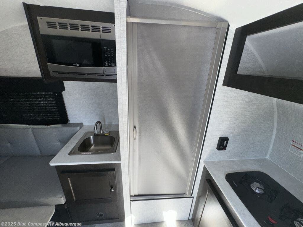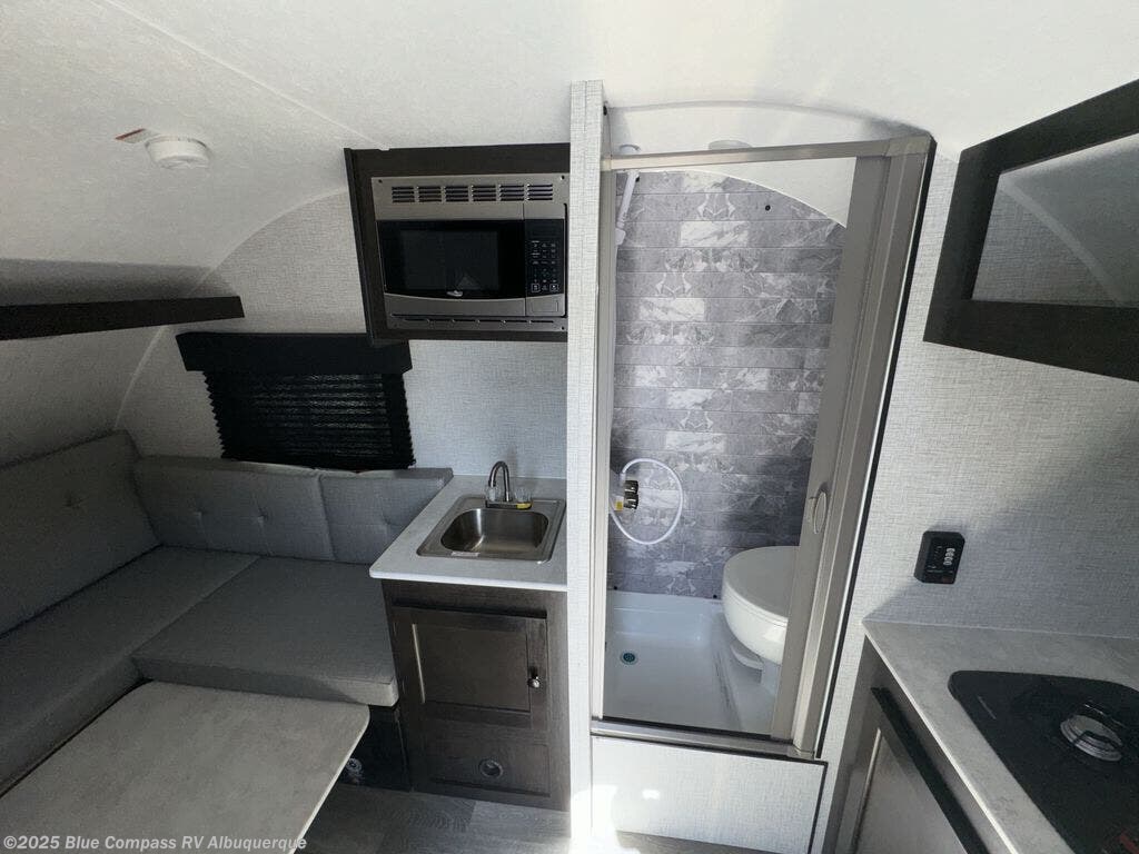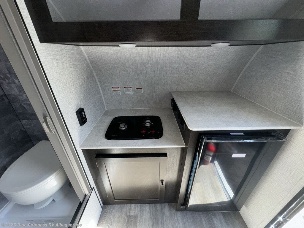 Comfort and convenience is found in this cozy trailer for two! Once you've found your campsite you can unpack your things and freshen up in the wet bath. Whip up a hearty lunch on the two burner cooktop, grab a cold drink from the 12V refrigerator, then dine around the E-Z U-shaped dinette that can also double as your sleeping space. You will find a large shelf and overhead cabinets for all your belongings, and the 9,000 BTU A/C will keep you cool during the hot summer months!
