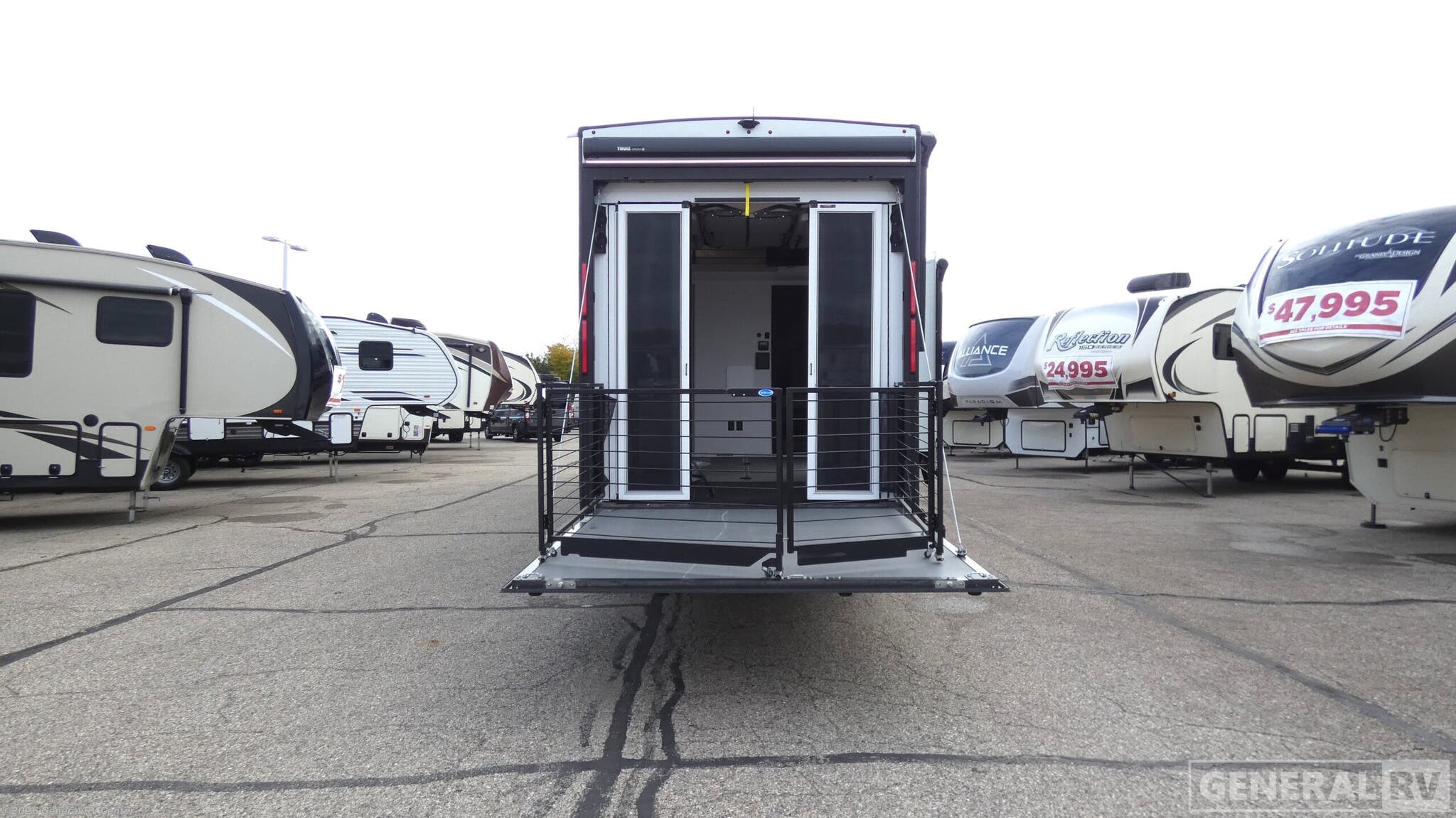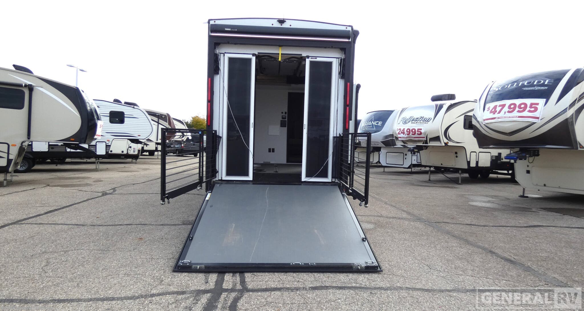 Prepare to be amazed by all the features packed into this toy hauler! There are triple slides that will provide your crew with more space, a separate garage that can sleep five with the loft included, plus a bath and a half for added convenience. The chef of your group will love the middle kitchen with a waterfall island that converts to a counter peninsula, a pull-out pantry, a GE Energy Star 19 cu. ft. refrigerator with ice and filtered water, and much more. In the combined kitchen and living space you'll find a spacious sofa with heat and massage, a fireplace, a TV, plus convenient dog bowls and shoe storage. After your toys are unloaded from the garage, you can relax on the independent dual sofas with a Fold-N-Stow table in between, and your guests can sleep on the HappijacĀ® Sofa and Bed Lift system. You will find the front private bedroom with a king bed slide out will provide a great night's rest, and you'll also find a walk-in closet, under-bed storage, and a sliding dresser top with hidden storage for special belongings. With any Model G toy hauler fifth wheel by Brinkley you will enjoy luxurious amenities, tons of storage space, and innovative features that have been developed and tested in the real world. Durable construction includes an industry leading PDI process, an industry best insulation package, and reinforced and walkable slide roofs. Some of the exterior features you'll find are a 3-way pass-through with a multi-functional flip-up bulkhead wall, under I-beam storage, a MAX-Vision reverse lighting system, and a low-maintenance roof to name a few. A Rockford Fosgate audio system comes standard, along with a OneControl app system that lets you control your fifth wheel's functions right from your mobile device. You will find the solar system with a designated storage area to be ultra convenient, plus there is a FlexPower 5500 with a dual fuel inverter generator for all your power needs. Head inside to find a residential interior with Brinkley's CraftSense wood trim construction, floating entrance steps, integrated window screens and insulated blackout blinds, and residential solid surface countertops plus backsplash. You will also enjoy the neon shower lighting and recessed medicine cabinets in the bath, plus motion activated LED bed lights and dual bedside outlets in the bedroom. Choose a Model G toy hauler fifth wheel to experience all the luxury it has to offer!