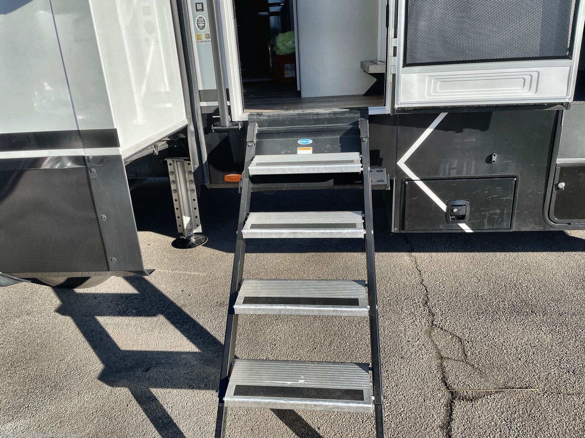 Prepare to be amazed by all the features packed into this toy hauler! There are triple slides that will provide your crew with more space, a separate garage that can sleep five with the loft included, plus a bath and a half for added convenience. The chef of your group will love the middle kitchen with a waterfall island that converts to a counter peninsula, a pull-out pantry, a GE Energy Star 19 cu. ft. refrigerator with ice and filtered water, and much more. In the combined kitchen and living space you'll find a spacious sofa with heat and massage, a fireplace, a TV, plus convenient dog bowls and shoe storage. After your toys are unloaded from the garage, you can relax on the independent dual sofas with a Fold-N-Stow table in between, and your guests can sleep on the HappijacĀ® Sofa and Bed Lift system. You will find the front private bedroom with a king bed slide out will provide a great night's rest, and you'll also find a walk-in closet, under-bed storage, and a sliding dresser top with hidden storage for special belongings.
